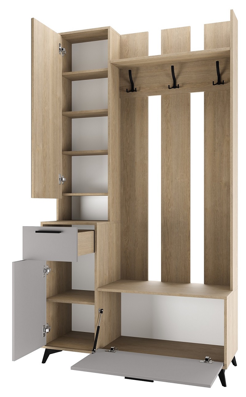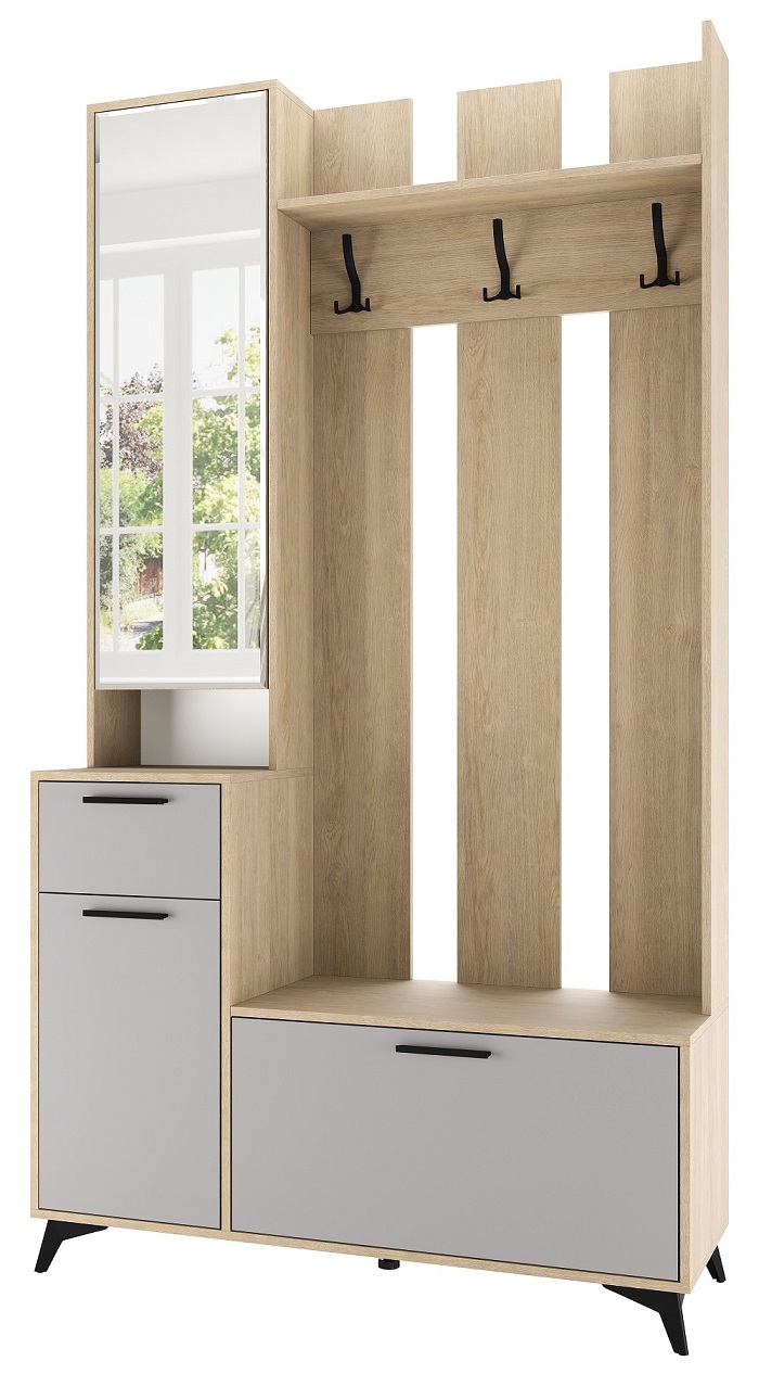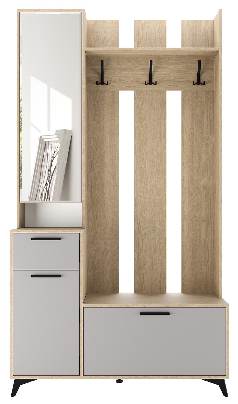 Модуль универсальный 1200 «ЕВА» с ящиком на направляющих скрытого монтажа с доводчиками. Фасады, лицевой периметр модуля обработаны кромкой 1 мм. Зеркало с обработкой «фацет» по периметру. Чёрные металлические ручки, крючки и ножки-опоры.