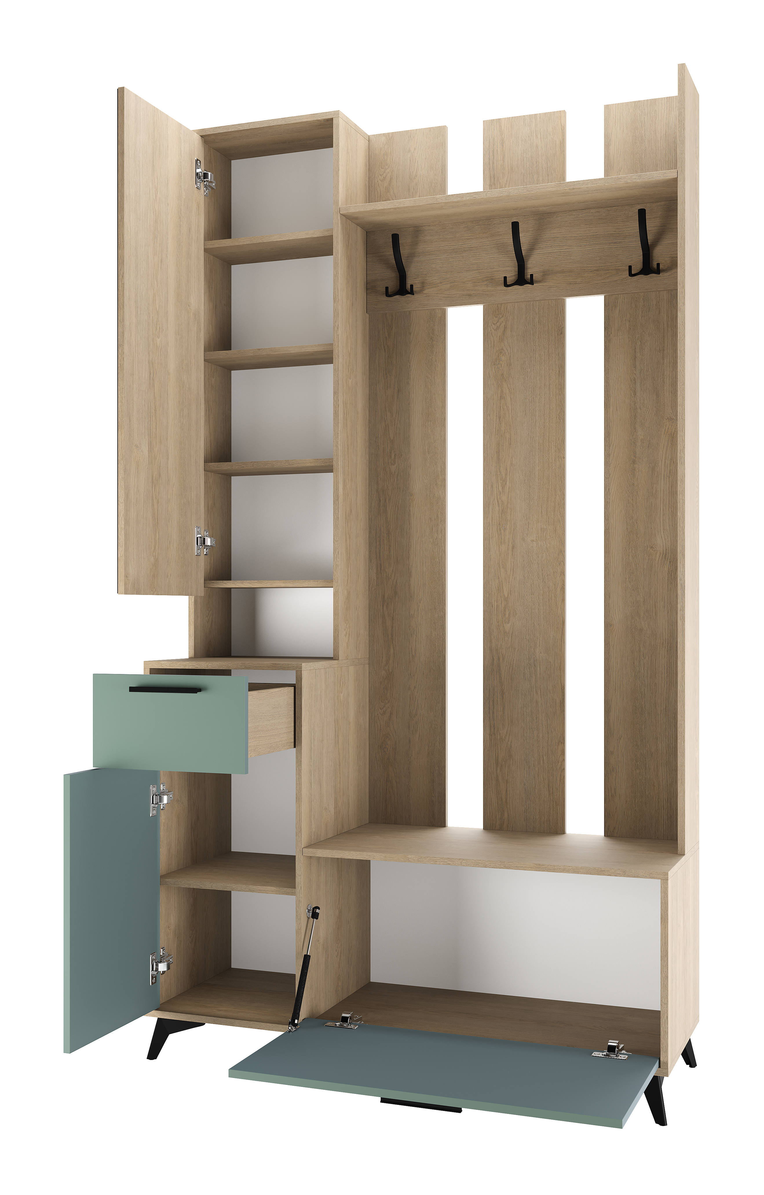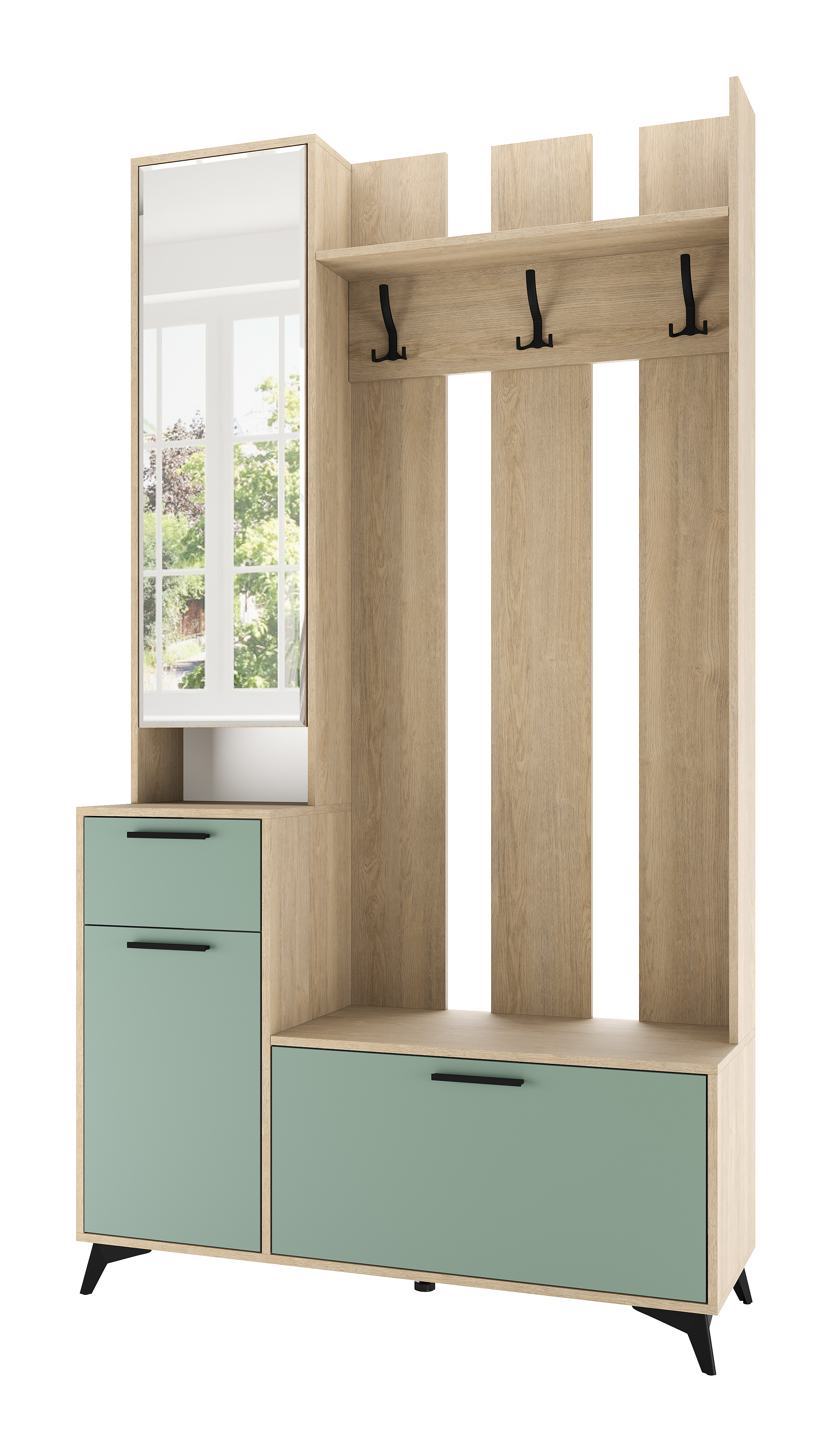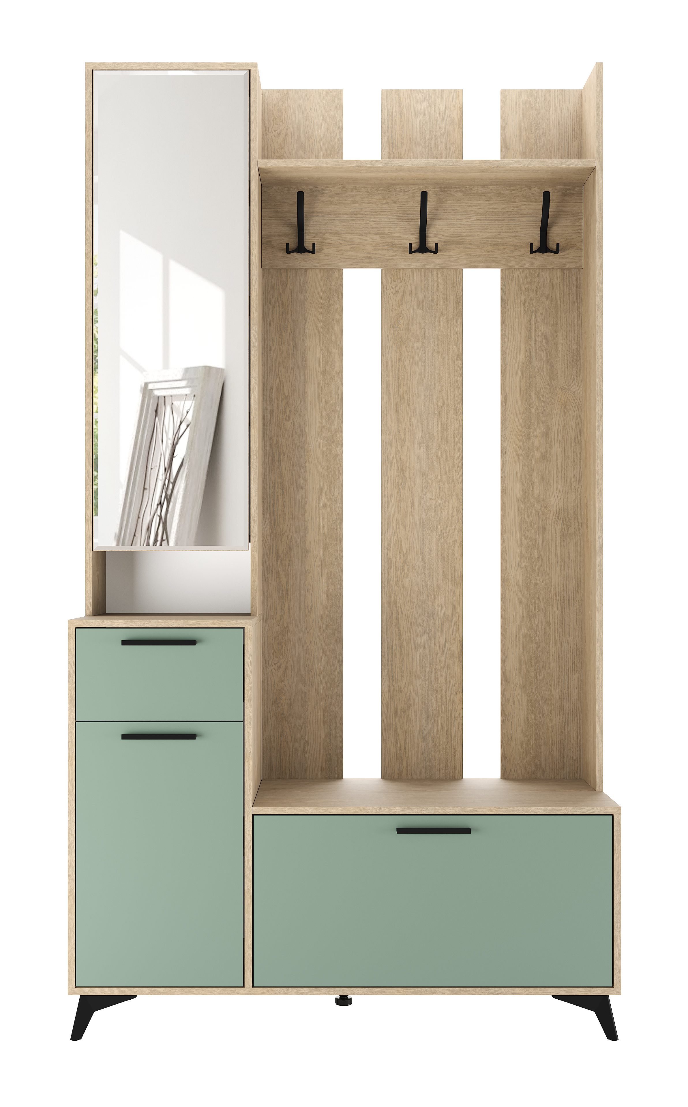 Модуль универсальный 1200 «ЕВА» с ящиком на направляющих скрытого монтажа с доводчиками. Фасады, лицевой периметр модуля обработаны кромкой 1 мм. Зеркало с обработкой «фацет» по периметру. Чёрные металлические ручки, крючки и ножки-опоры.
