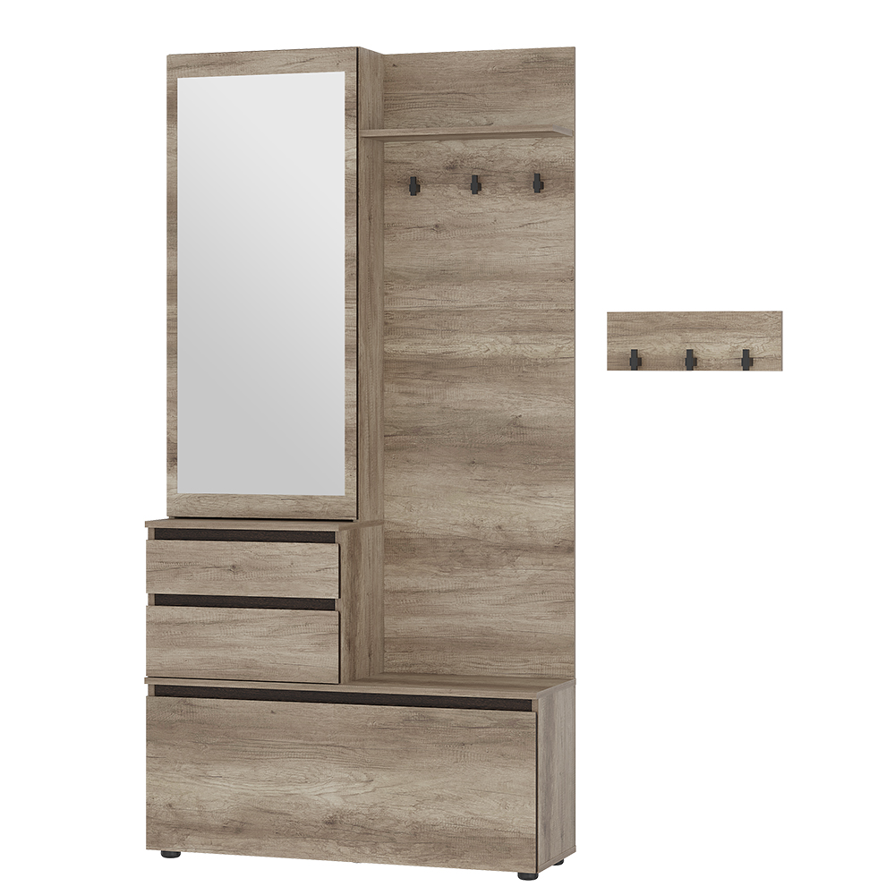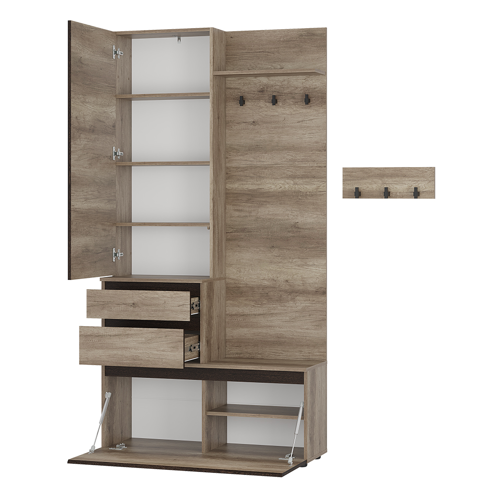 «Энигма» — лучший выбор для небольшой прихожей. Модель оснащена зеркалом, вместительными ящиками для мелочей и аксессуаров, а также просторным отсеком с дверцей для обуви. Верхнюю одежду можно разместить в отдельной зоне. Для головных уборов в прихожей также предусмотрена специальная полка. Ключница в комплекте.