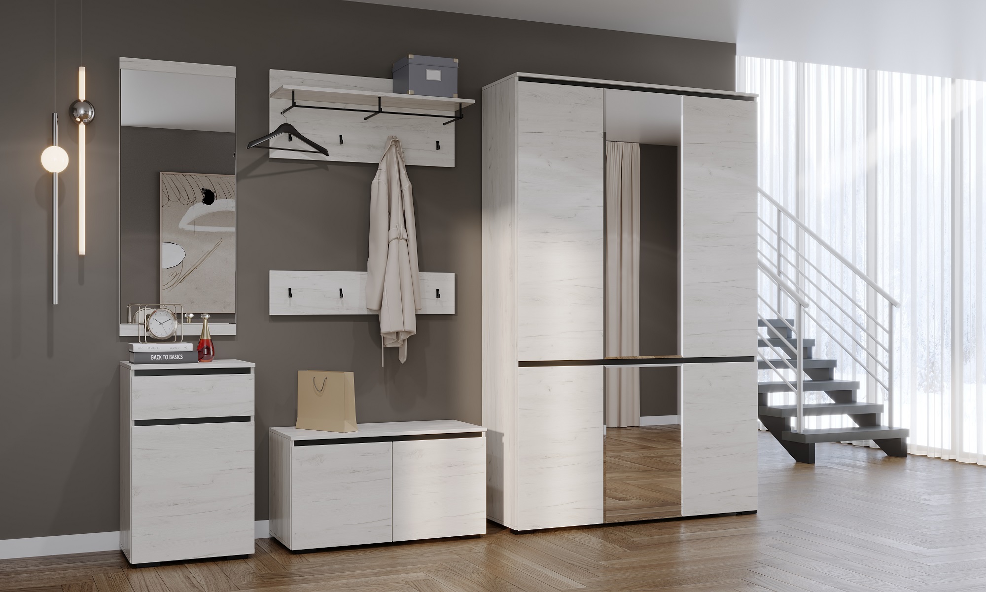 В коллекцию вошли модульная гостиная, прихожая и программа для детской. Наличие множества элементов, созданных для применения в быту, удобных для размещения предметов интерьера, одежды и вещей, делают коллекцию мебели «ГРЕТТА» универсальной и желанной в любом доме.