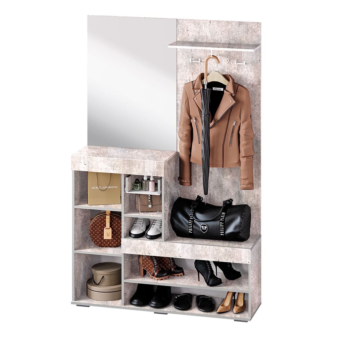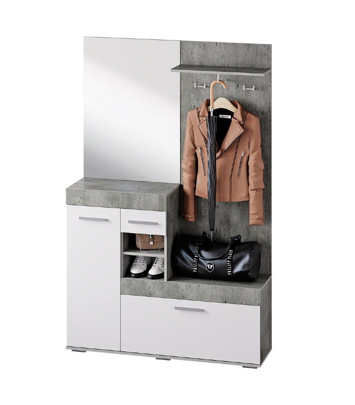 Прихожая «Инстайл» - воплощение стиля и функциональности. Неровная структура бетона холодного оттенка гармонично сочетается с белыми глянцевыми фасадами, благодаря чему мебель вписывается в любой современный интерьер. Кроме визуальной составляющей важно отметить и практичность данной модели. Закрытые секции и открытые ниши c вешалкой позволят Вам хранить верхнюю одежду, головные уборы, обувь, аксессуары в целости и соблюдать порядок во входной зоне.