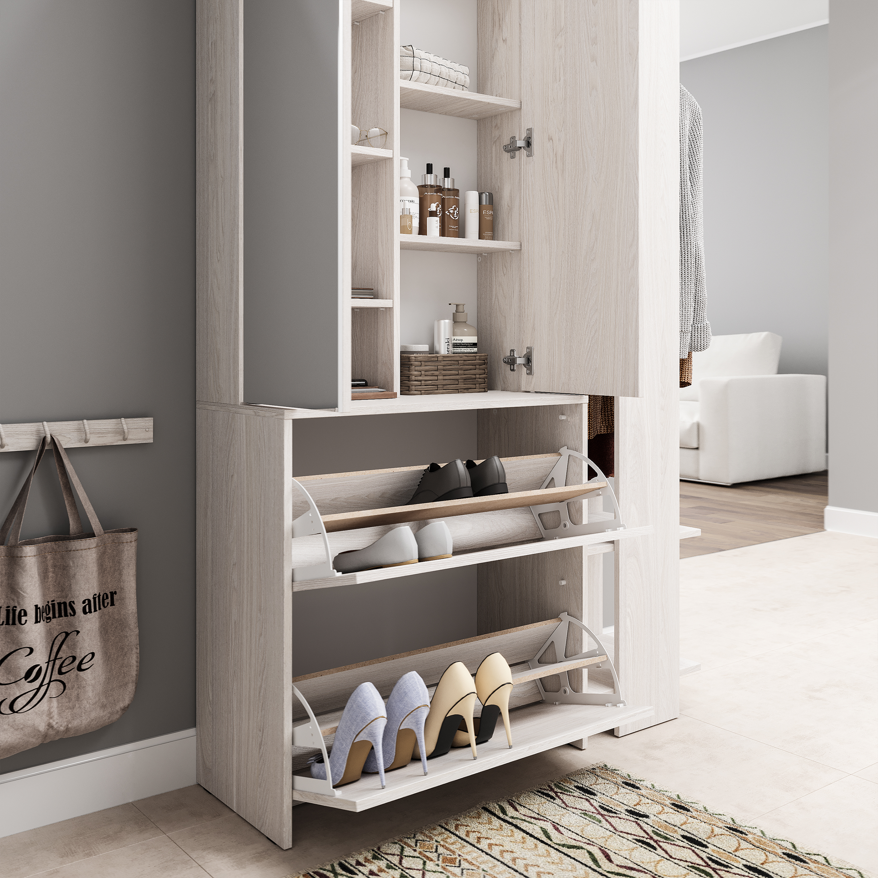 Фасад обувницы выполняет функцию ручки.