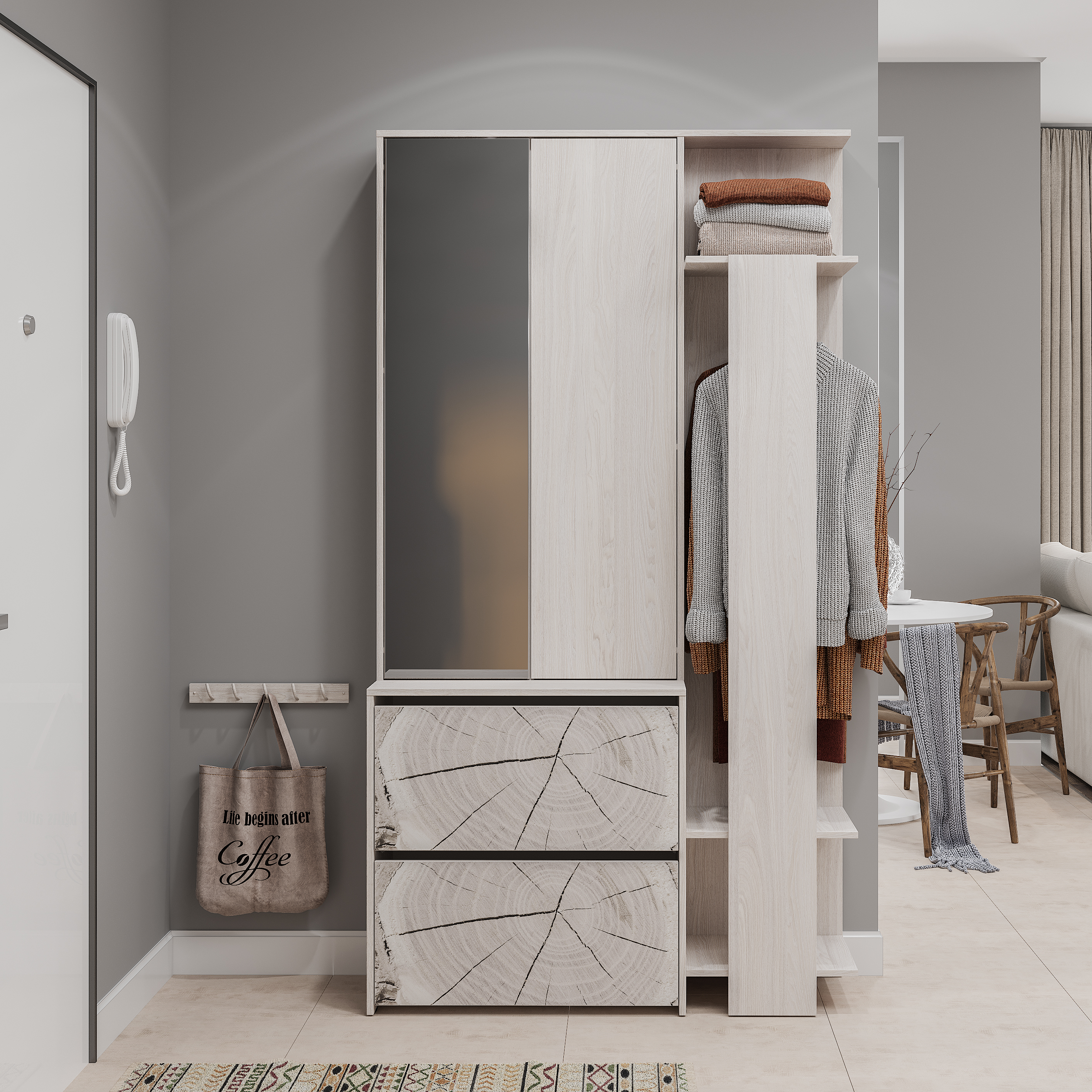 Прихожая «Россо» - модель, созданная для тех, кто ценит многофункциональность. «Россо» объединяет в себе все необходимые элементы прихожей: светлый цвет корпуса огранично дополняет фасад с фотопечатью, имитирующей спил дерева.