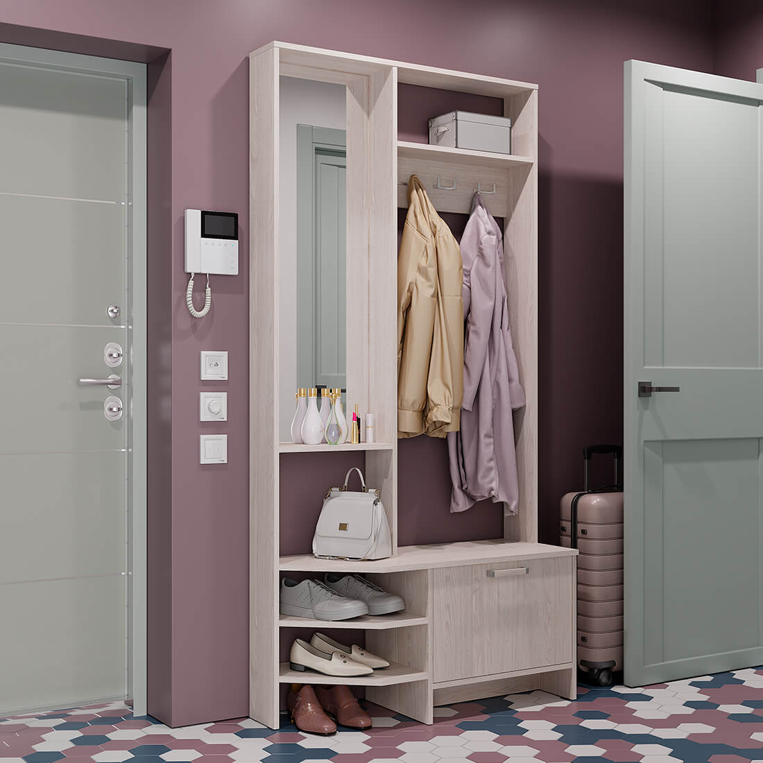 Компактная прихожая Тео – готовое решение для современной малогабаритной прихожей. Здесь есть все составляющие – зеркало с полкой для разных полезных мелочей, верхняя полка для головных уборов, просторная зона с крючками для верхней одежды, нижние открытые и закрытые полки, в которых можно хранить сезонную обувь. Регулируемые опоры позволяют установить прихожую на любой неровной поверхности. Высокое качество по приятной цене — это прихожая Тео.