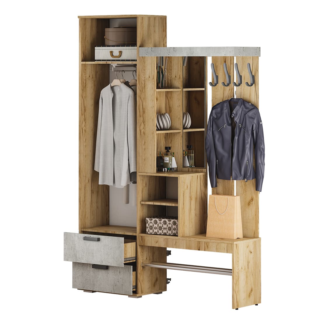 Идеальный выбор для современного интерьера, особенно в стиле «лофт», – это прихожая «Трамп». Модель выполнена из ЛДСП двух цветов – «крафт» и «бетон», изделие имеет все необходимые зоны для размещения вещей в прихожей: крючки для верхней одежды, открытые и закрытые ниши, шкаф с выдвижной штангой и зону для хранения обуви.