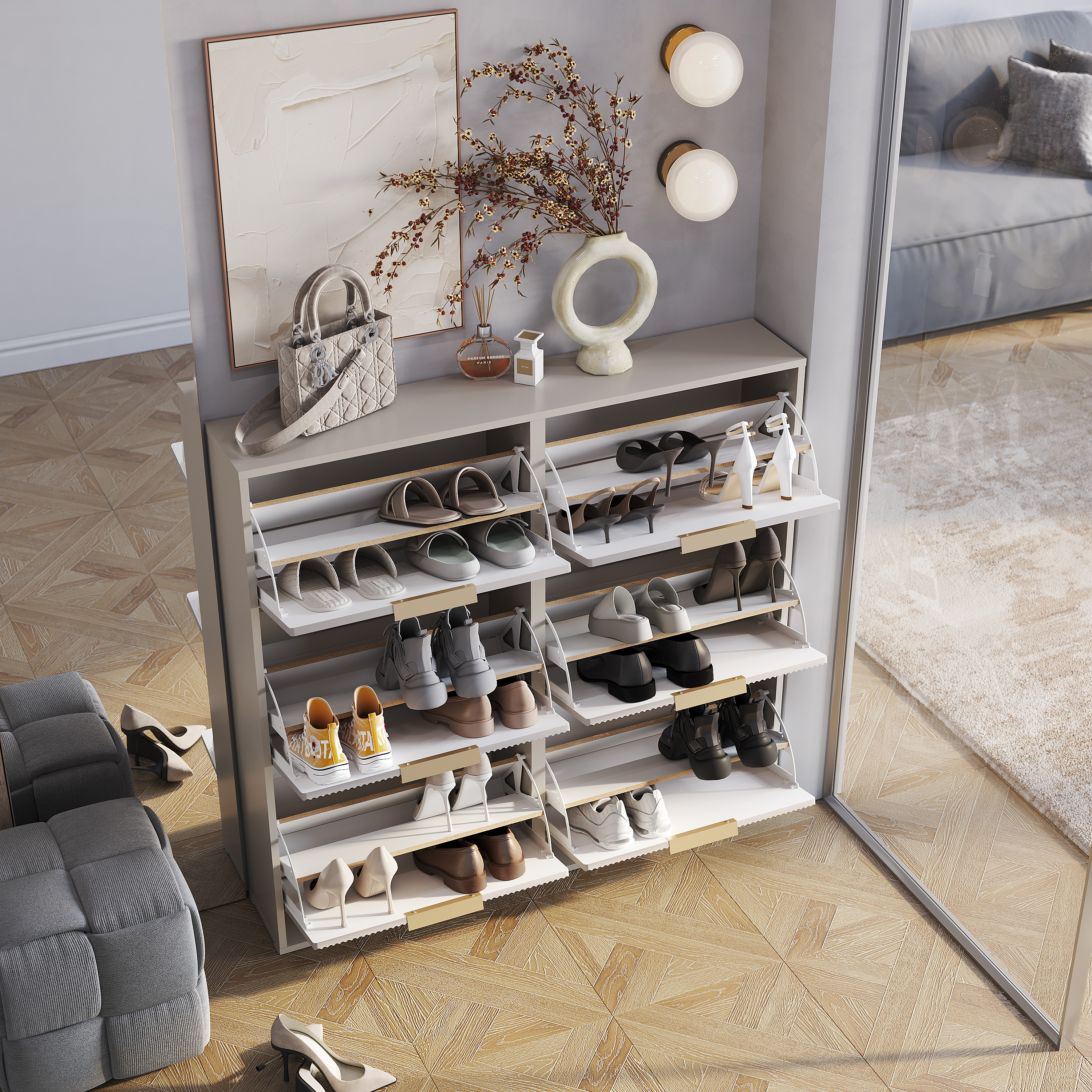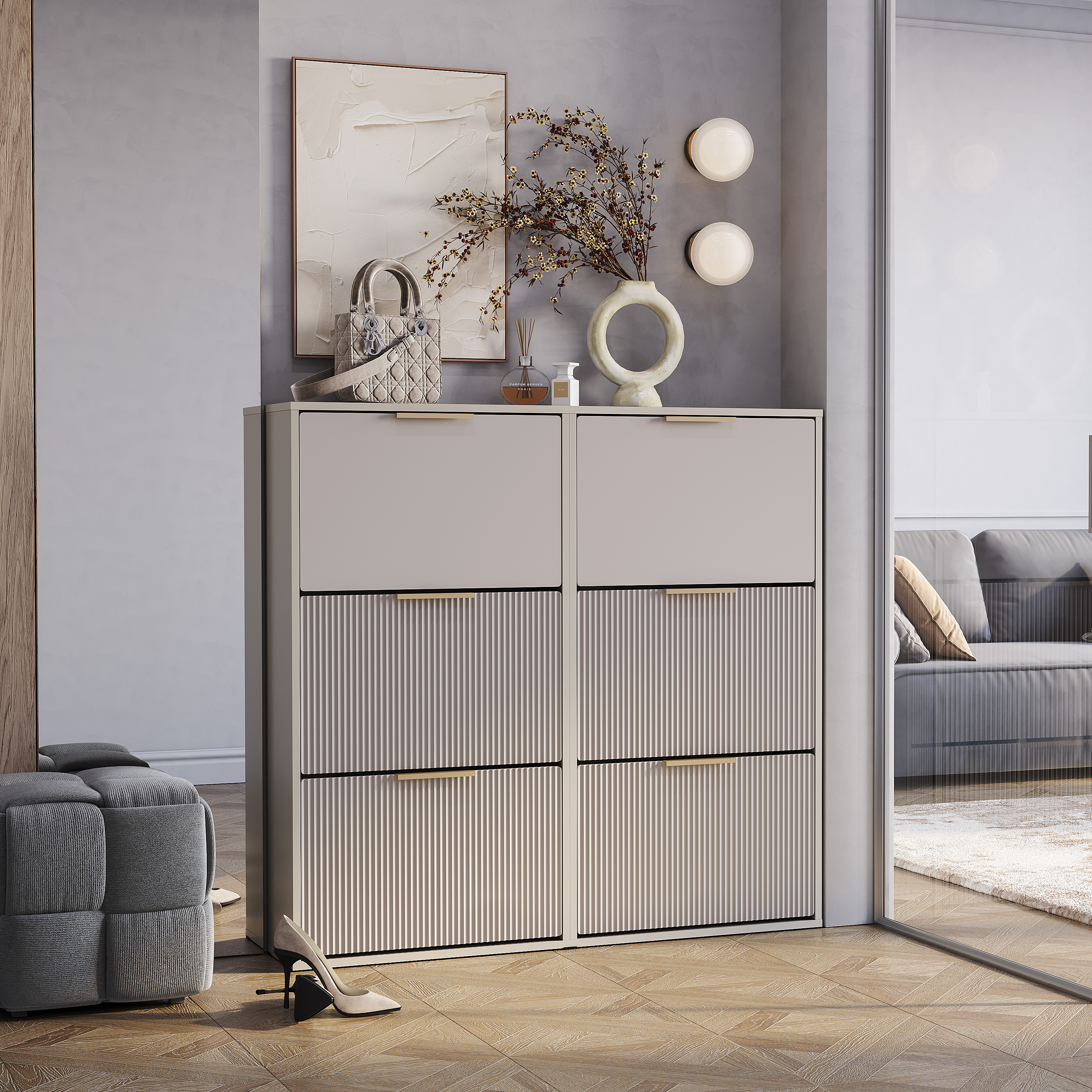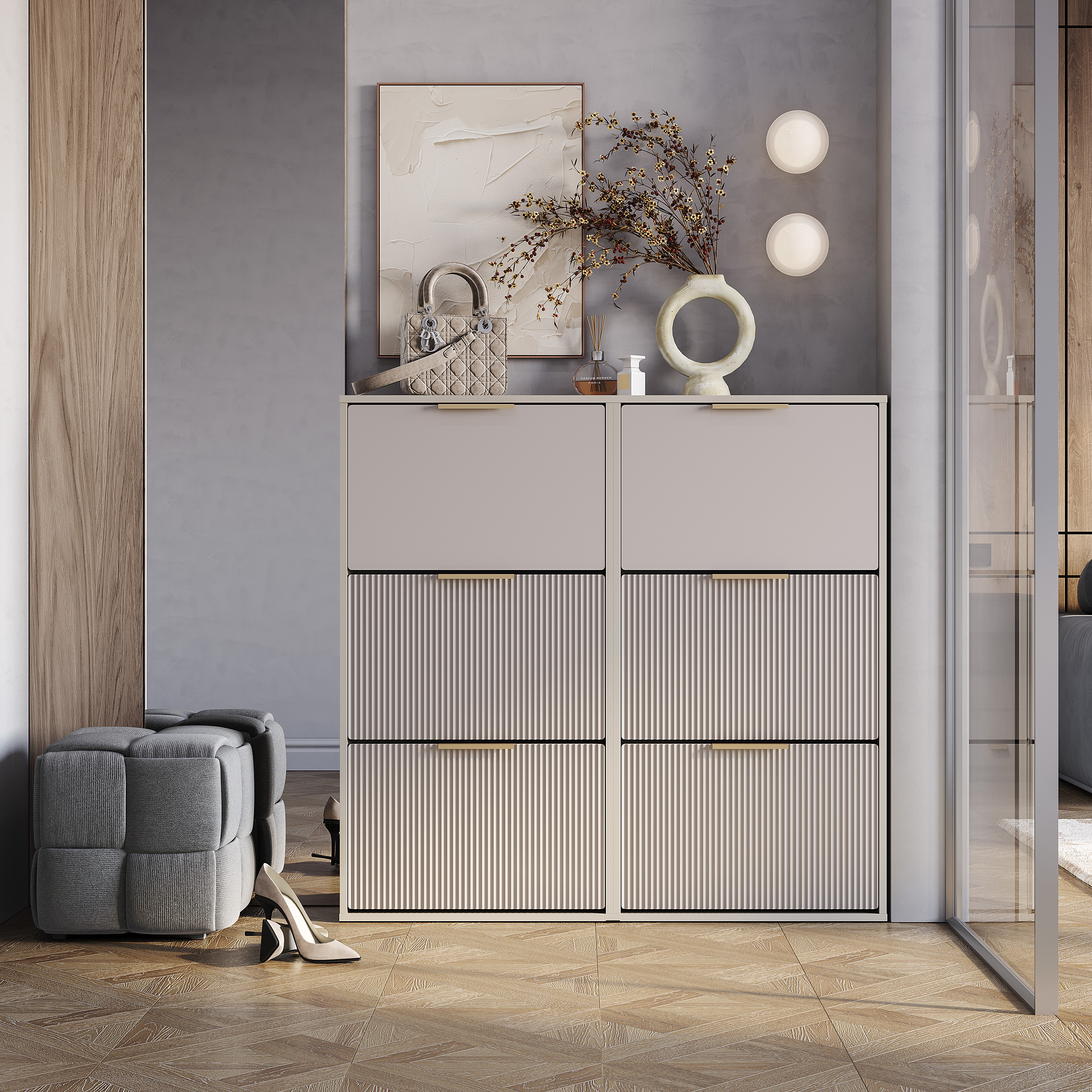 Удобная и стильная обувница «Пандора» может стать незаменимой частью вашей прихожей. Трендовые МДФ-фасады с декоративной вертикальной фрезеровкой – продолжение индивидуальности коллекции.