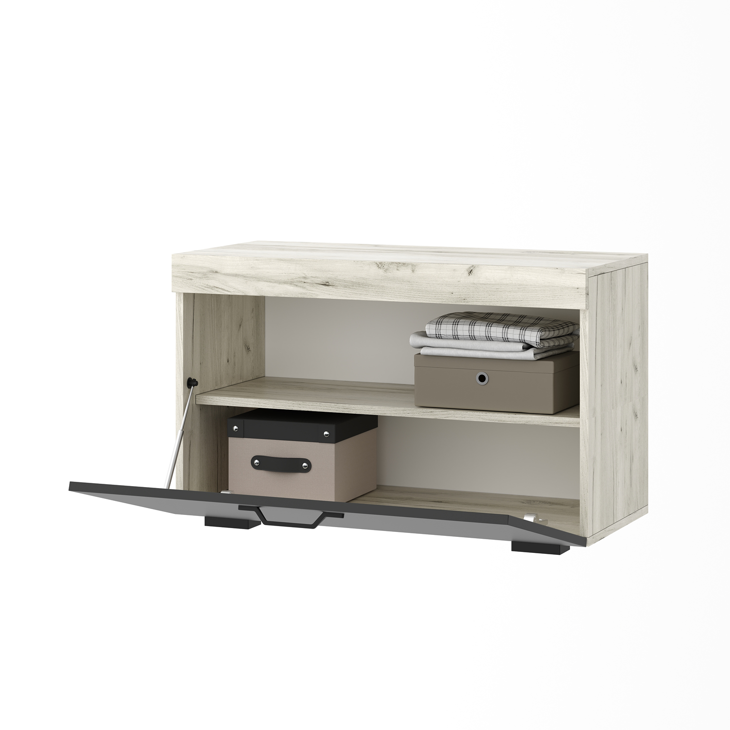 Обувница «СОНАТА» ОС-800 с откидным фасадом на газлифте, с полкой. Устанавливается стильная металлическая ручка, чёрная, матовая. Верхняя часть тумбы обрамлёна профилем MDF.