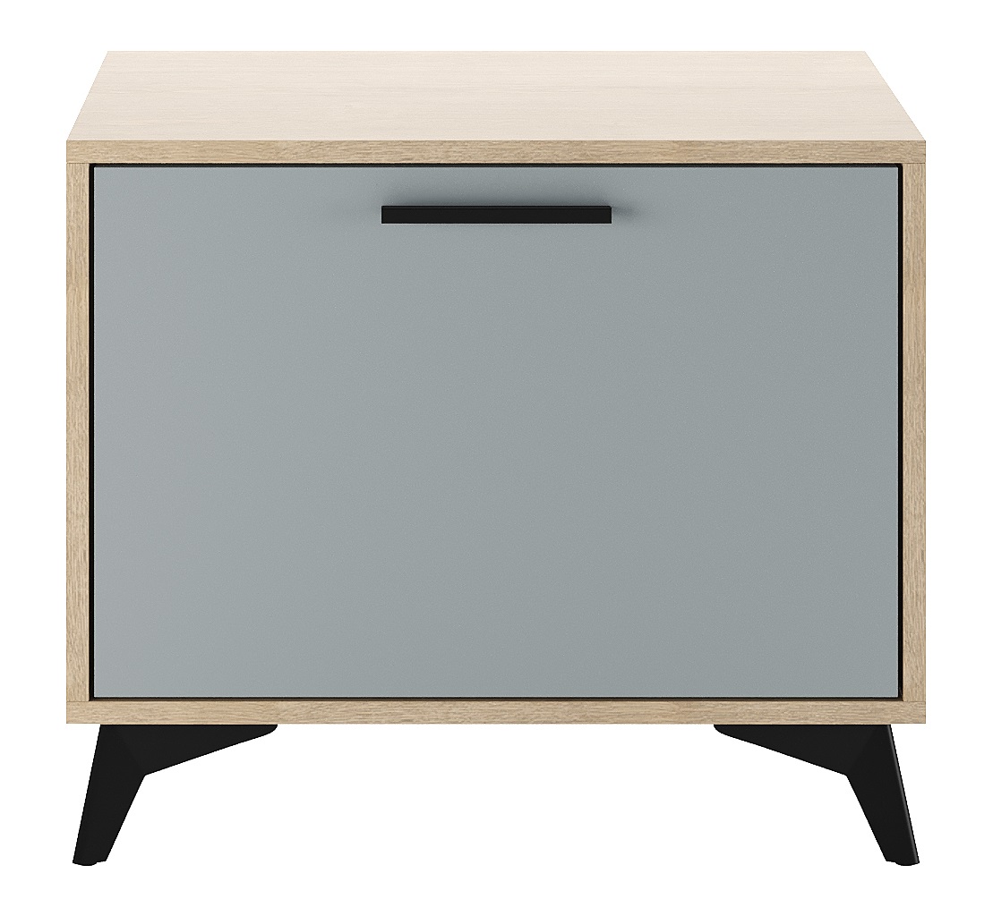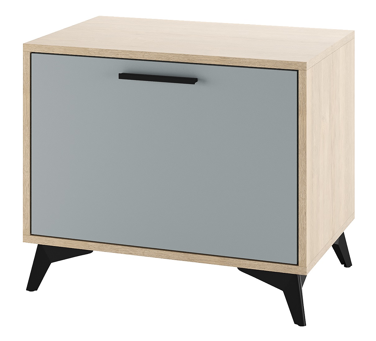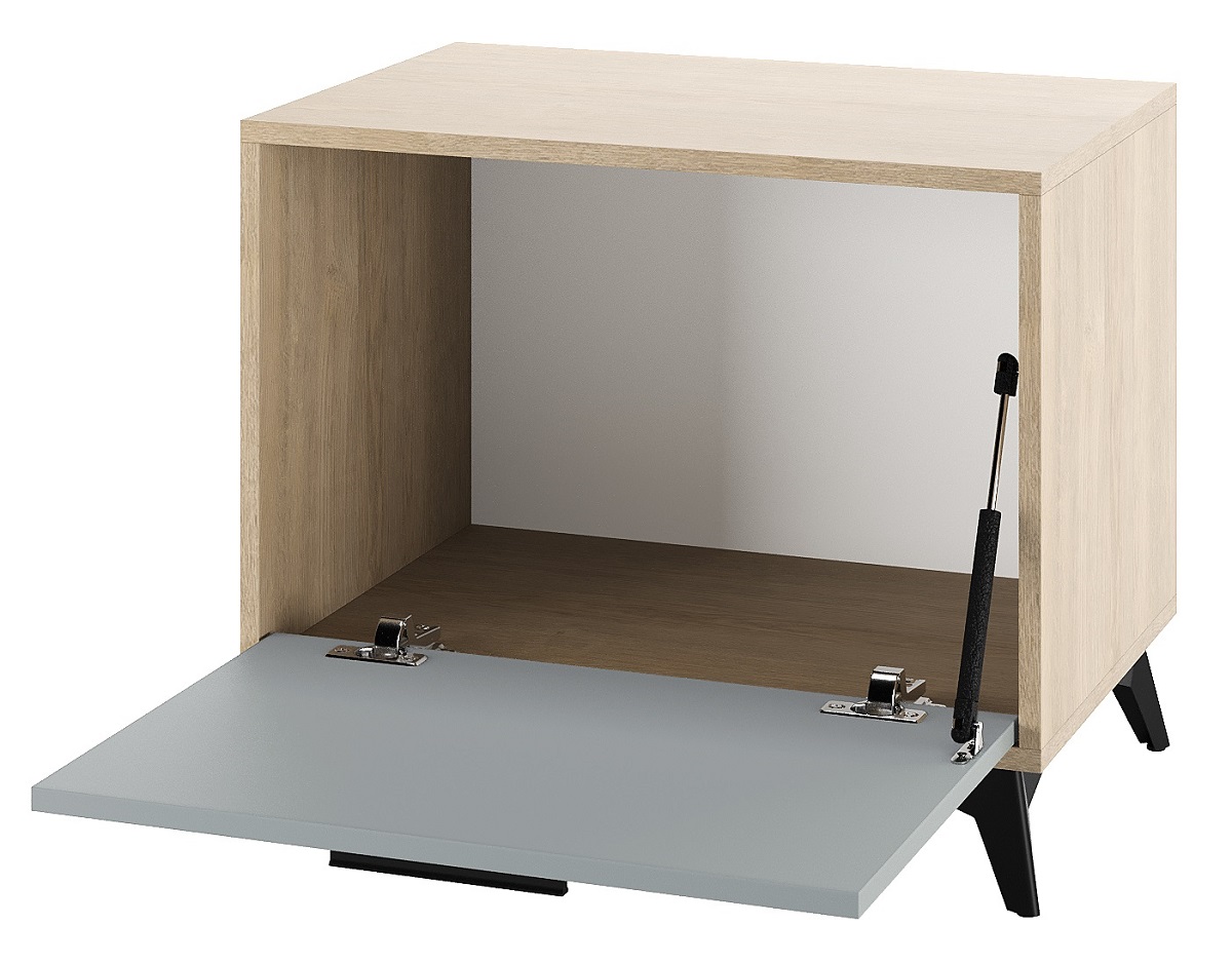 Тумба 600 1С «ЕВА» с откидным фасадом (газлифт). Фасад, крышка и лицевой периметр тумбы обработаны кромкой 1 мм. Чёрная металлическая ручка и ножки-опоры.