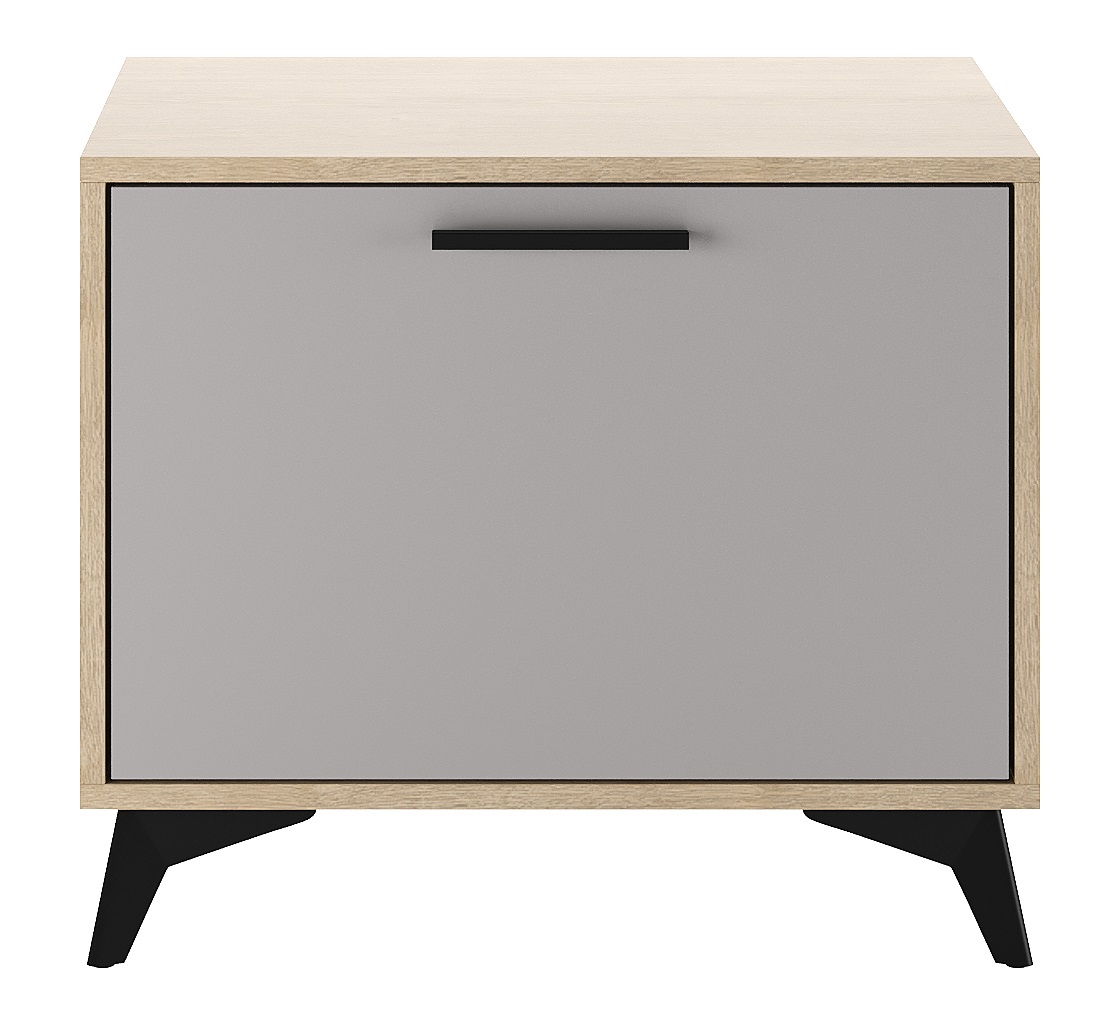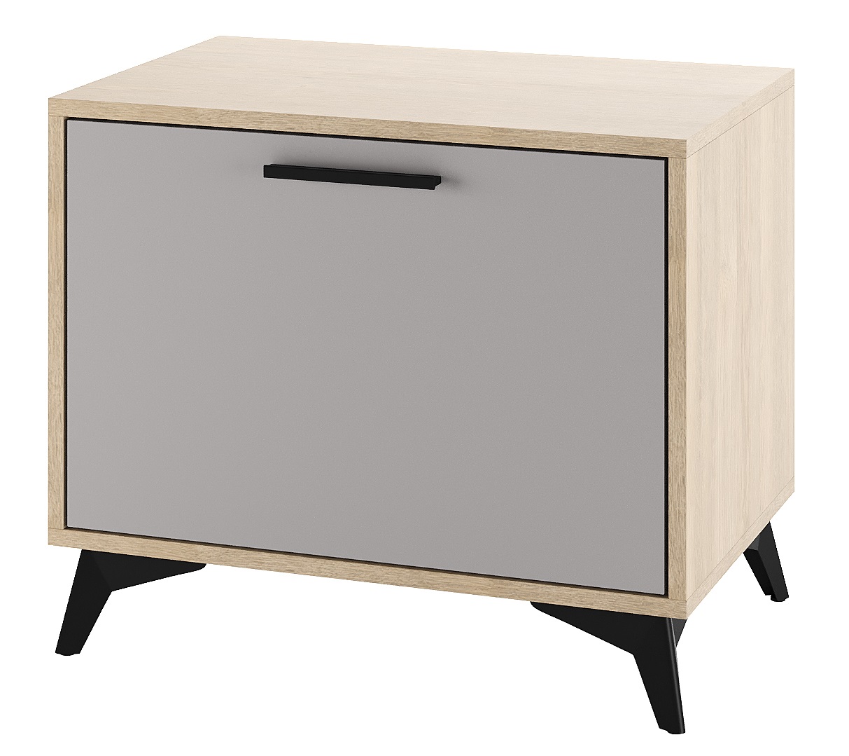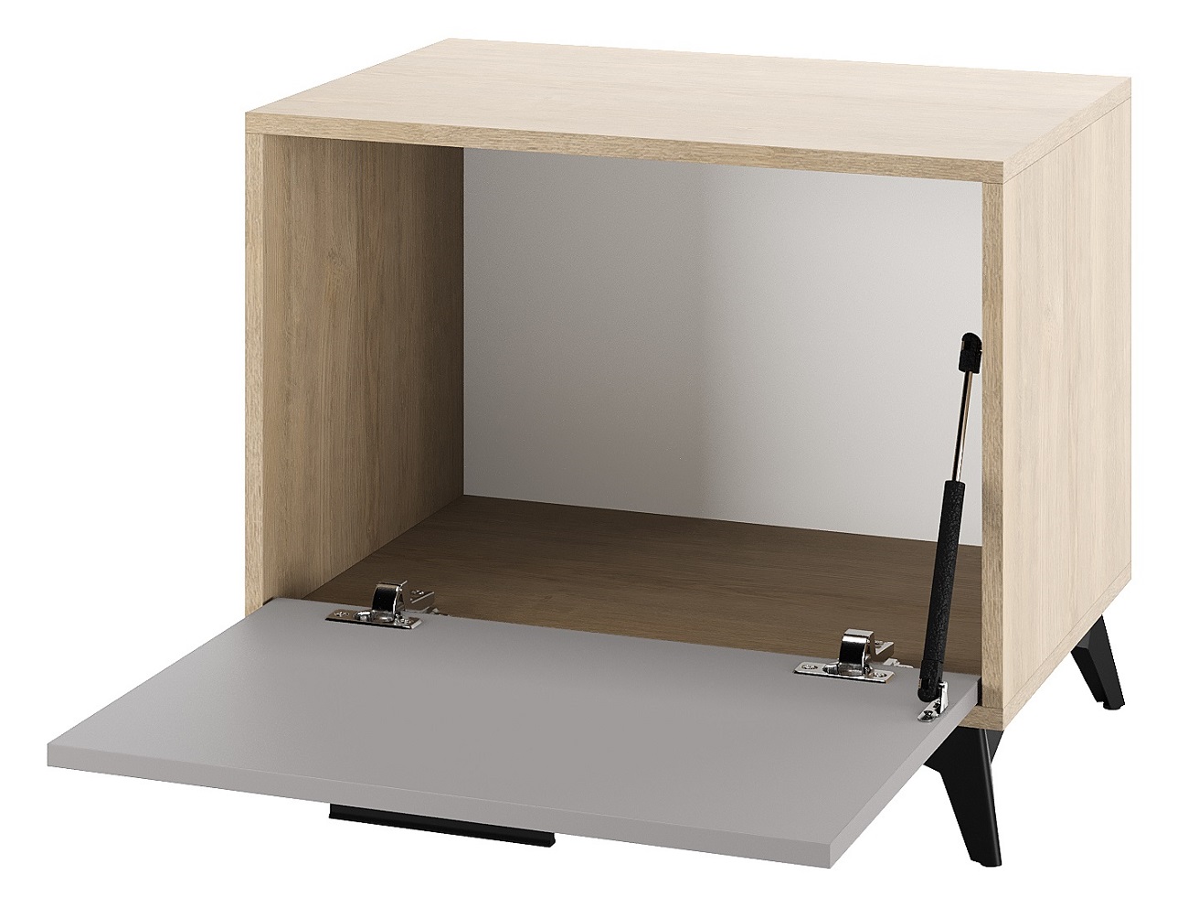 Тумба 600 1С «ЕВА» с откидным фасадом (газлифт). Фасад, крышка и лицевой периметр тумбы обработаны кромкой 1 мм. Чёрная металлическая ручка и ножки-опоры.