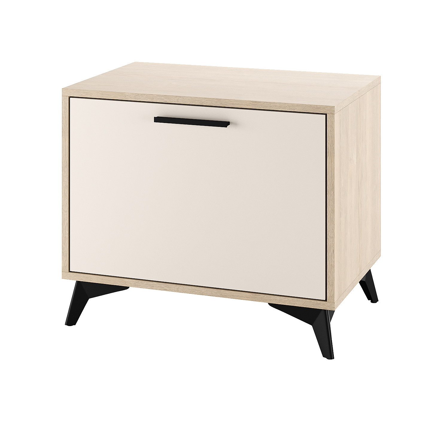 Тумба 600 1С «ЕВА» с откидным фасадом (газлифт). Фасад, крышка и лицевой периметр тумбы обработаны кромкой 1 мм. Чёрная металлическая ручка и ножки-опоры.