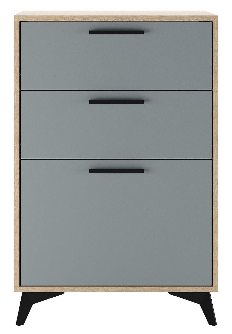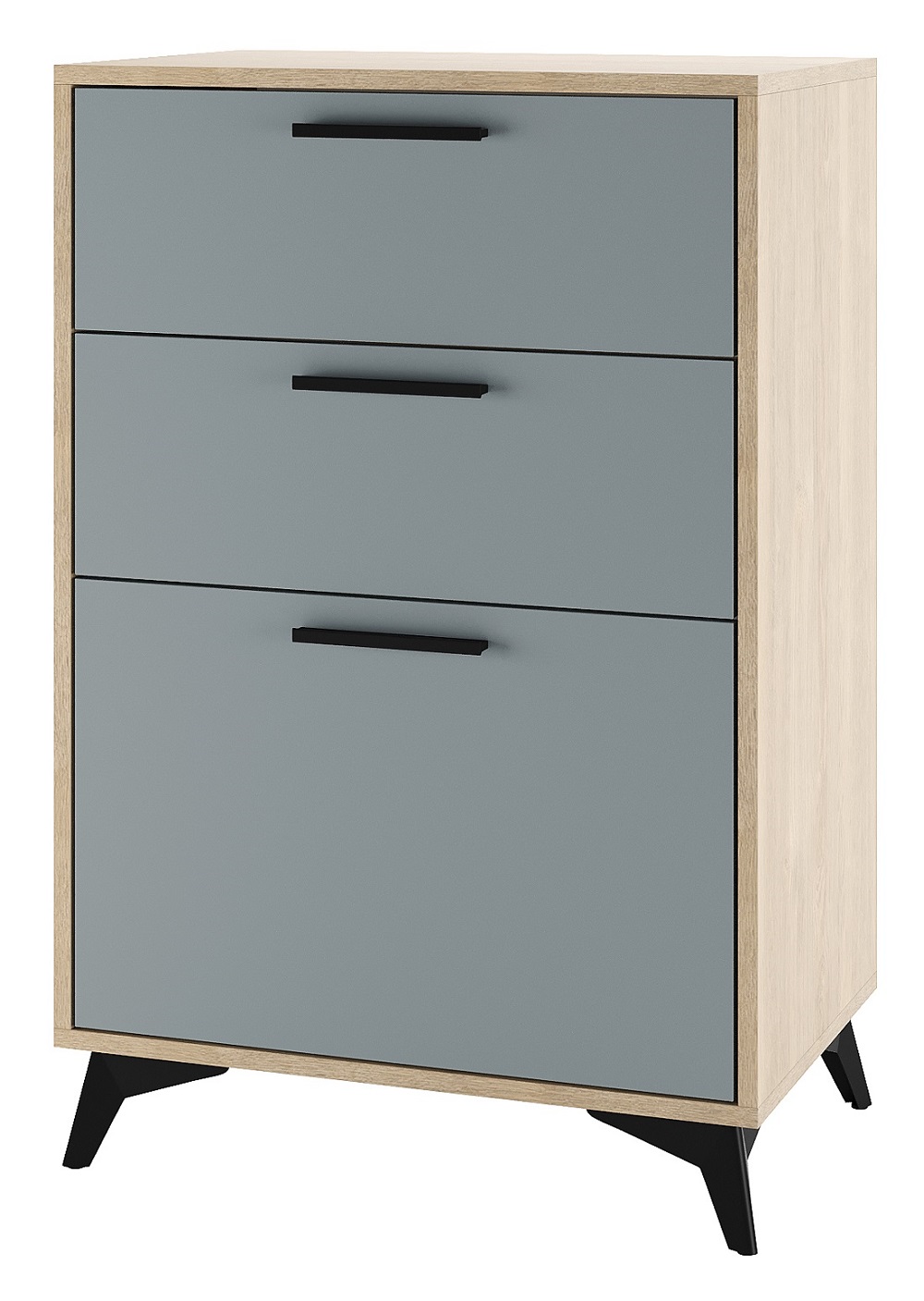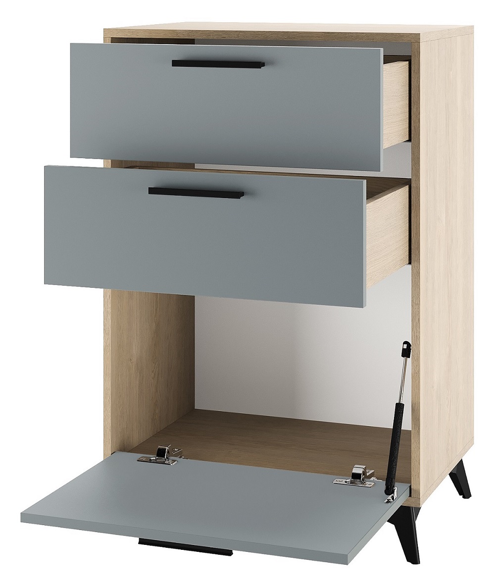 Тумба 600 1С2Я «ЕВА» с откидным фасадом (газлифт), с ящиками на направляющих скрытого монтажа с доводчиками. Фасады, крышка и лицевой периметр тумбы обработаны кромкой 1 мм. Чёрные металлические ручки и ножки-опоры.