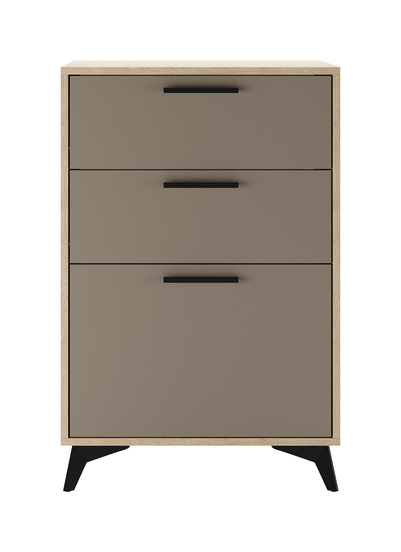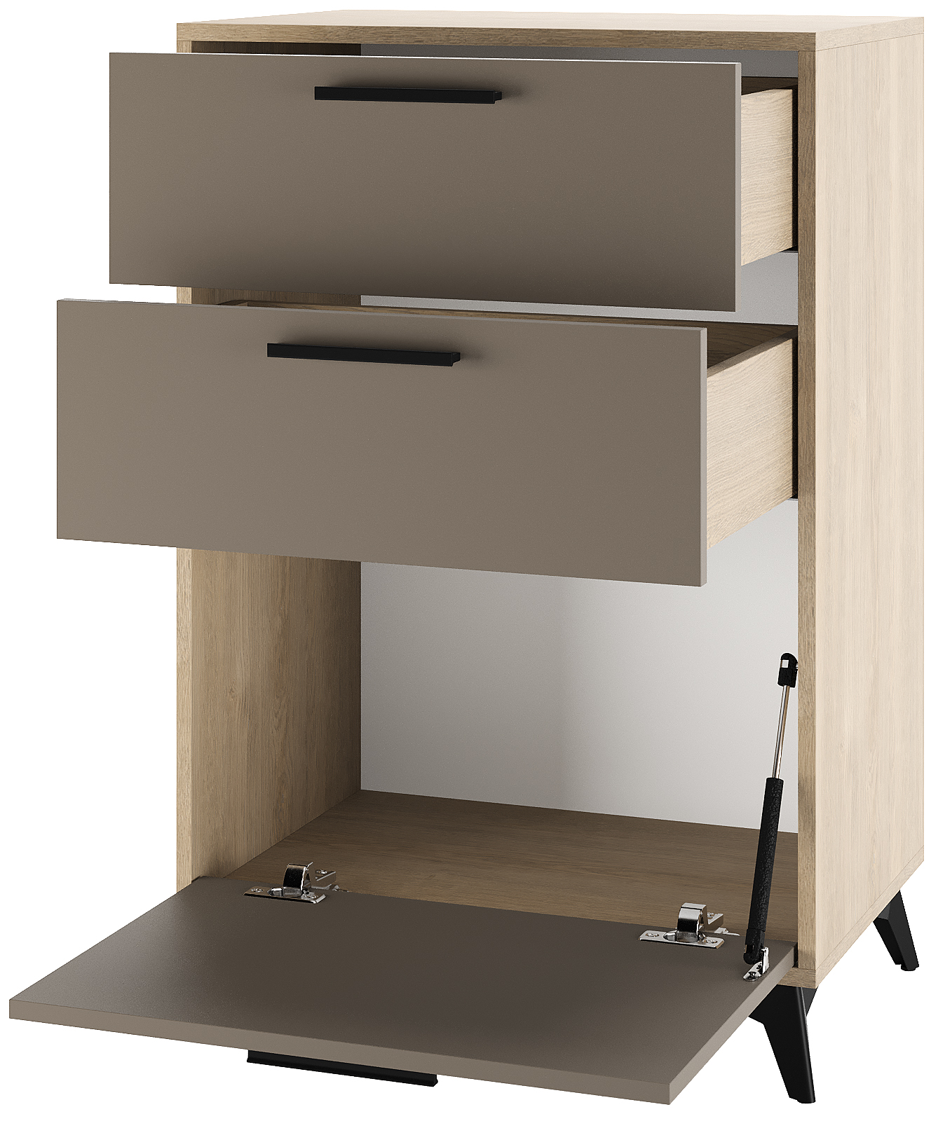 Тумба 600 1С2Я «ЕВА» с откидным фасадом (газлифт), с ящиками на направляющих скрытого монтажа с доводчиками. Фасады, крышка и лицевой периметр тумбы обработаны кромкой 1 мм. Чёрные металлические ручки и ножки-опоры.