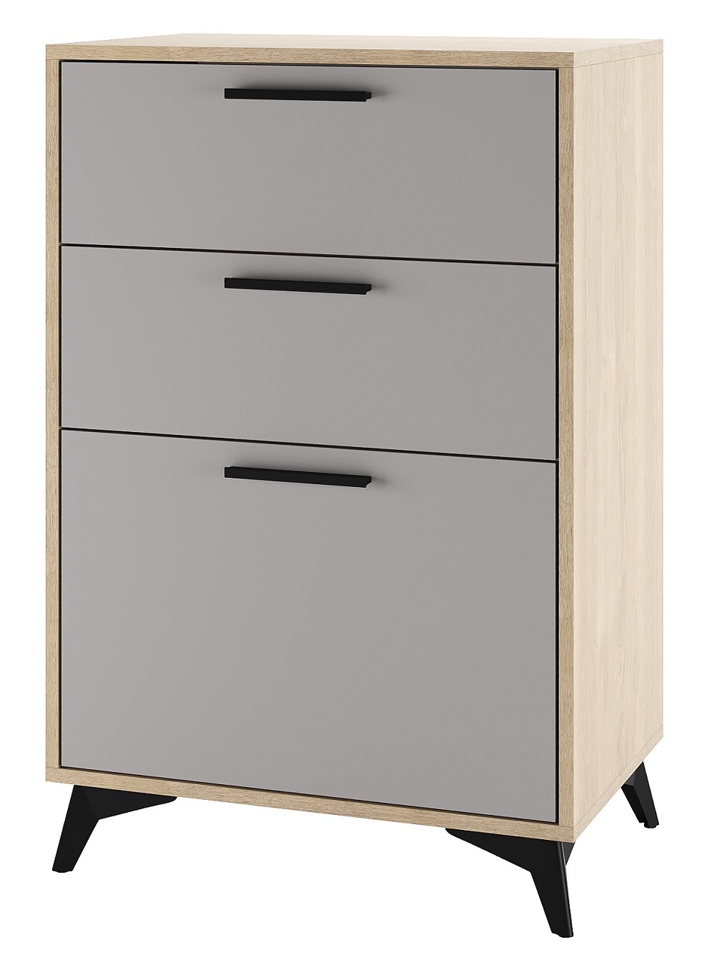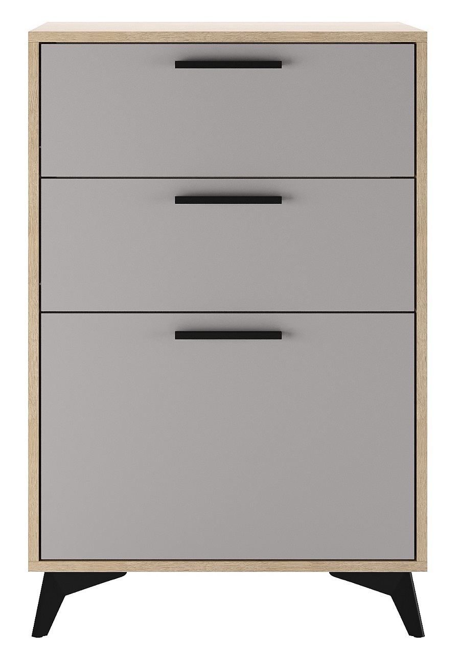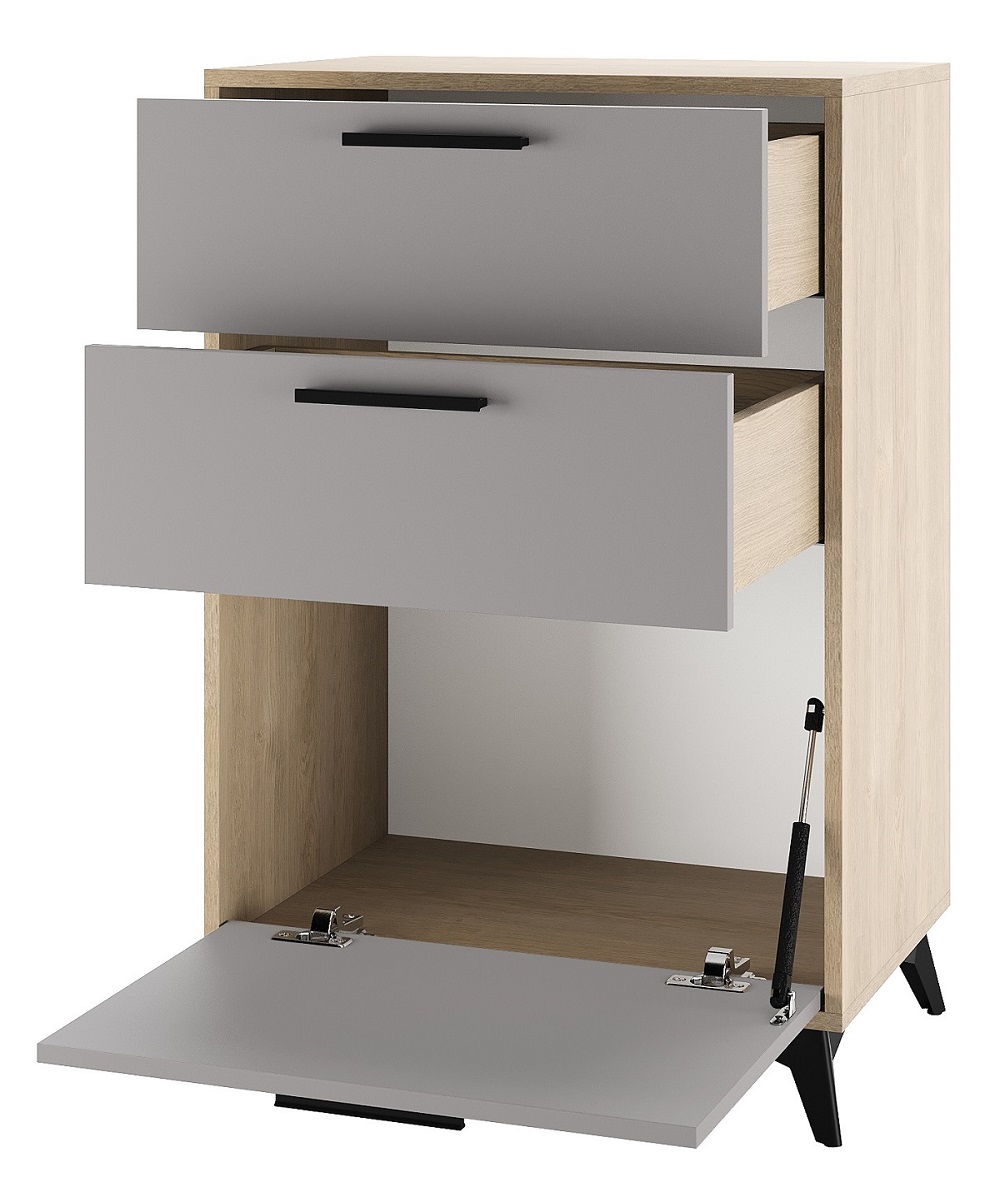 Тумба 600 1С2Я «ЕВА» с откидным фасадом (газлифт), с ящиками на направляющих скрытого монтажа с доводчиками. Фасады, крышка и лицевой периметр тумбы обработаны кромкой 1 мм. Чёрные металлические ручки и ножки-опоры.