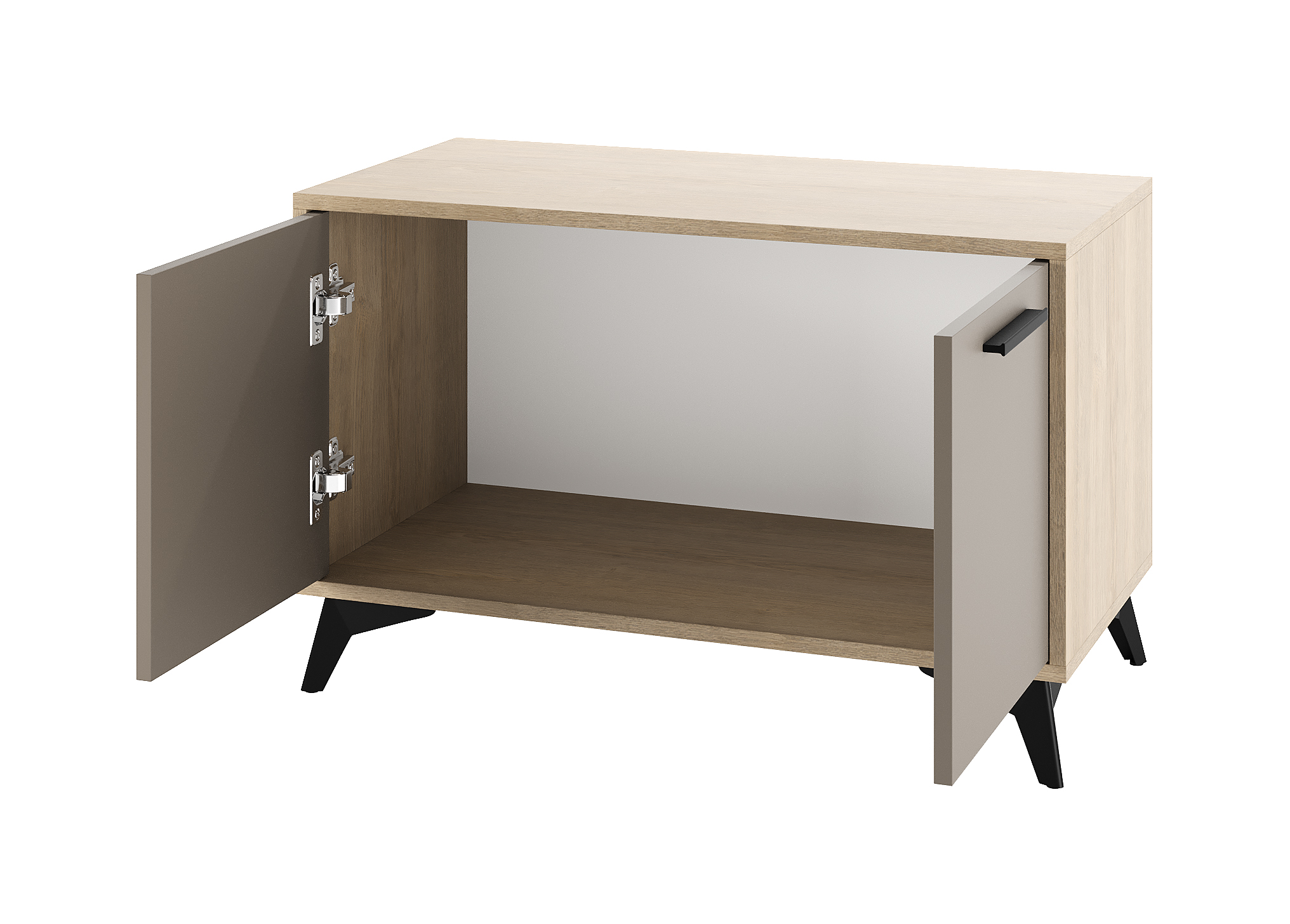 Тумба 800 2С «ЕВА» с распашными фасадами. Фасады, крышка и лицевой периметр тумбы обработаны кромкой 1 мм. Чёрные металлические ручки и ножки-опоры.