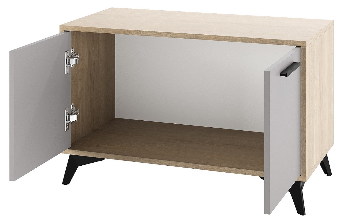 Тумба 800 2С «ЕВА» с распашными фасадами. Фасады, крышка и лицевой периметр тумбы обработаны кромкой 1 мм. Чёрные металлические ручки и ножки-опоры.