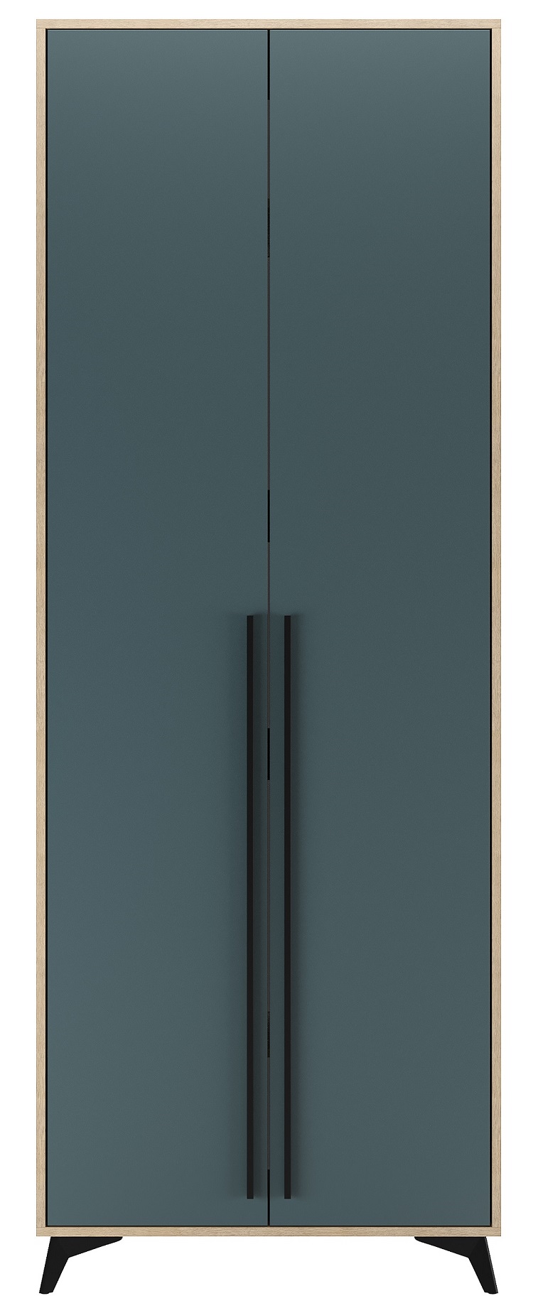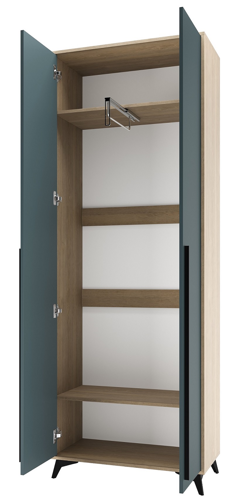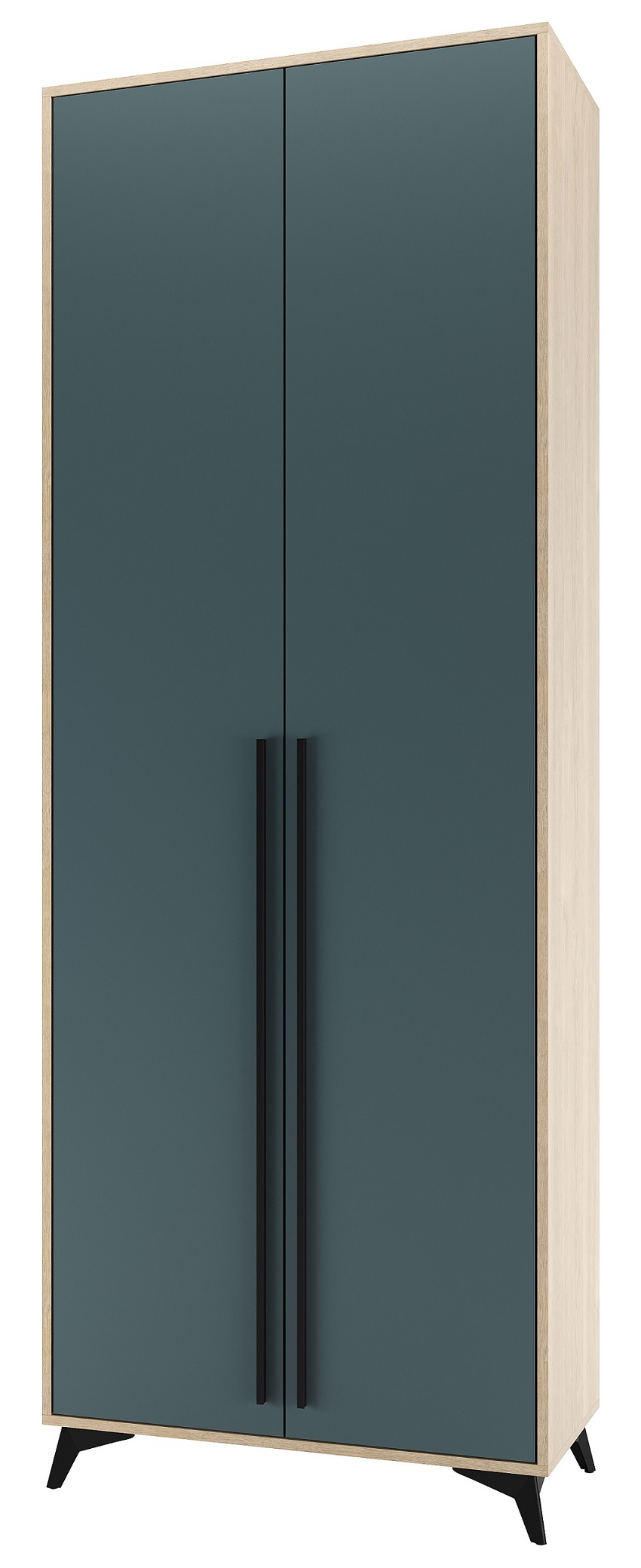 Шкаф 800 2С «ЕВА» с выдвижной металлической штангой. Фасады и лицевой периметр шкафа обработаны кромкой 1 мм. Чёрные металлические ручки-рейлинги и ножки-опоры.