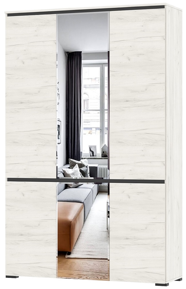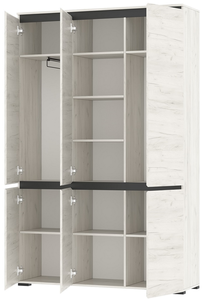 Шкаф 4С2ЗР «ГРЕТТА» 6-створчатый, с поперечной металлической штангой для верхней одежды, с полками. Применение интегрированной ручки на фасадах делает модель стильной и безопасной – дверцы открываются за профилированные выступы. Фасады обработаны кромкой 1 мм. Чёрная регулируемая ножка-опора.