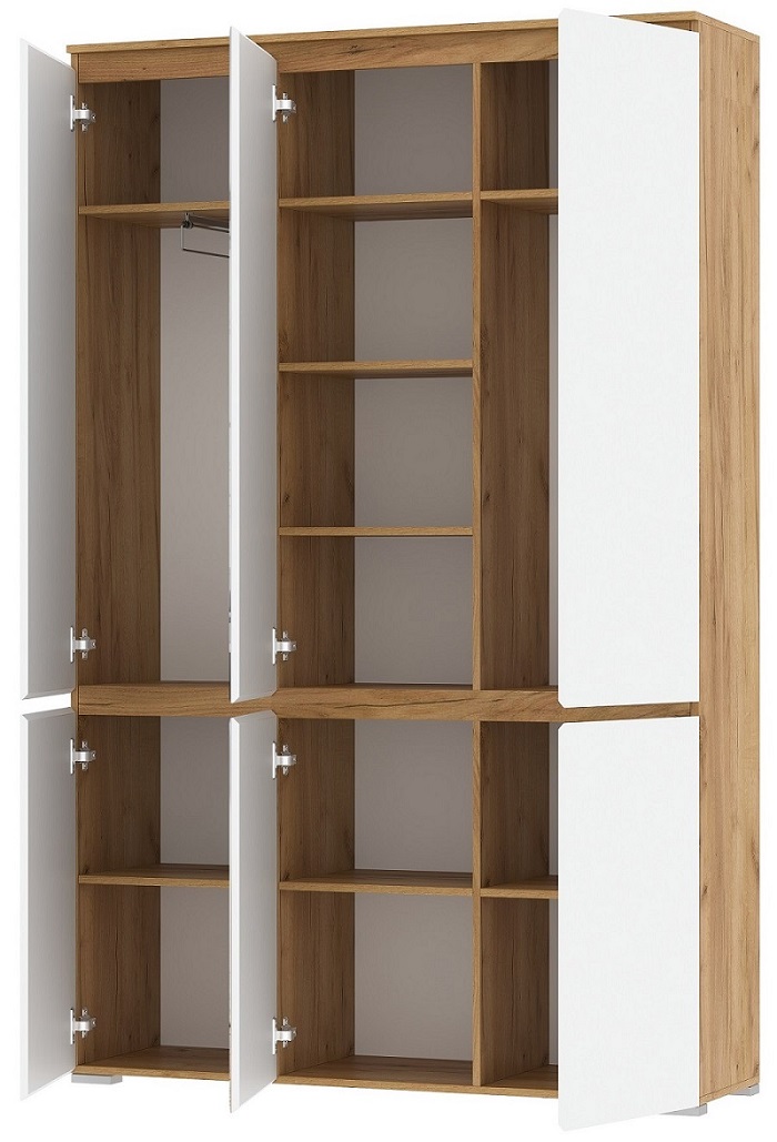 Шкаф 4С2ЗР «ГРЕТТА» 6-створчатый, с поперечной металлической штангой для верхней одежды, с полками. Применение интегрированной ручки на фасадах делает модель стильной и безопасной – дверцы открываются за профилированные выступы. Фасады обработаны кромкой 1 мм. Чёрная регулируемая ножка-опора.