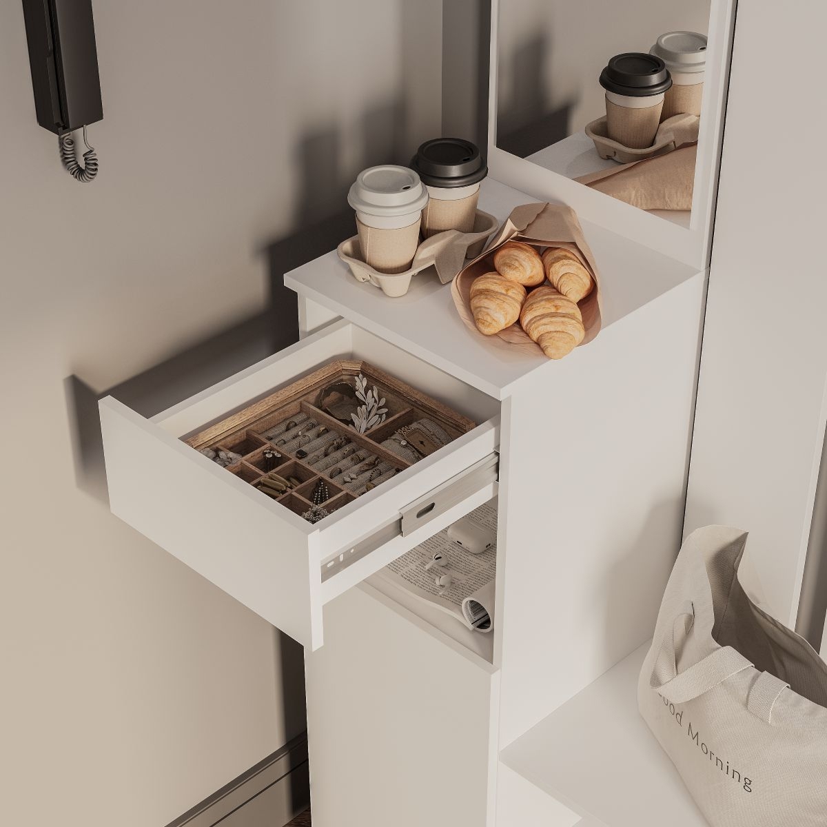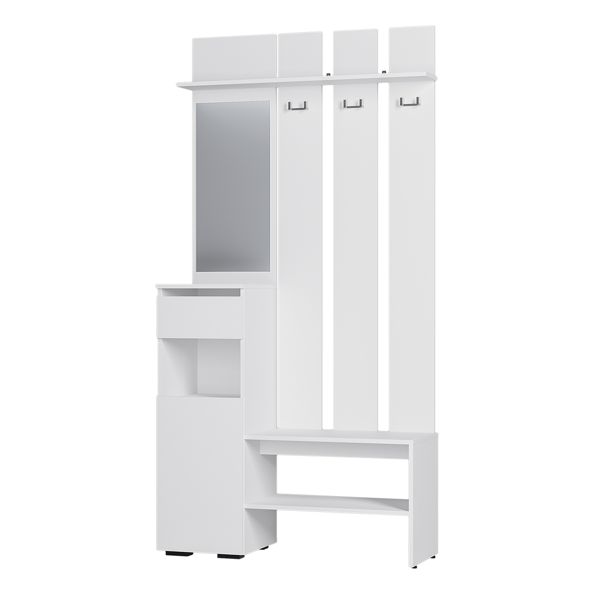 Прихожая «Мия» представлена в двух трендовых оттенках, которые дополнят прихожую в нейтральных тонах или подчеркнут пространство с яркими акцентами в интерьере. Простая геометрическая конструкция без лицевой фурнитуры создаст атмосферу лёгкости и визуально расширит прихожую. Для комфортной подготовки к выходу из дома модель дополнена вертикальным зеркалом.