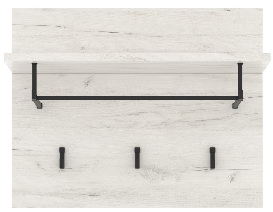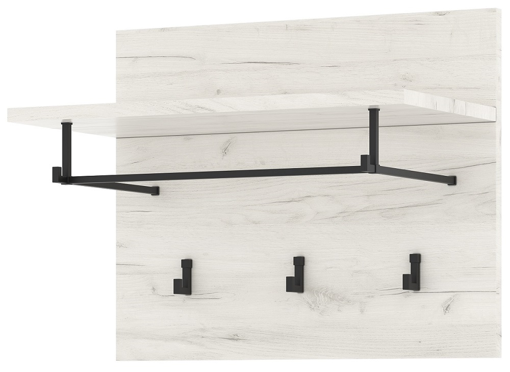 Вешалка 500 «ГРЕТТА» с полкой навесная. Чёрные матовые металлические крючки и опора полки. Крепится к стене через навесные элементы.