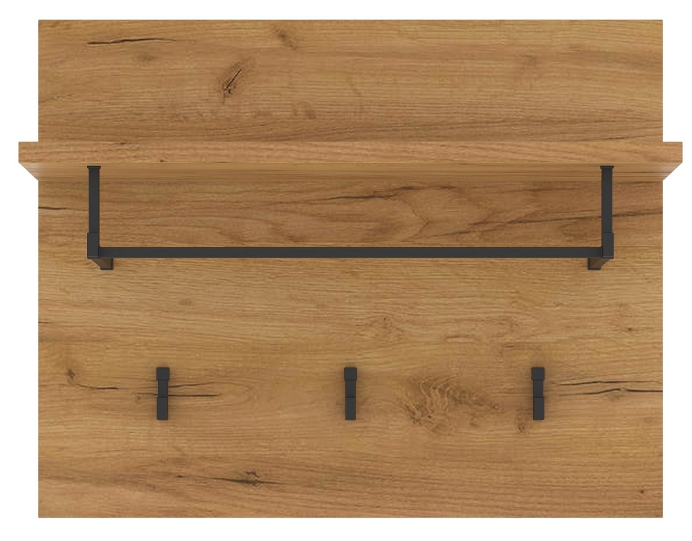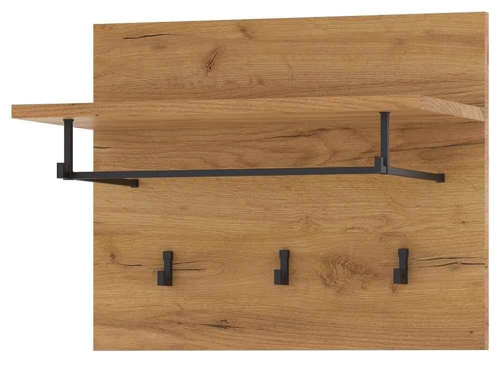 Вешалка 500 «ГРЕТТА» с полкой навесная. Чёрные матовые металлические крючки и опора полки. Крепится к стене через навесные элементы.