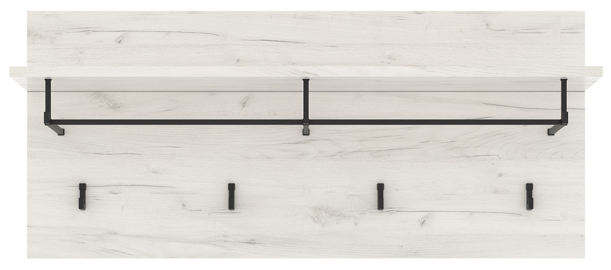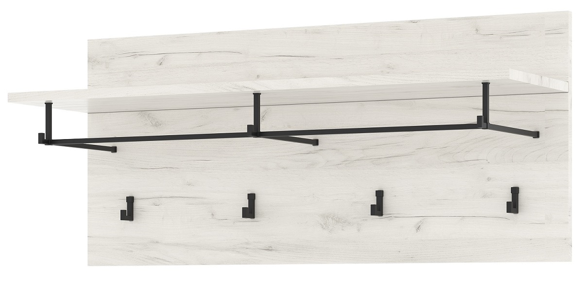 Вешалка 900 «ГРЕТТА» с полкой навесная. Чёрные матовые металлические крючки и опора полки. Крепится к стене через навесные элементы.