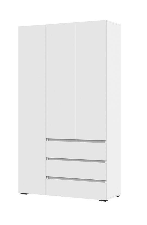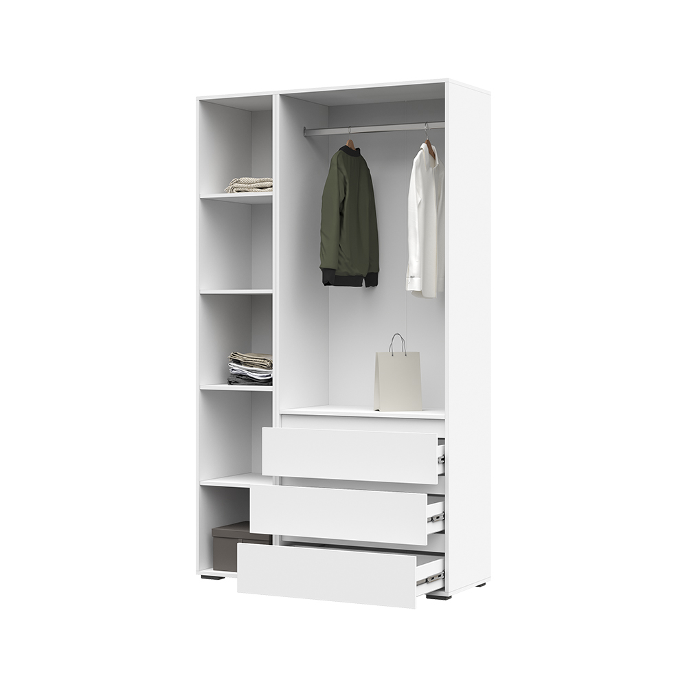 3-х створчатый шкаф с двумя распашными створками неполной высоты , открывающиеся захватом снизу, укомплектованы хромированной штангой для одежды. В нижней части шкафа - три ящика полного выдвижения. Боковая секция модуля в виде глухого пенала открывается с помощью отталкивателя и оснащена полками.