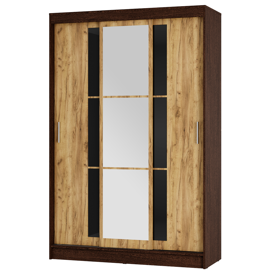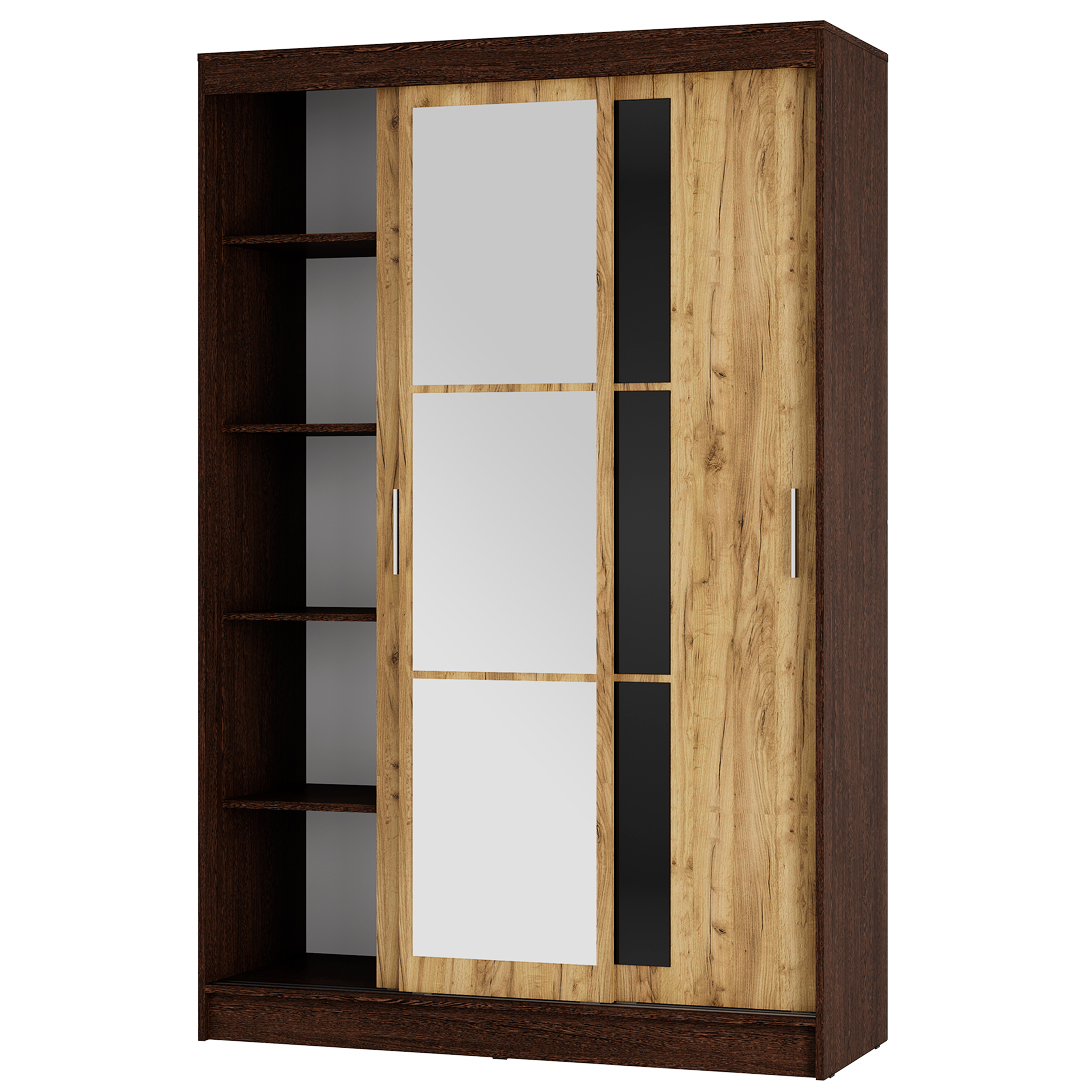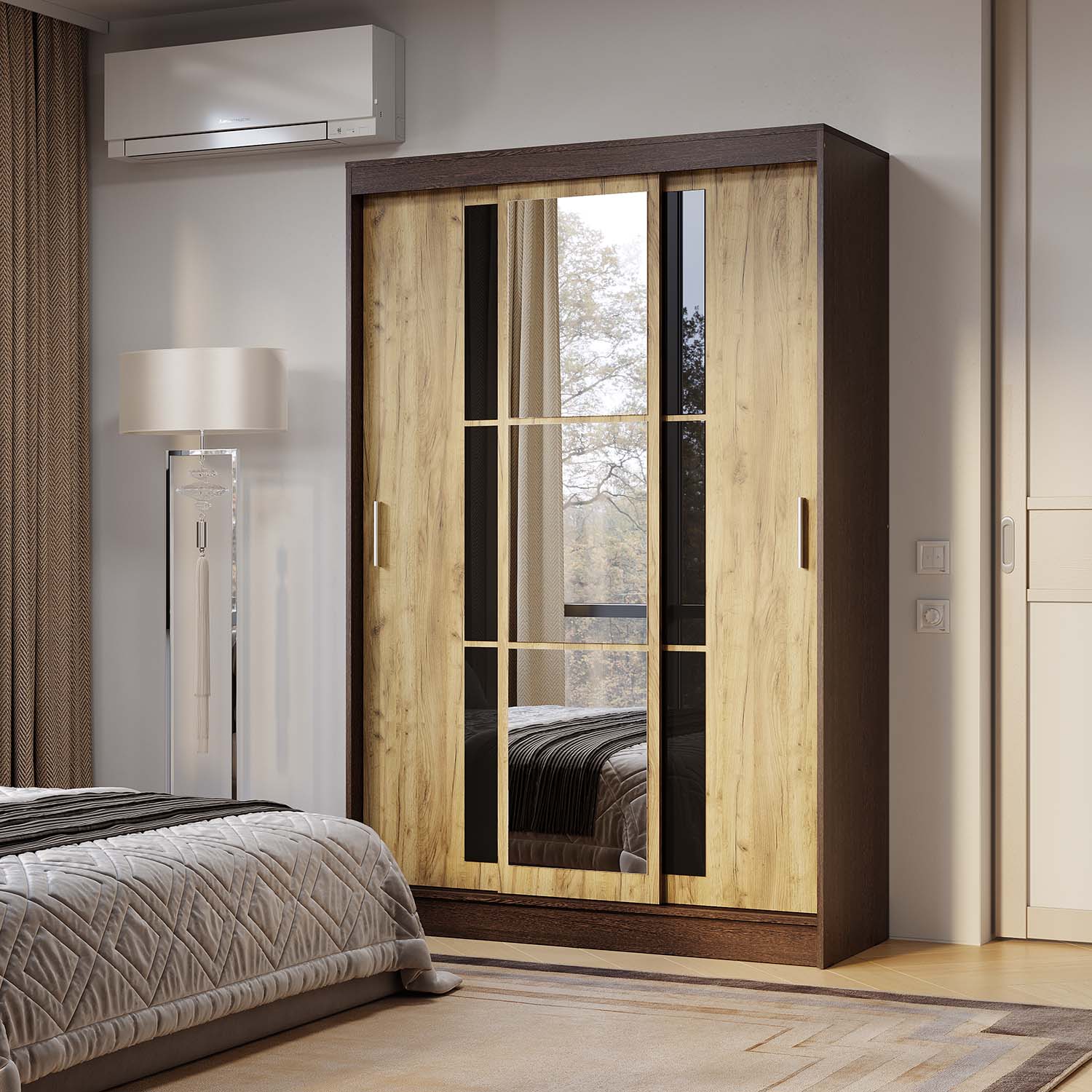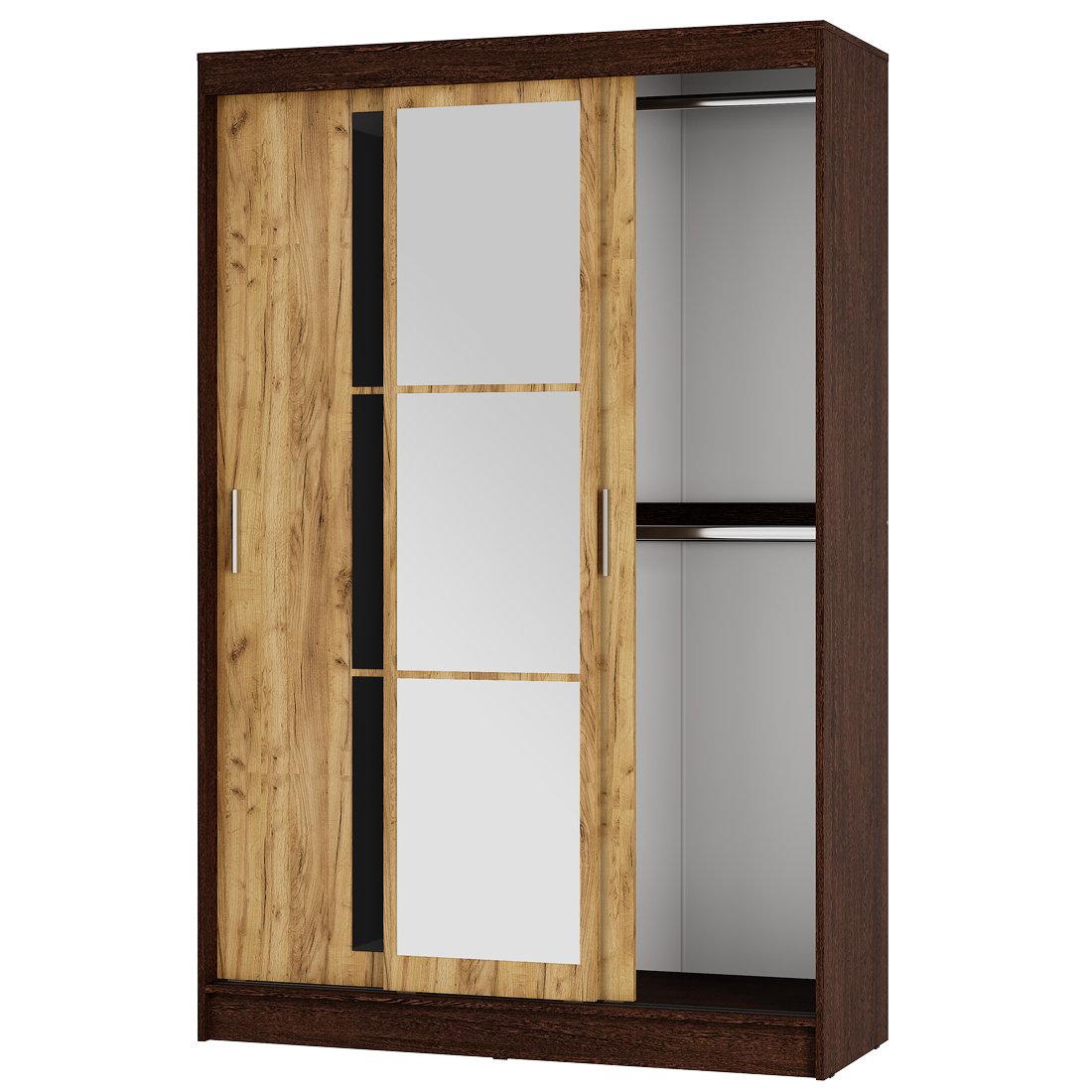 Трёхдверный шкаф-купе «Денвер» представляет собой сочетание практичности и функциональности. Это оптимальный вариант с точки зрения эргономики пространства. Раздвижные створки снабжены удобными ручками, центральная створка полностью декорирована тремя зеркалами с еврокромкой, которое создаёт иллюзию расширенного пространства, а на боковые створки наклеены по 3 стекла с лакобелью. Внутри с одной стороны находятся пять просторных полок для хранения вещей и постельного белья, с другой стороны – вместительная зона хранения с двумя горизонтальными хромированными штангами для одежды на вешалках. Сборка универсальная.