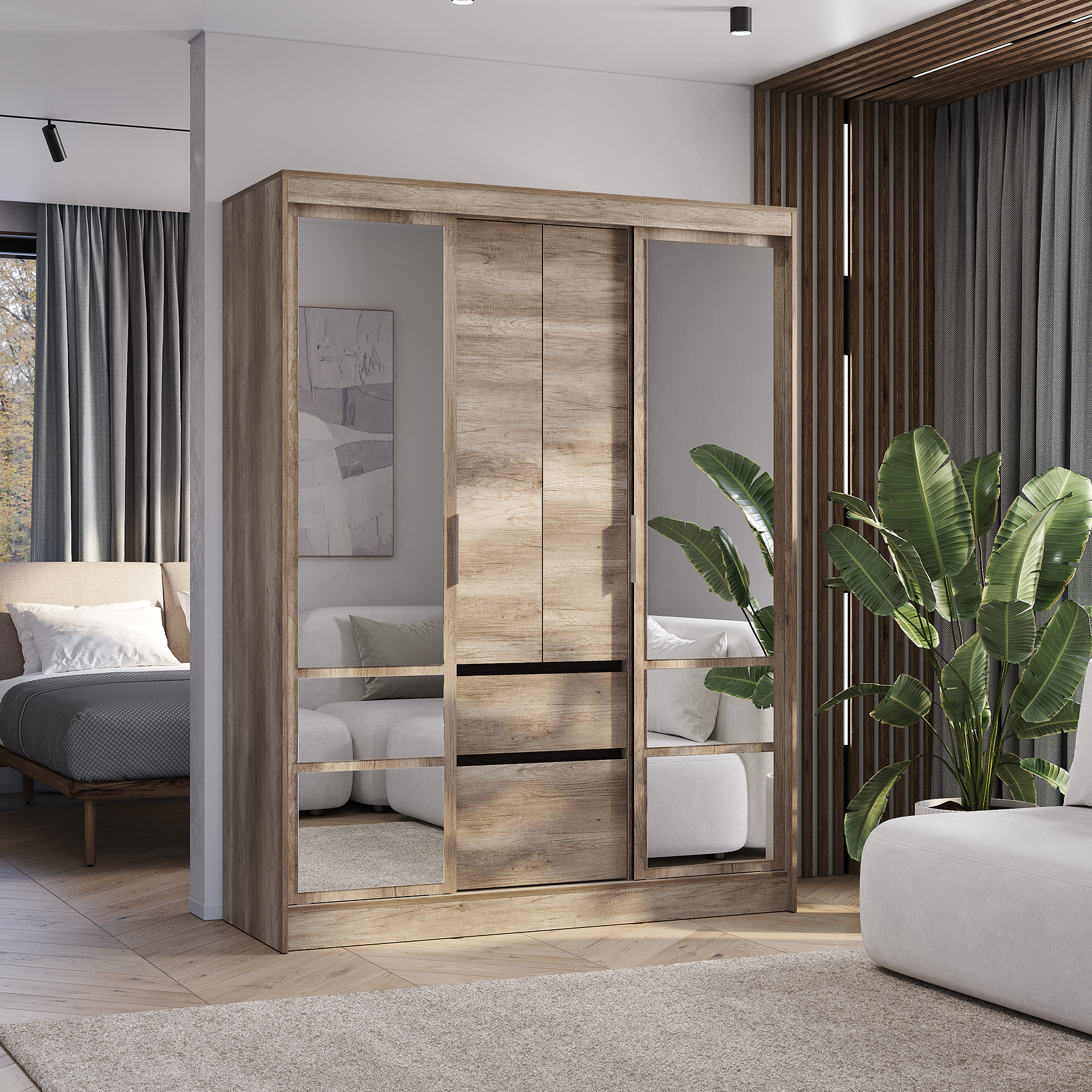 Шкаф-купе «Энигма» — это оптимальное сочетание габаритов и функционала. Модель не занимает много места, но позволяет хранить большой гардероб. Шкаф состоит из одной зоны с полками, двух зон со штангой для вертикального хранения и двух выдвижных ящиков.