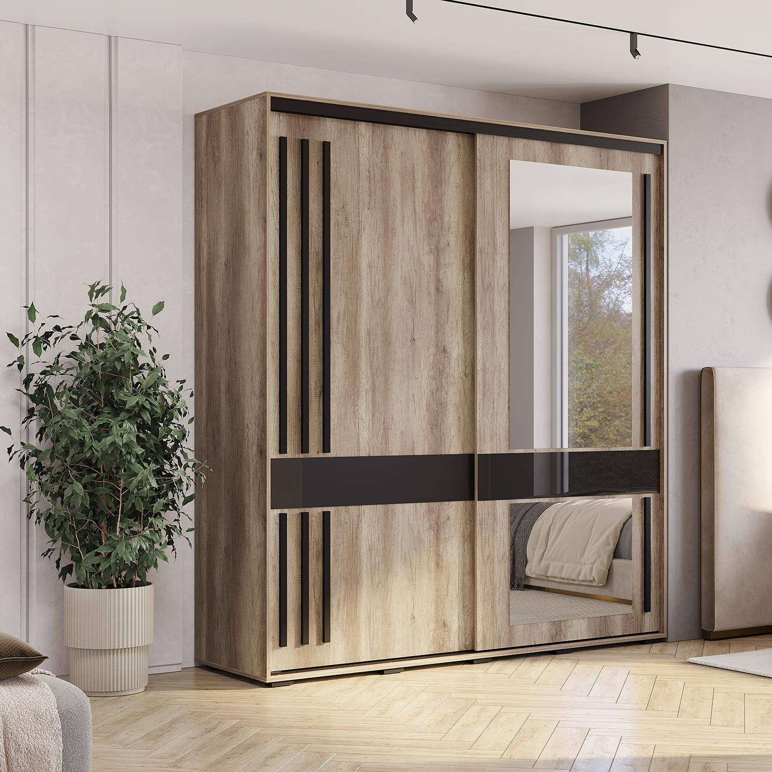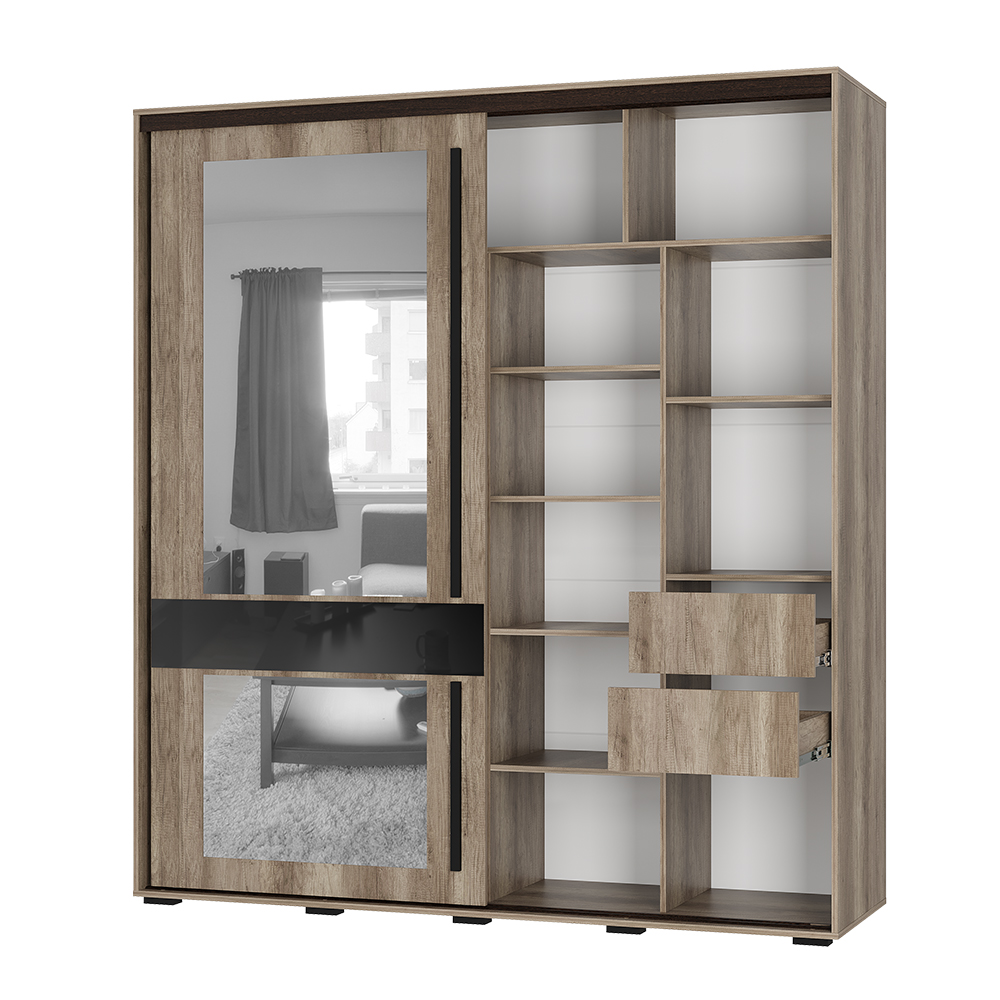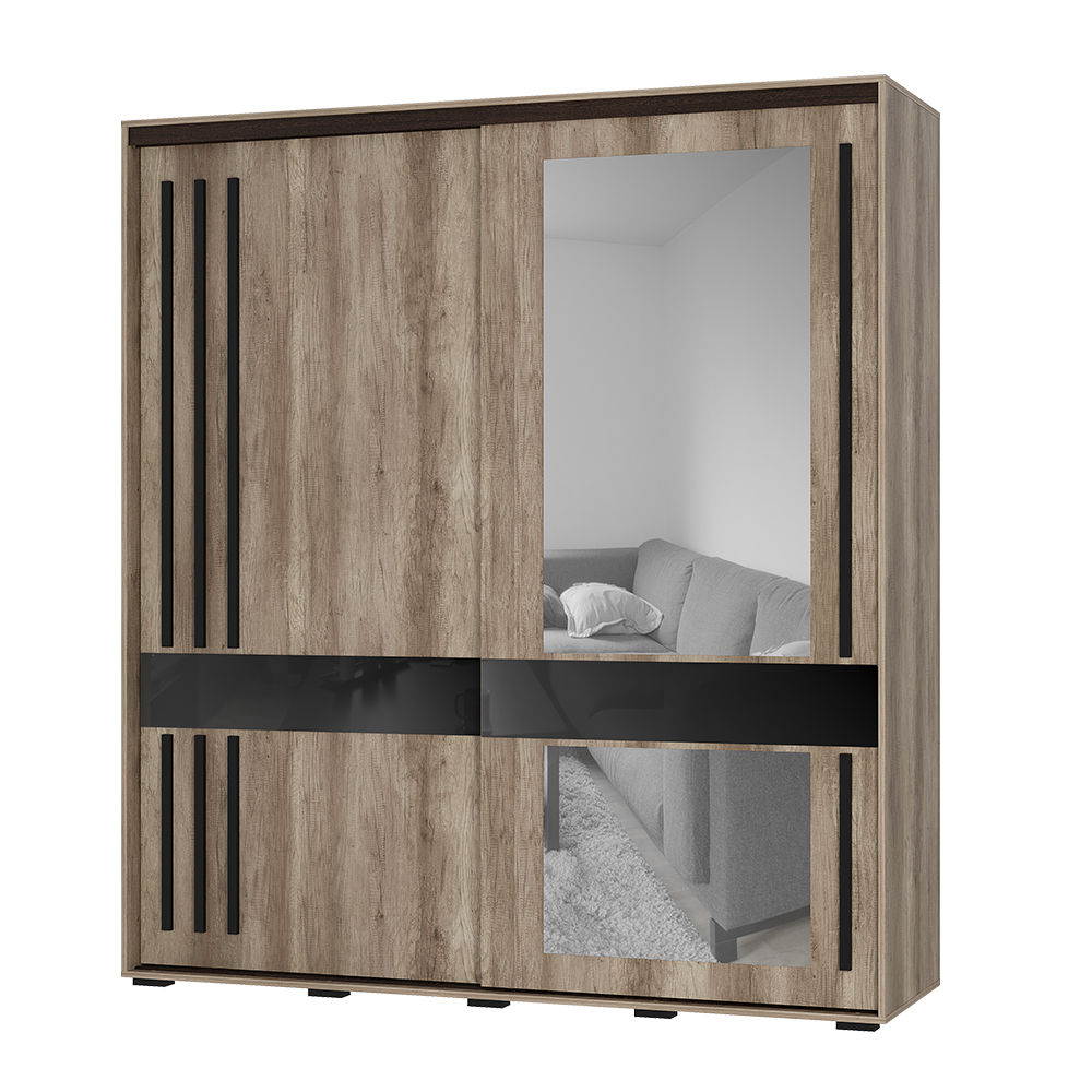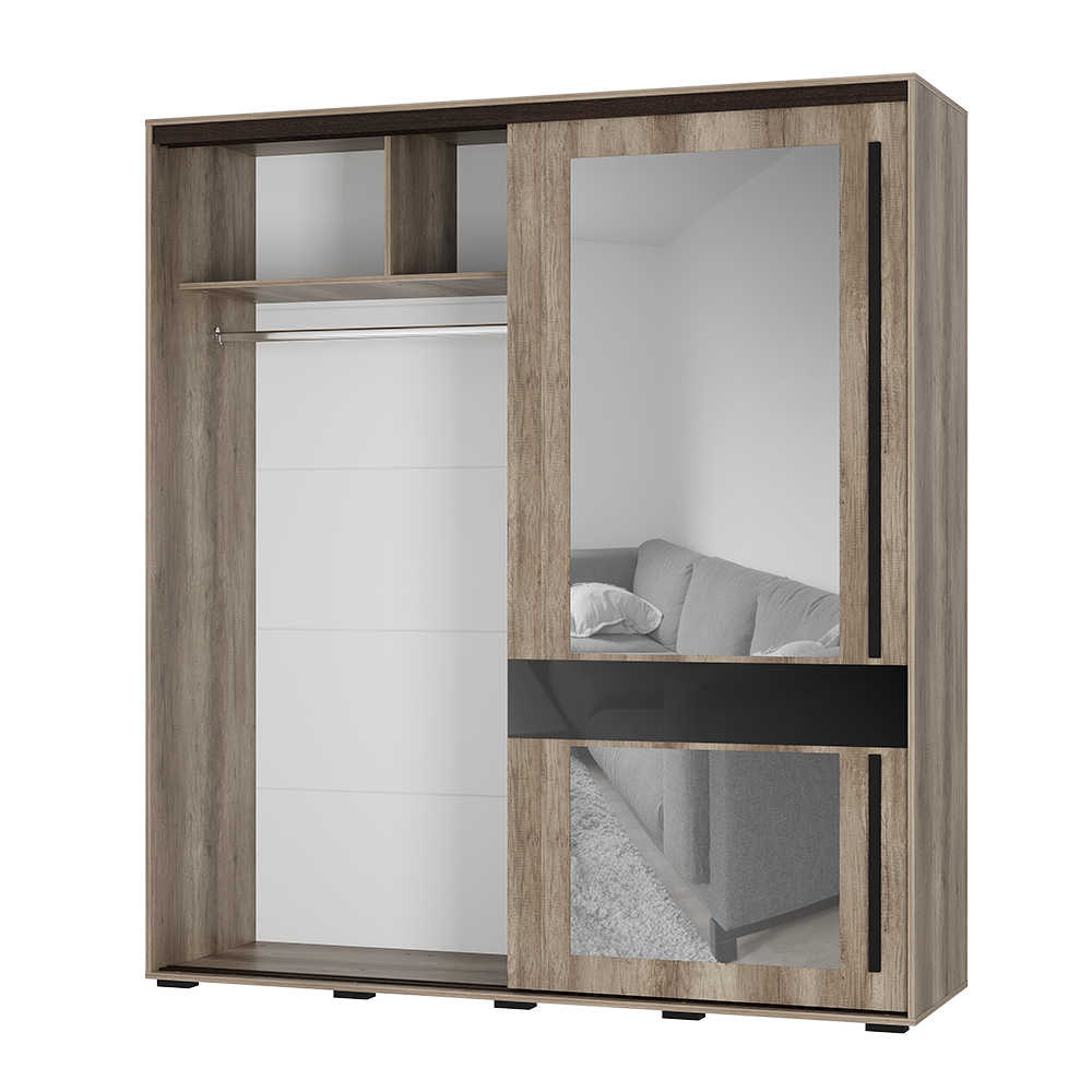 Шкаф-купе «Крафт-8» выполнен в натуральном теплом декоре, повторяющем текстуру дерева. Двери шкафа украшены удлиненными черными ручками из МДФ-профиля, которые гармонично сочетаются с основным цветом и обеспечивают комфортное открытие. Шкаф комплектуется большим зеркалом, которое увеличивает пространство и создает стильный акцент, а черный лакобель придает современный и элегантный вид.