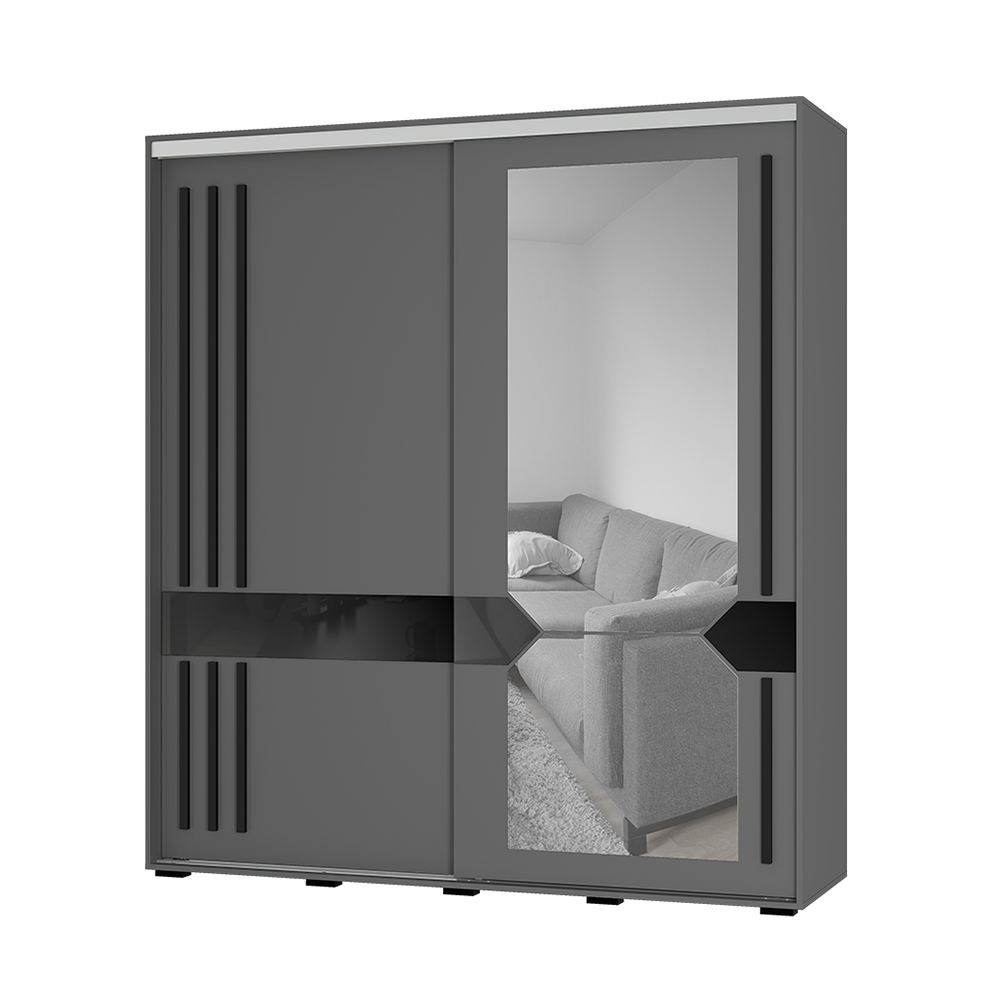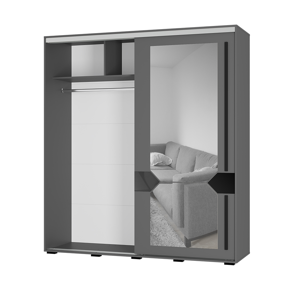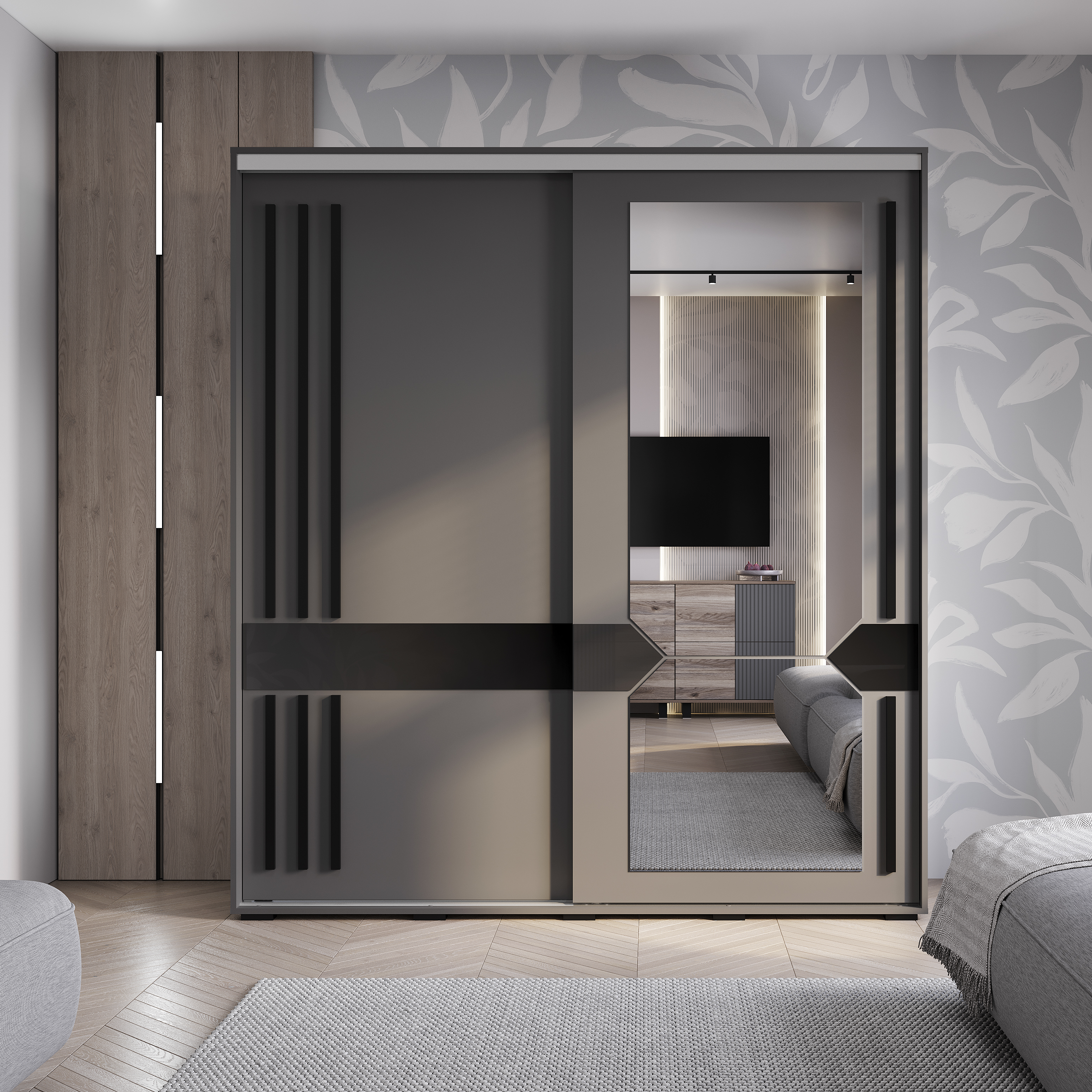 Практичный и многофункциональный шкаф-купе «Крафт-9» подойдет для любой комнаты вашей квартиры или дома. Двери шкафа оснащены стильными длинными вставками из черного МДФ -профиля, выполняющими роль ручек. Шкаф украшен роскошным зеркалом с интересной геометрической формой, которое не только выполняет свою практическую функцию, но и становится изысканным акцентом. Лакобель в черном цвете добавляет интерьеру глубину и шарм, придавая ему стильный и солидный вид.