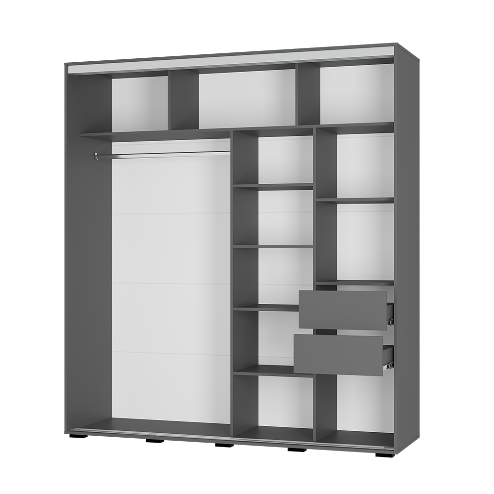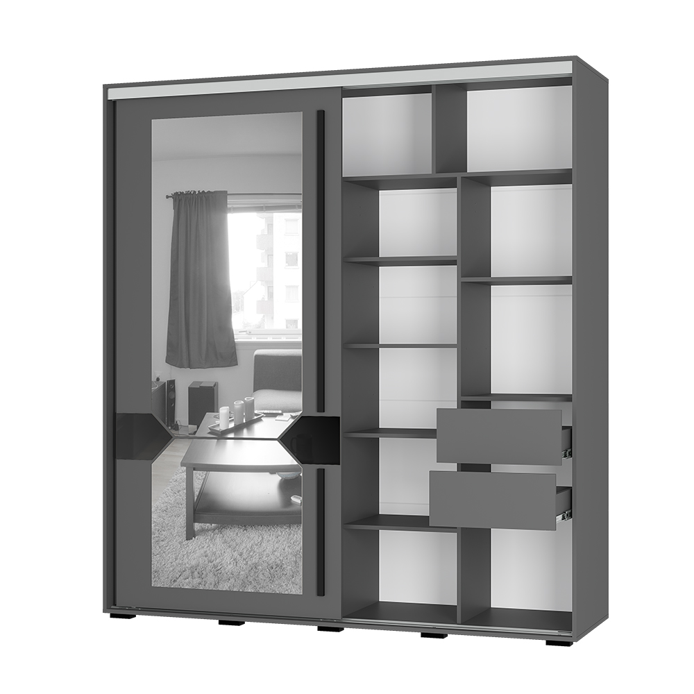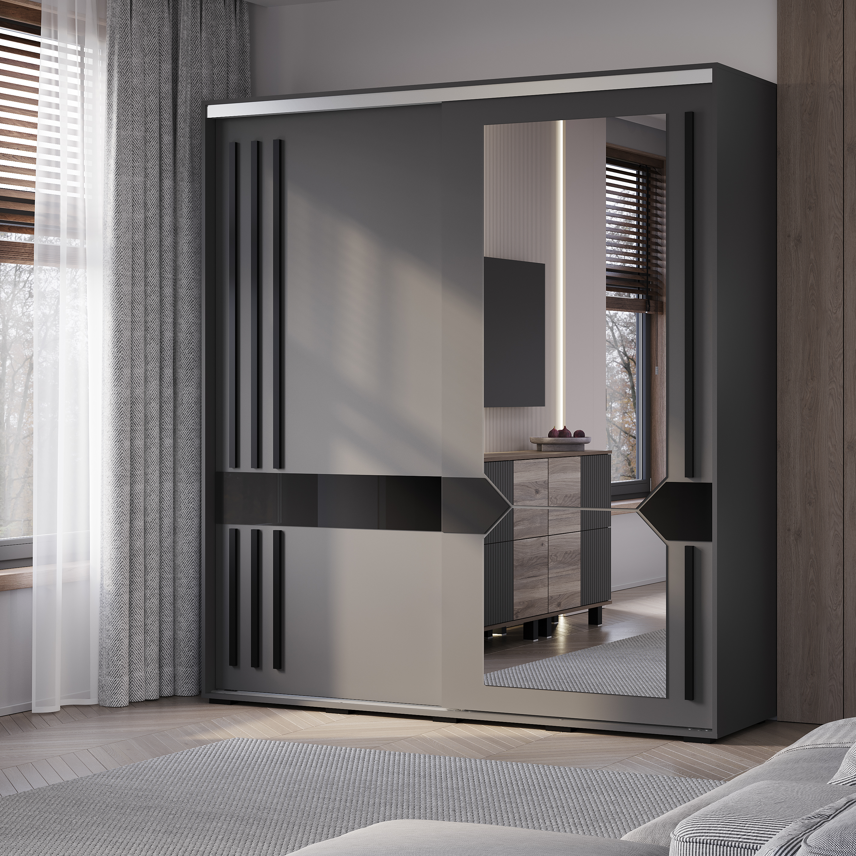 Практичный и многофункциональный шкаф-купе «Крафт-9» подойдет для любой комнаты вашей квартиры или дома. Двери шкафа оснащены стильными длинными вставками из черного МДФ -профиля, выполняющими роль ручек. Шкаф украшен роскошным зеркалом с интересной геометрической формой, которое не только выполняет свою практическую функцию, но и становится изысканным акцентом. Лакобель в черном цвете добавляет интерьеру глубину и шарм, придавая ему стильный и солидный вид.