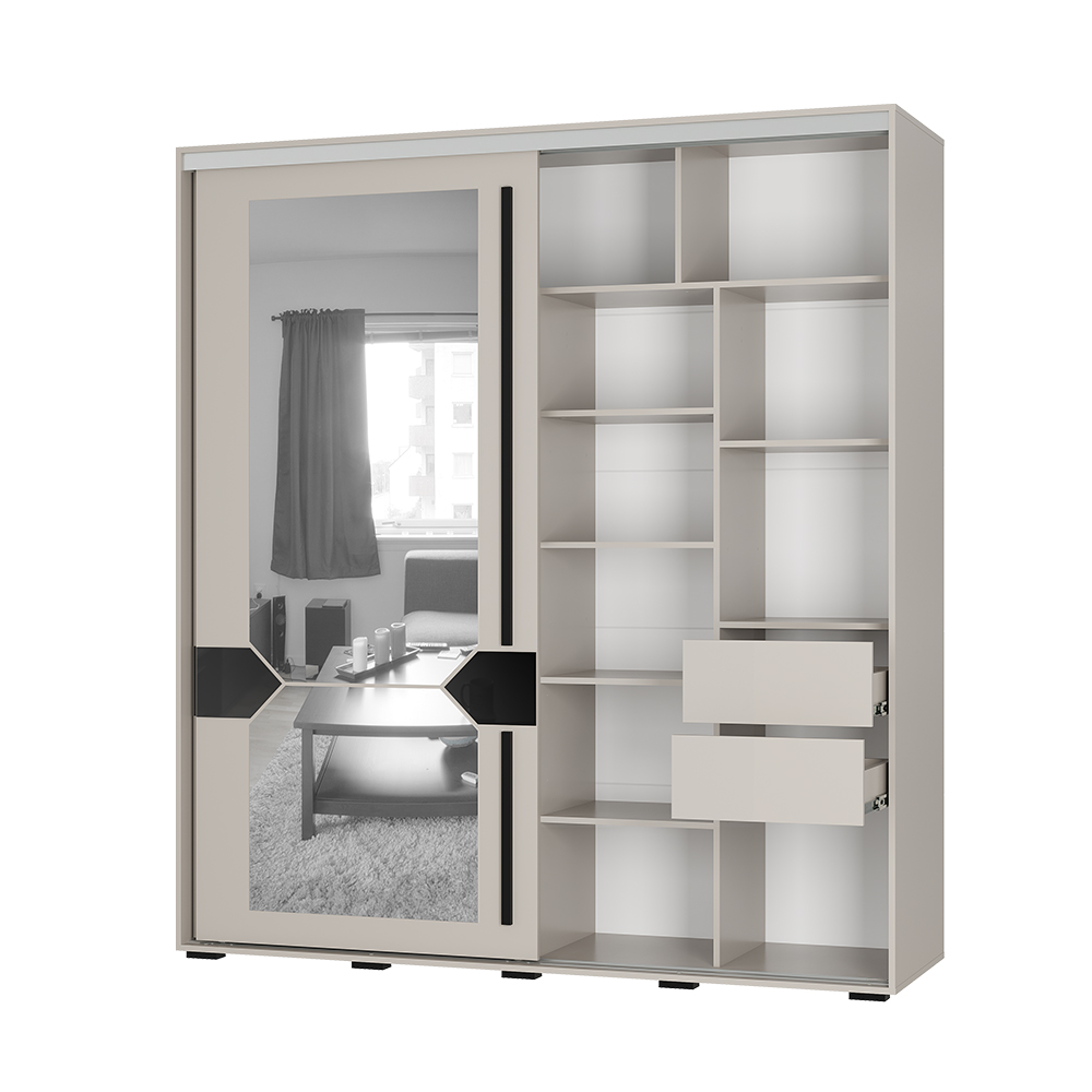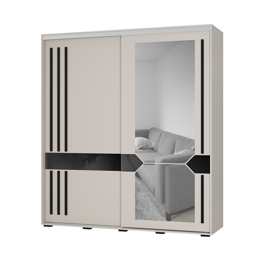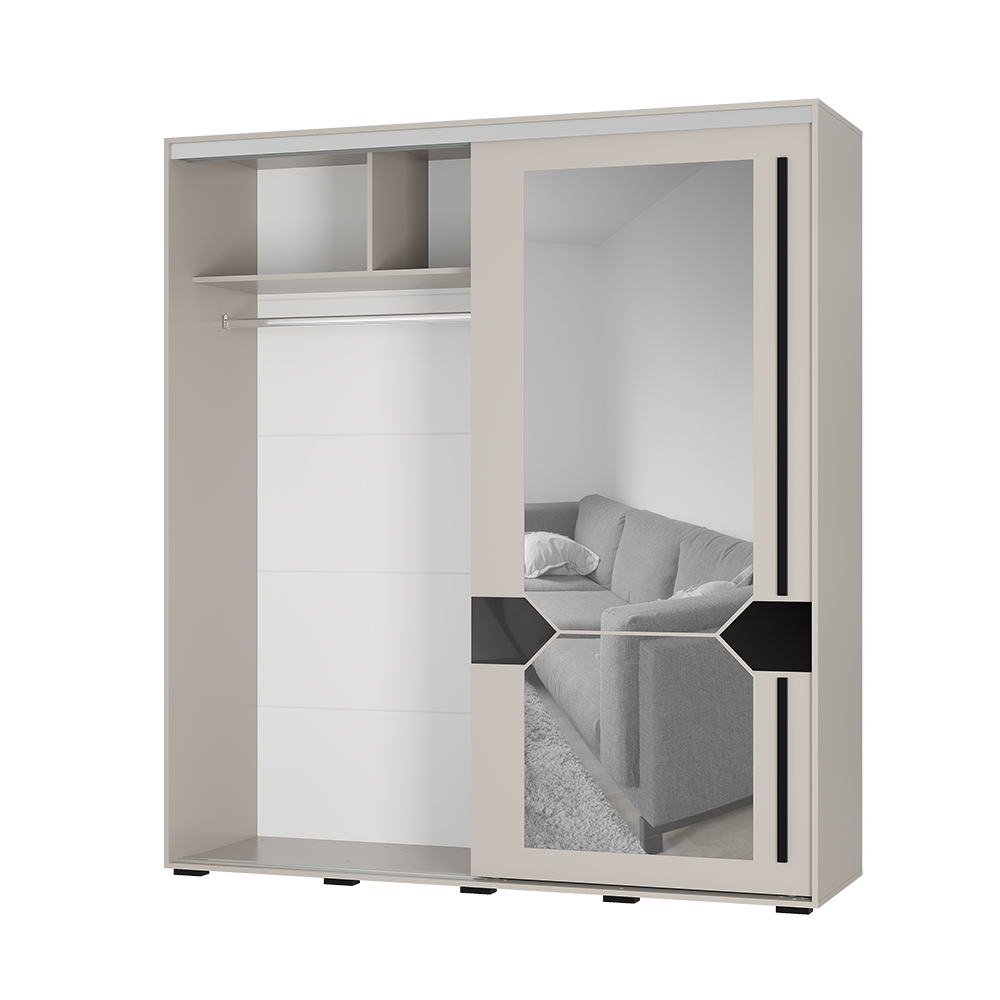 Зеркало - тип обработки ерокромка. Лакобель черного цвета с типом обработки стекла еврокромка. Механизм открывания дверей - нижнеопорная система «Рамир».