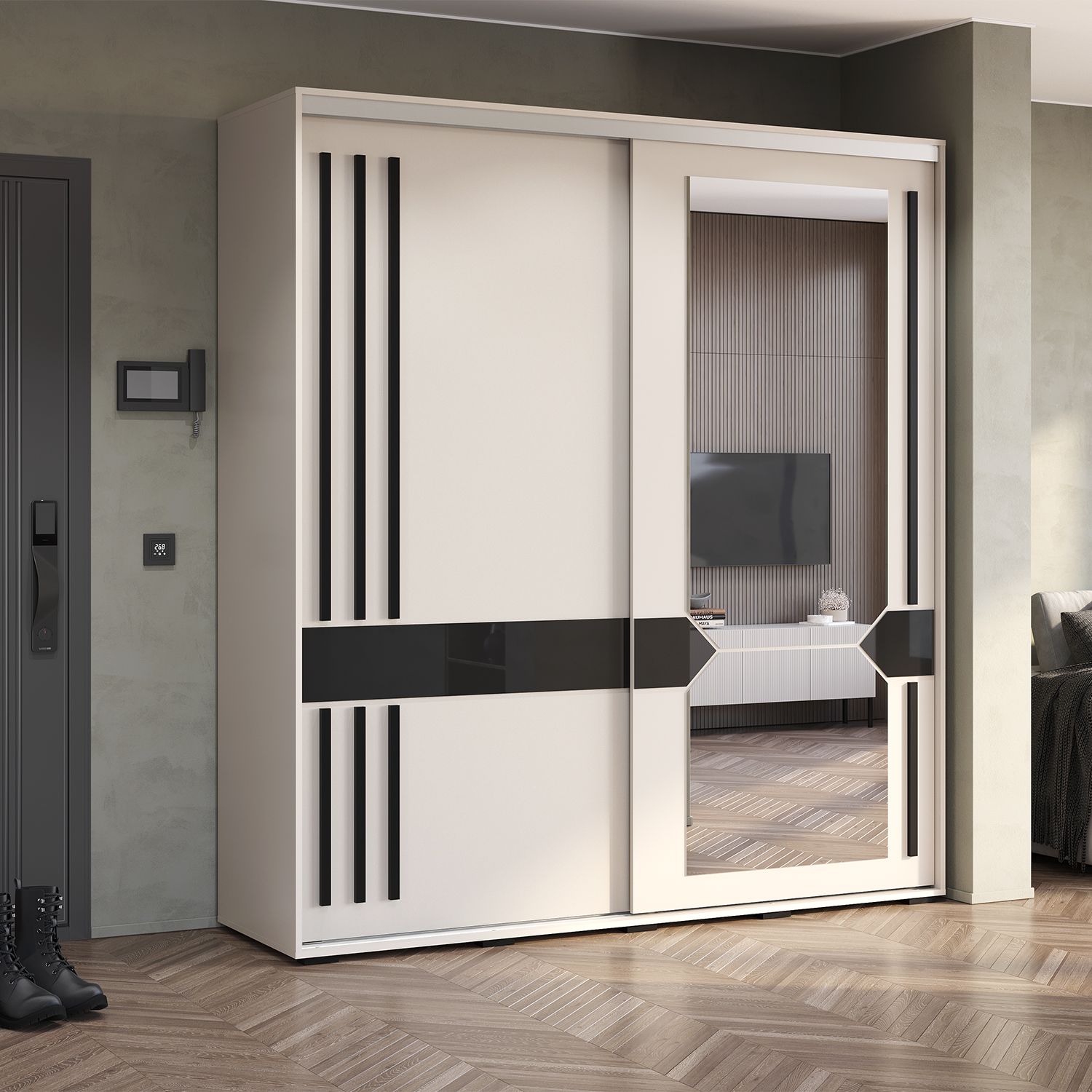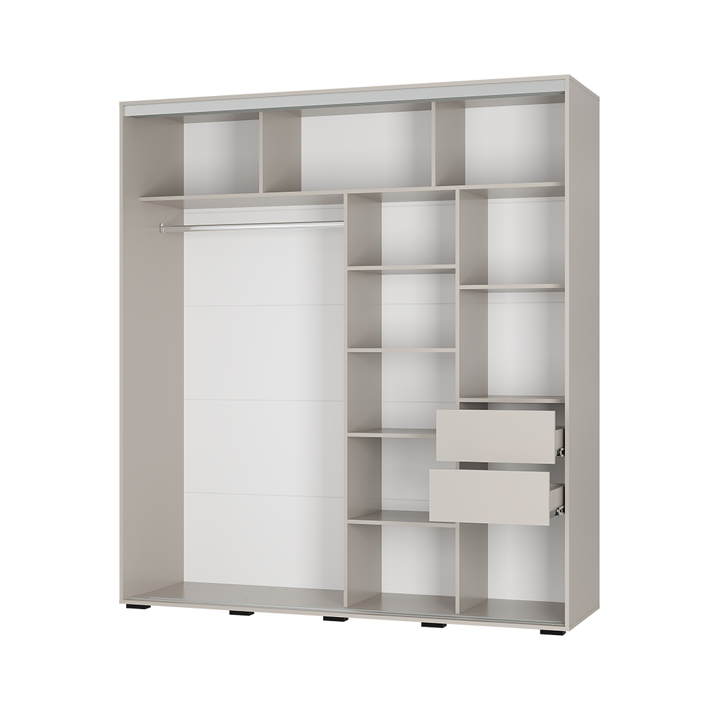 Шкаф-купе «Крафт-9» представлен с всовременном и трендовом декоре «кашемир». Его мягкий, природный оттенок создает приятную атмосферу и визуально расширяет пространство. Двери шкафа оснащены длинными, модными черными ручками, что способствует удобному открыванию, позволяя легко и без усилий получить доступ к его внутреннему содержимому. Шкаф украшен роскошным зеркалом с интересной геометрической формой, которое не только выполняет свою практическую функцию, но и становится изысканным акцентом. Лакобель в черном цвете добавляет интерьеру глубину и шарм, придавая ему стильный и солидный вид.