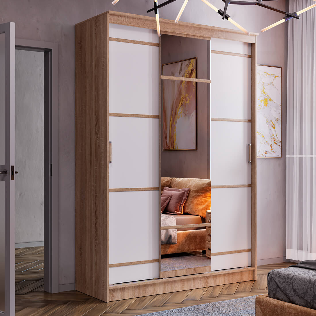 Он сделан из ЛДСП высокого качества в комбинации цветов сонома и белый, раздвижные дверцы декорированы темными полосами и дополнены удобными ручками, центральная створка – полностью зеркальная. Внутри модель содержит все необходимые зоны для хранения одежды и обуви: большое отделение для плечиков, а также полки и ниши для остальных вещей.