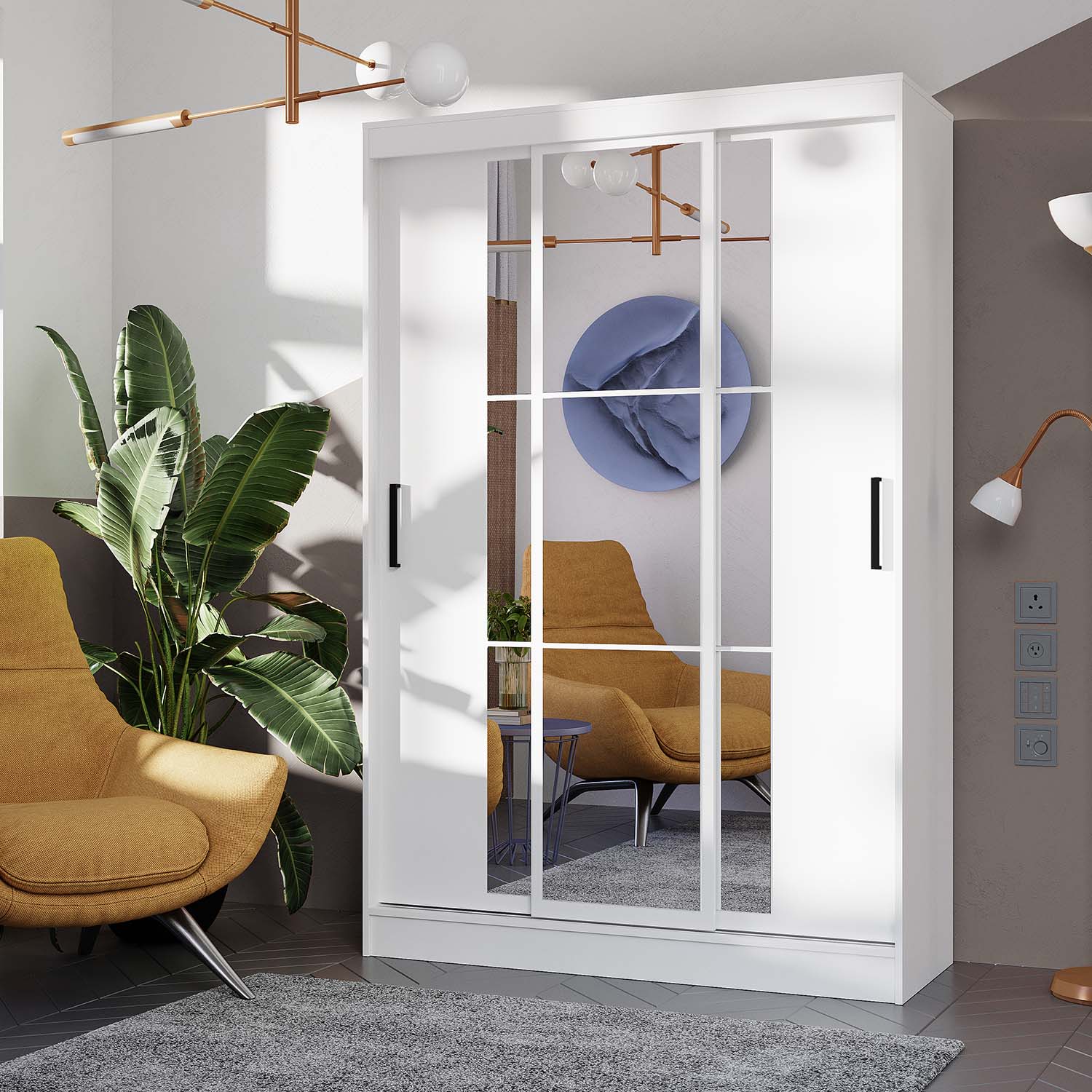 Трёхдверный шкаф-купе «Тайм» представляет собой сочетание практичности и функциональности. Это оптимальный вариант с точки зрения эргономики пространства. Раздвижные створки снабжены удобными ручками, центральная створка полностью декорирована зеркалом с еврокромкой, которое создаёт иллюзию расширенного пространства. Внутри с одной стороны находятся пять просторных полок для хранения вещей и постельного белья, с другой стороны – вместительная зона хранения с двумя горизонтальной хромированной штангой для одежды на вешалках. Все три створки шкафа подвижны.