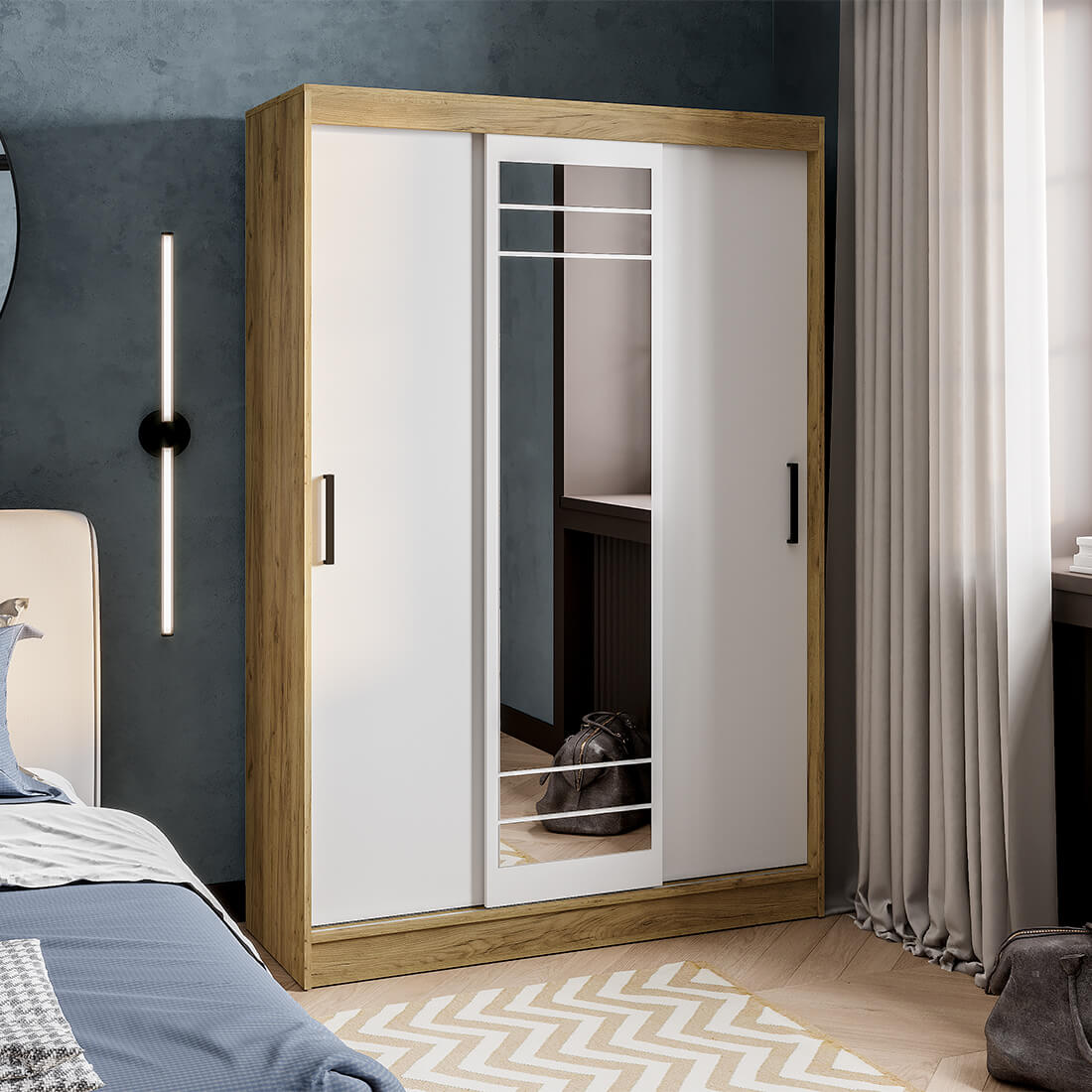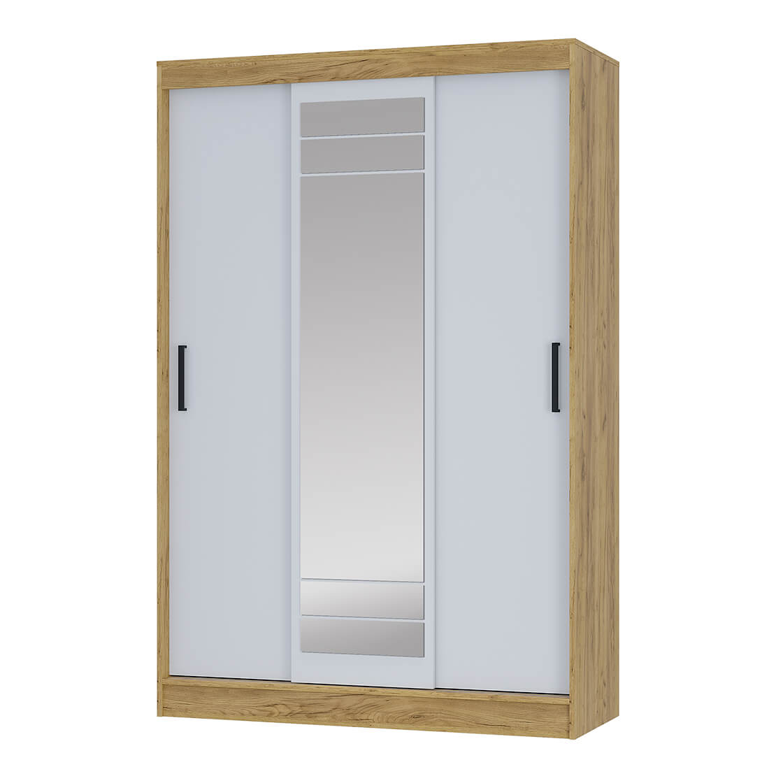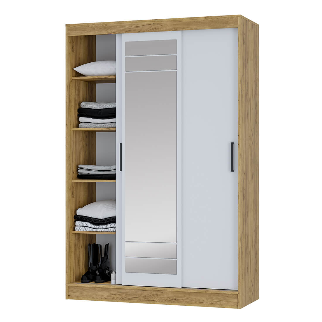 Трёхдверный шкаф-купе «Тео» ШКК-02 представляет собой сочетание практичности и функциональности. Это оптимальный вариант с точки зрения эргономики пространства. Раздвижные створки снабжены удобными ручками, центральная створка полностью декорирована зеркалом с еврокромкой, которое создаёт иллюзию расширенного пространства. Внутри с одной стороны находятся пять просторных полок для хранения вещей и постельного белья, с другой стороны – вместительная зона хранения с двумя горизонтальными хромированными штангами для одежды на вешалках.
