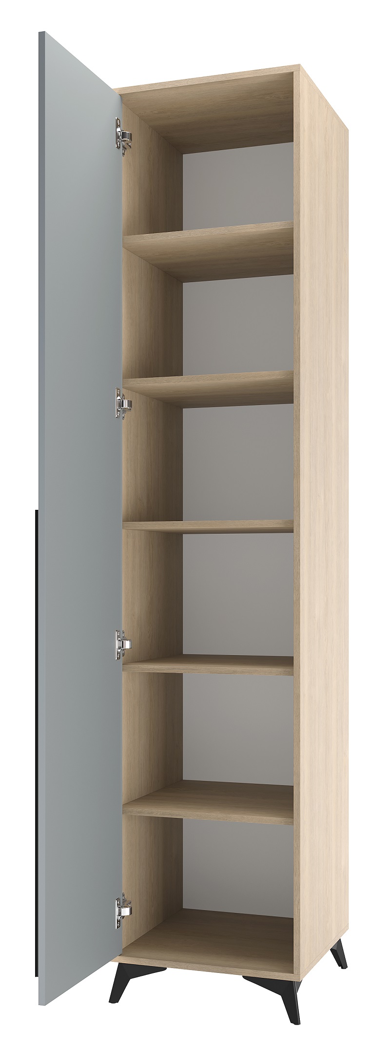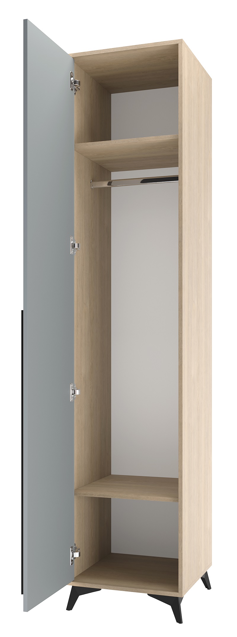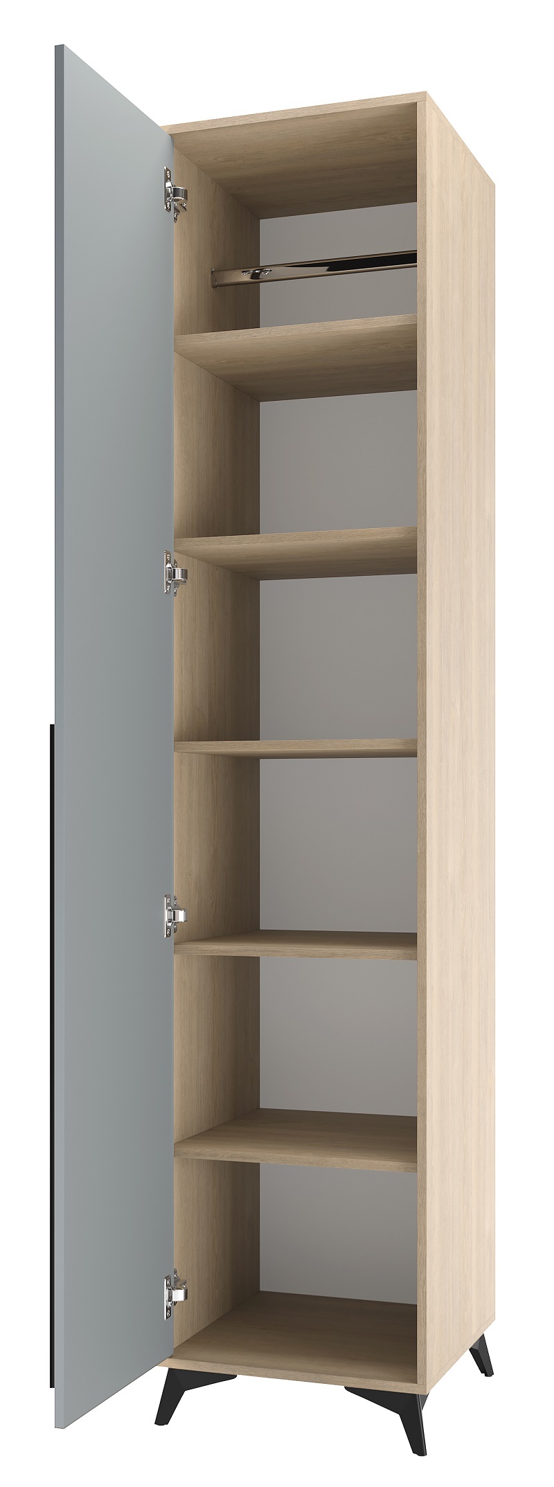 Пенал 480 1С «ЕВА» с полками и металлической штангой. Фасад и лицевой периметр пенала обработаны кромкой 1 мм. Чёрная металлическая ручка-рейлинг и ножки-опоры.