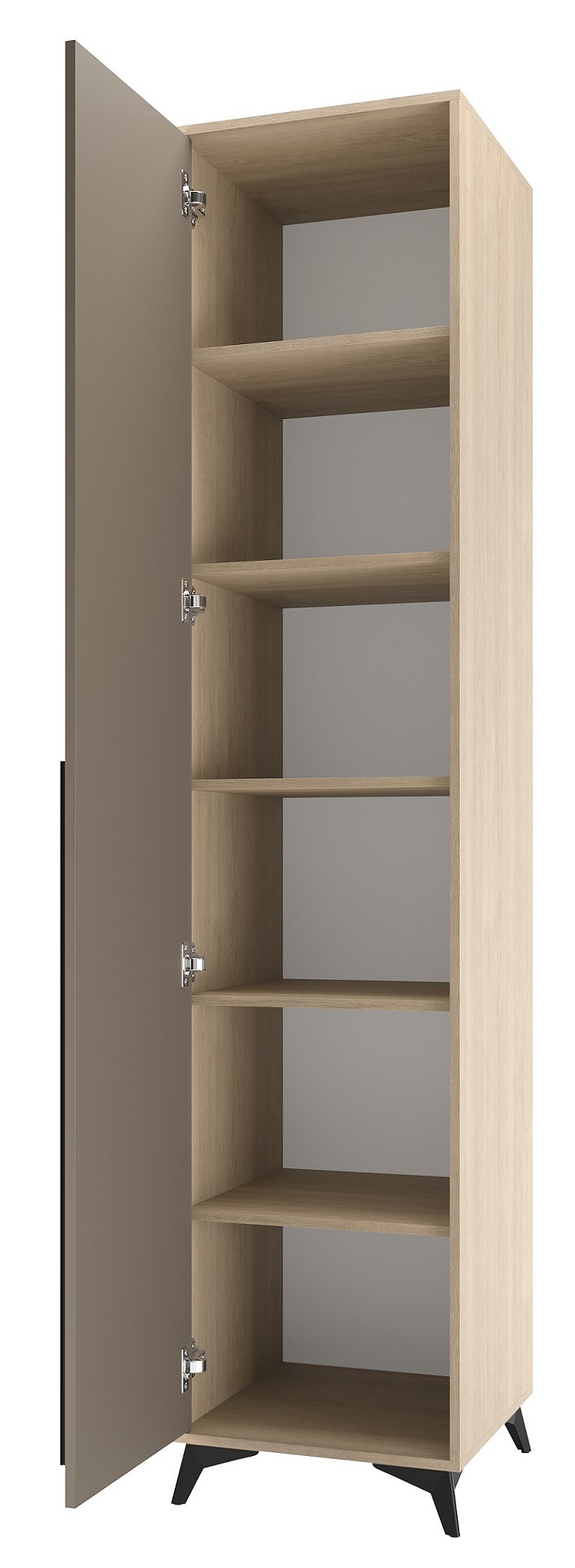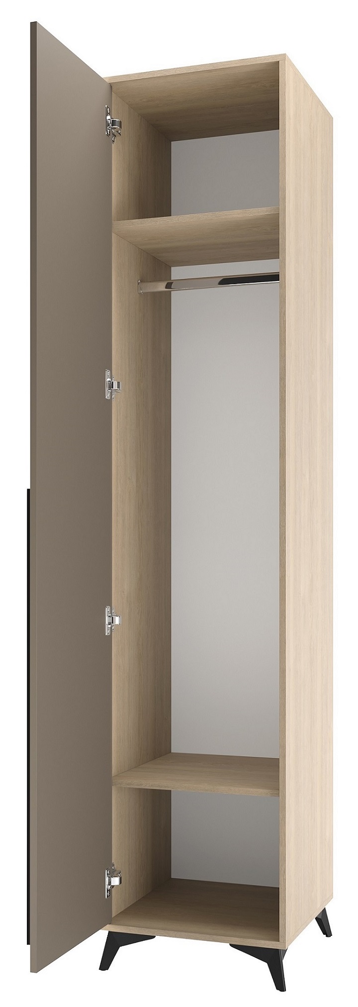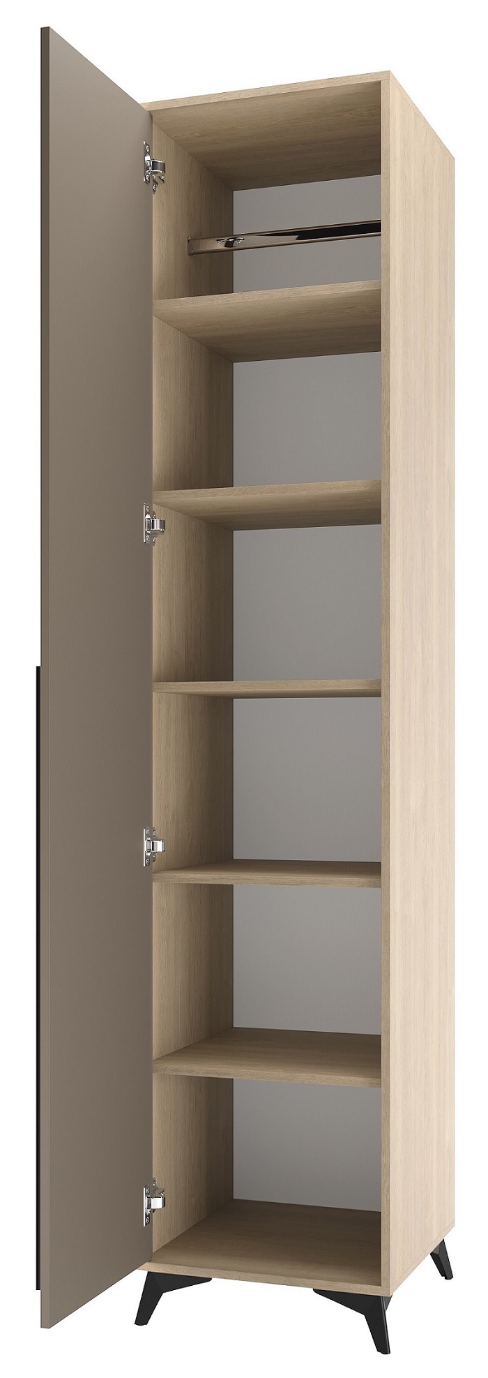 Пенал 480 1С «ЕВА» с полками и металлической штангой. Фасад и лицевой периметр пенала обработаны кромкой 1 мм. Чёрная металлическая ручка-рейлинг и ножки-опоры.