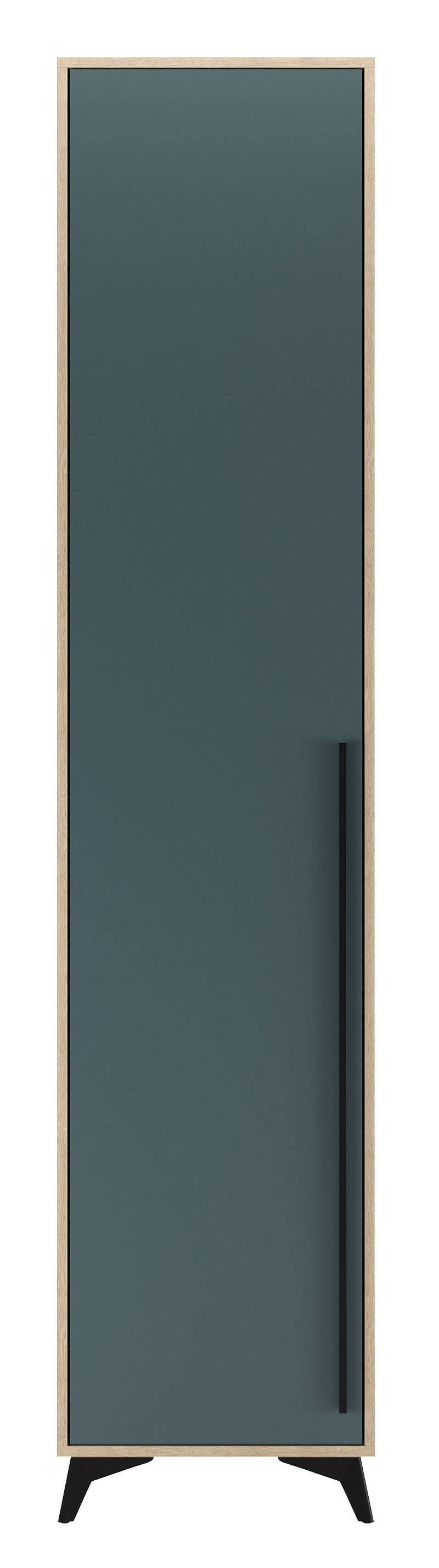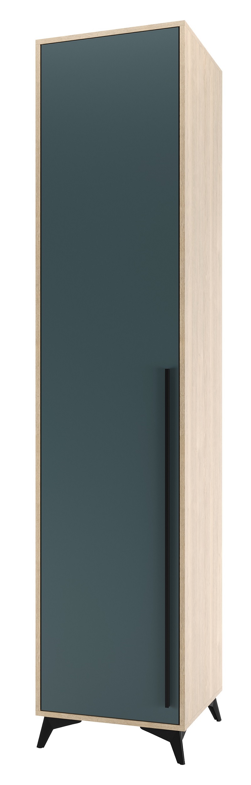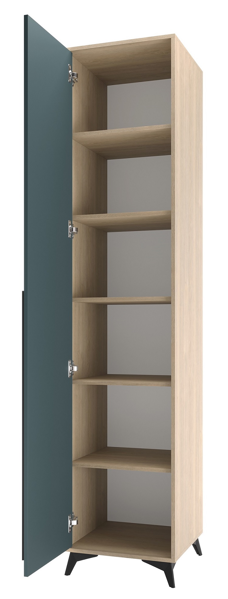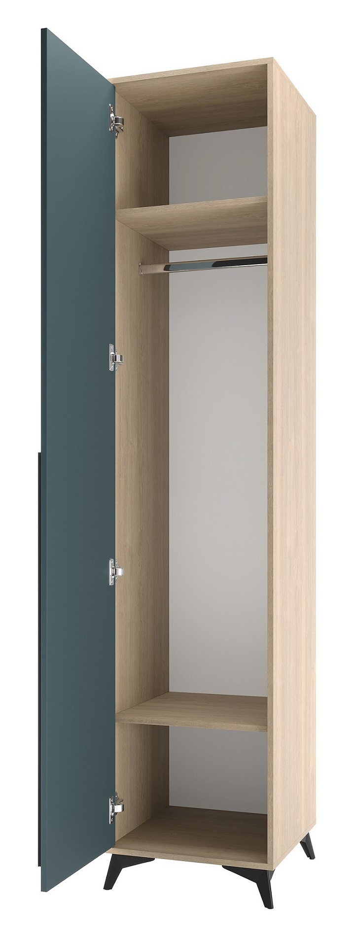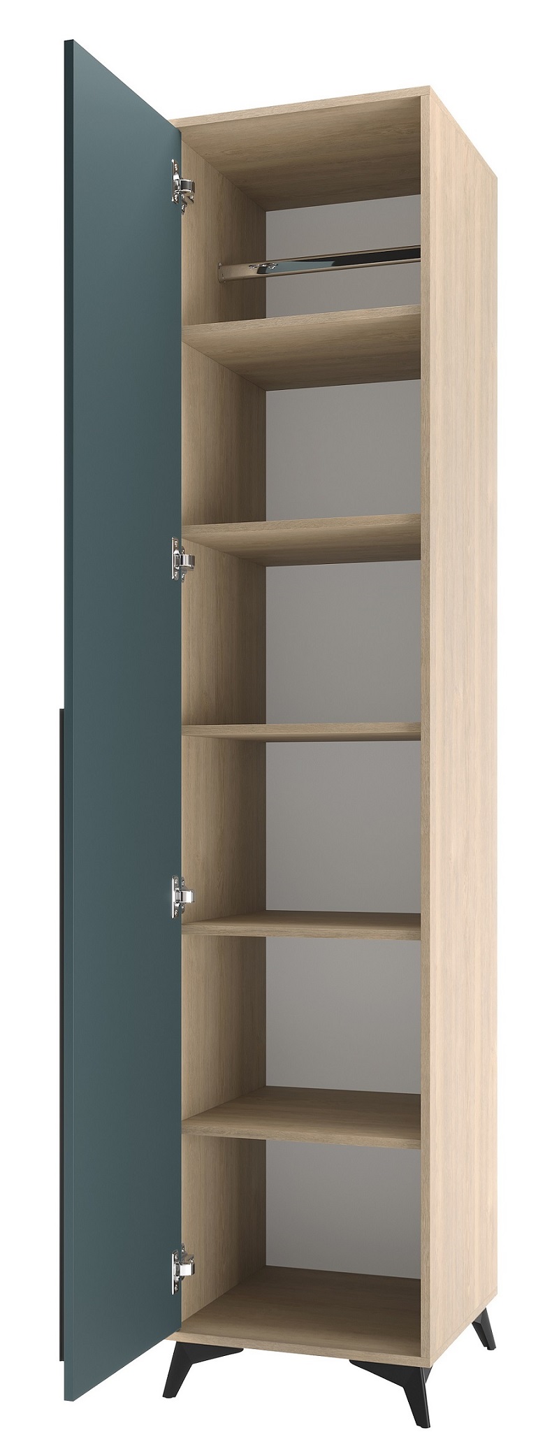 Пенал 480 1С «ЕВА» с полками и металлической штангой. Фасад и лицевой периметр пенала обработаны кромкой 1 мм. Чёрная металлическая ручка-рейлинг и ножки-опоры.