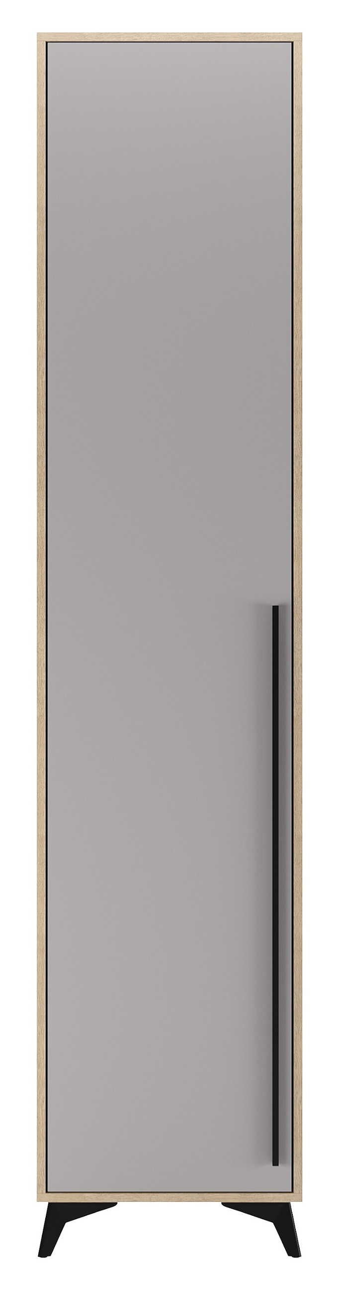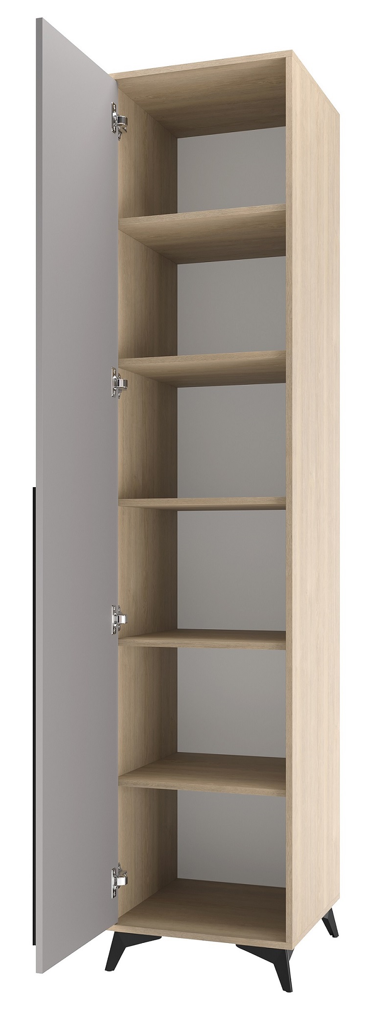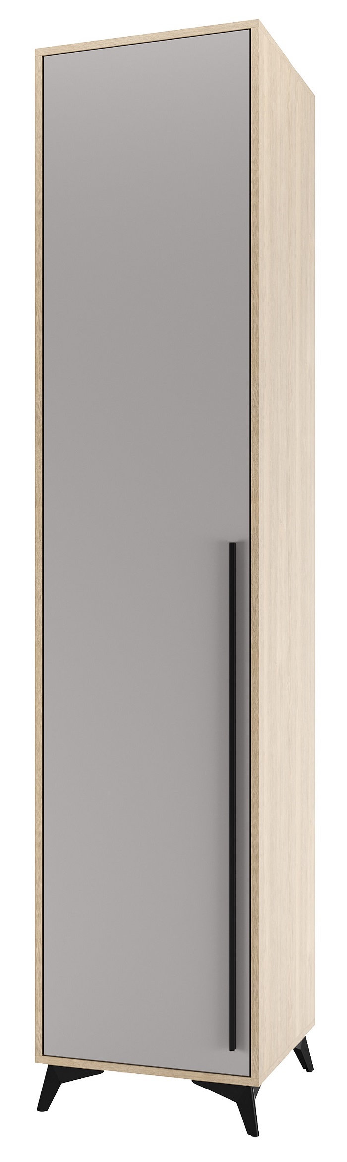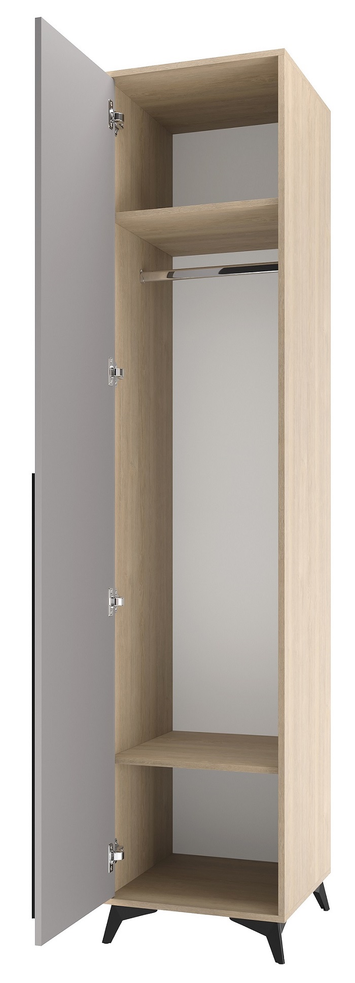 Пенал 480 1С «ЕВА» с полками и металлической штангой. Фасад и лицевой периметр пенала обработаны кромкой 1 мм. Чёрная металлическая ручка-рейлинг и ножки-опоры.