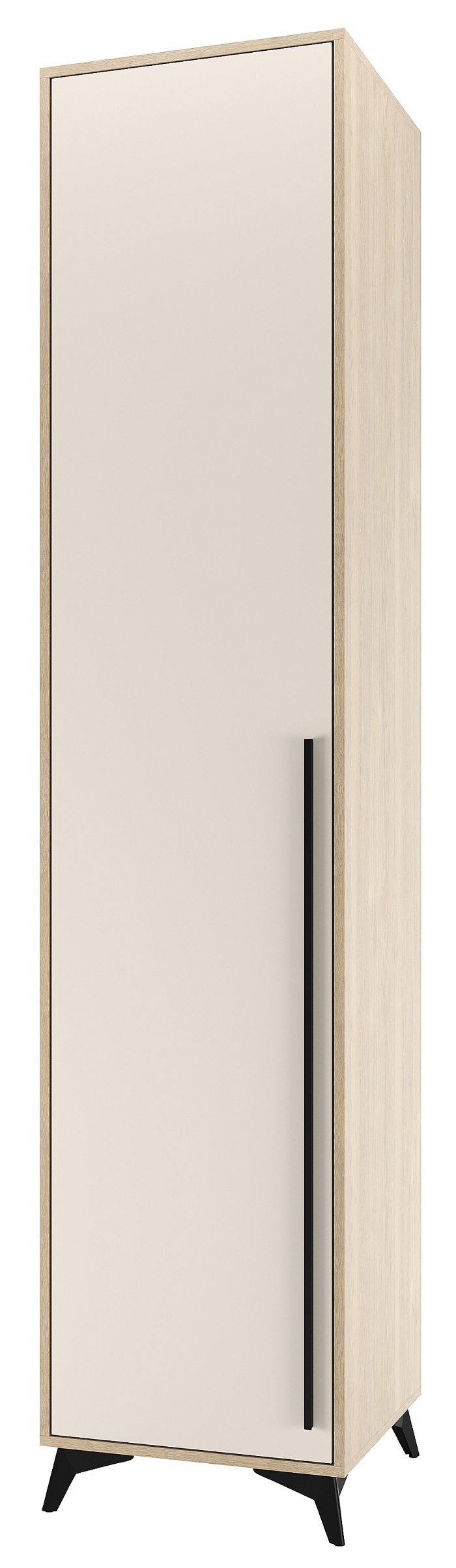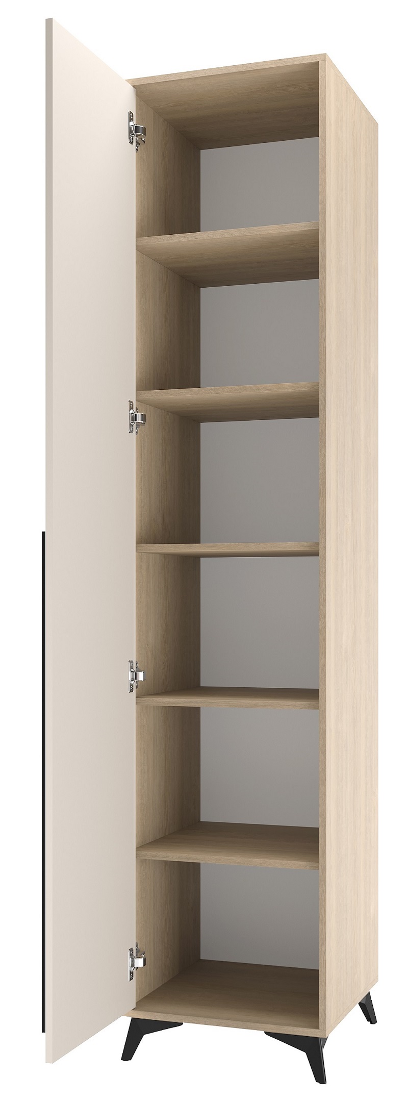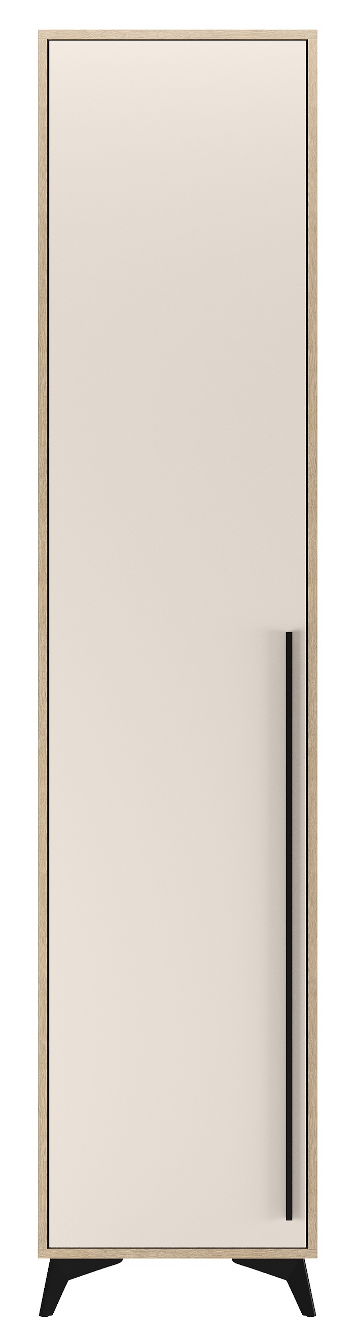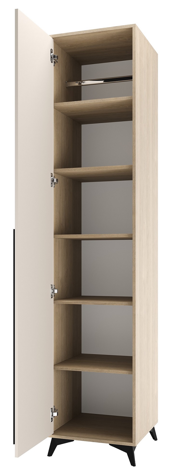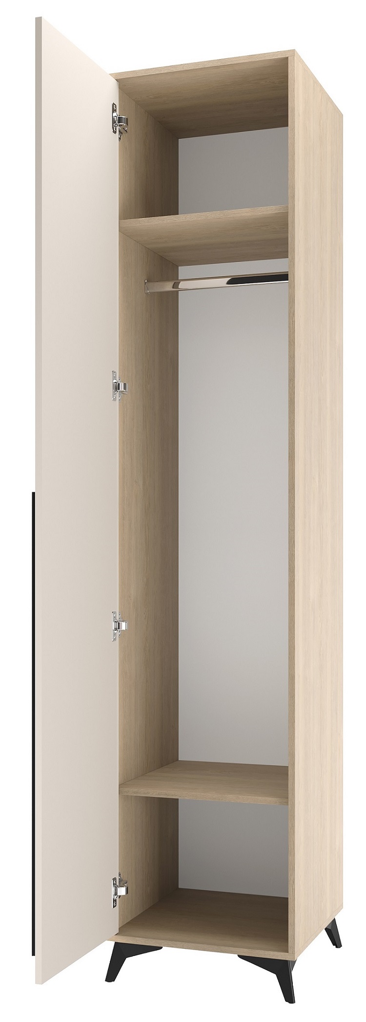 Пенал 480 1С «ЕВА» с полками и металлической штангой. Фасад и лицевой периметр пенала обработаны кромкой 1 мм. Чёрная металлическая ручка-рейлинг и ножки-опоры.