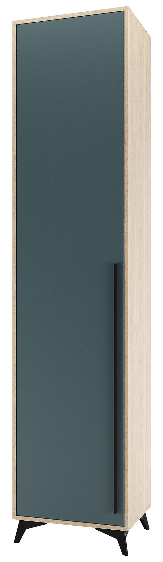Пенал 500 1С «ЕВА» с полками. Фасад и лицевой периметр пенала обработаны кромкой 1 мм. Чёрная металлическая ручка-рейлинг и ножки-опоры.