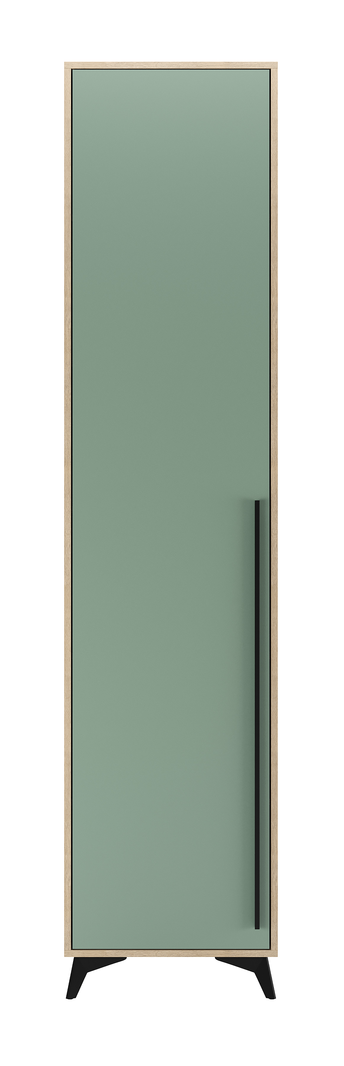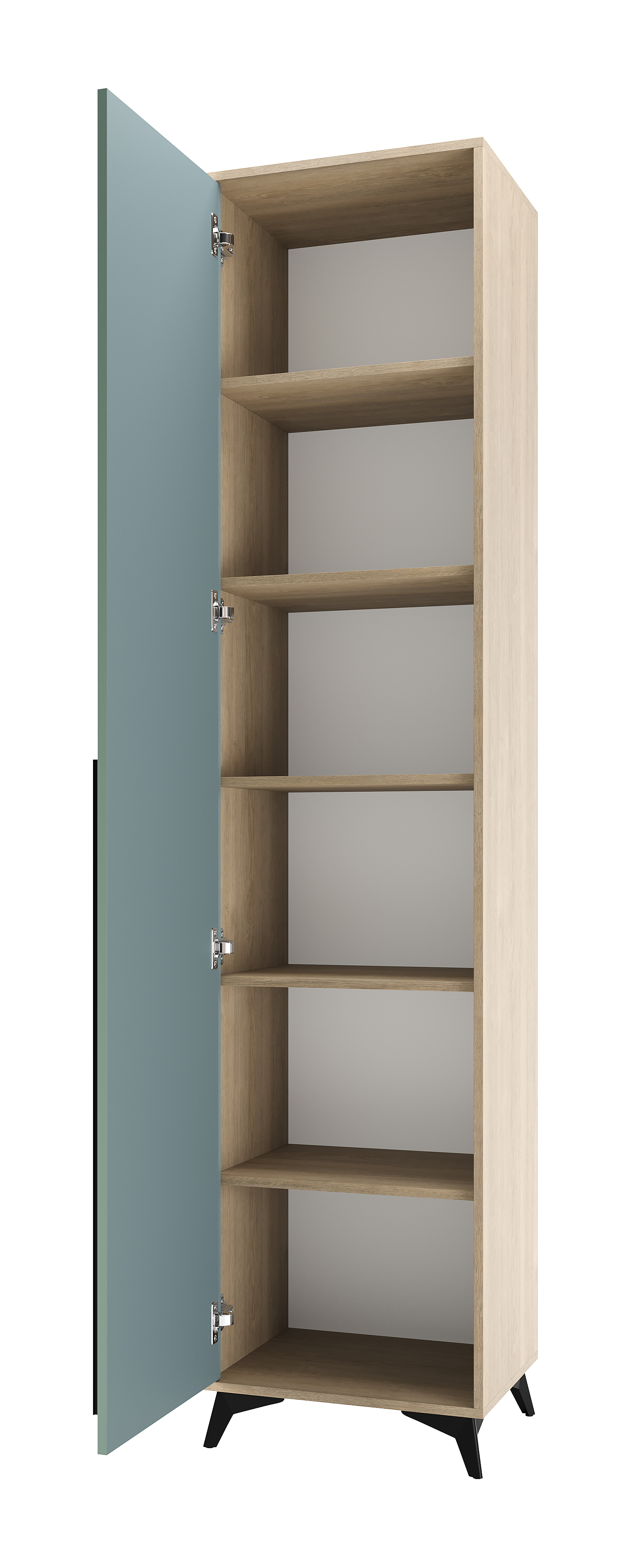 Пенал 500 1С «ЕВА» с полками. Фасад и лицевой периметр пенала обработаны кромкой 1 мм. Чёрная металлическая ручка-рейлинг и ножки-опоры.