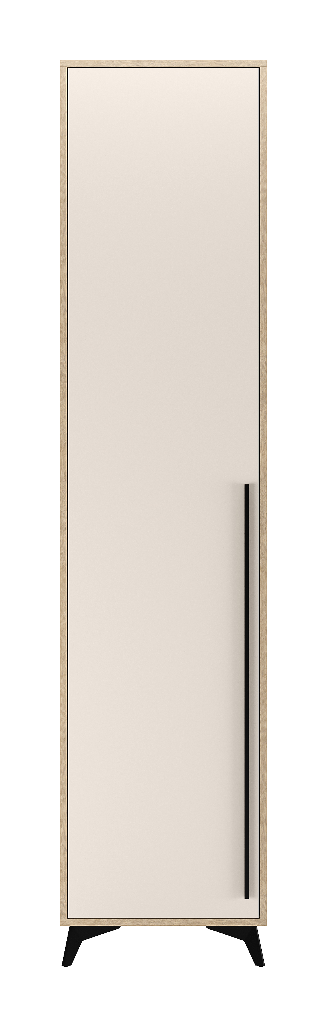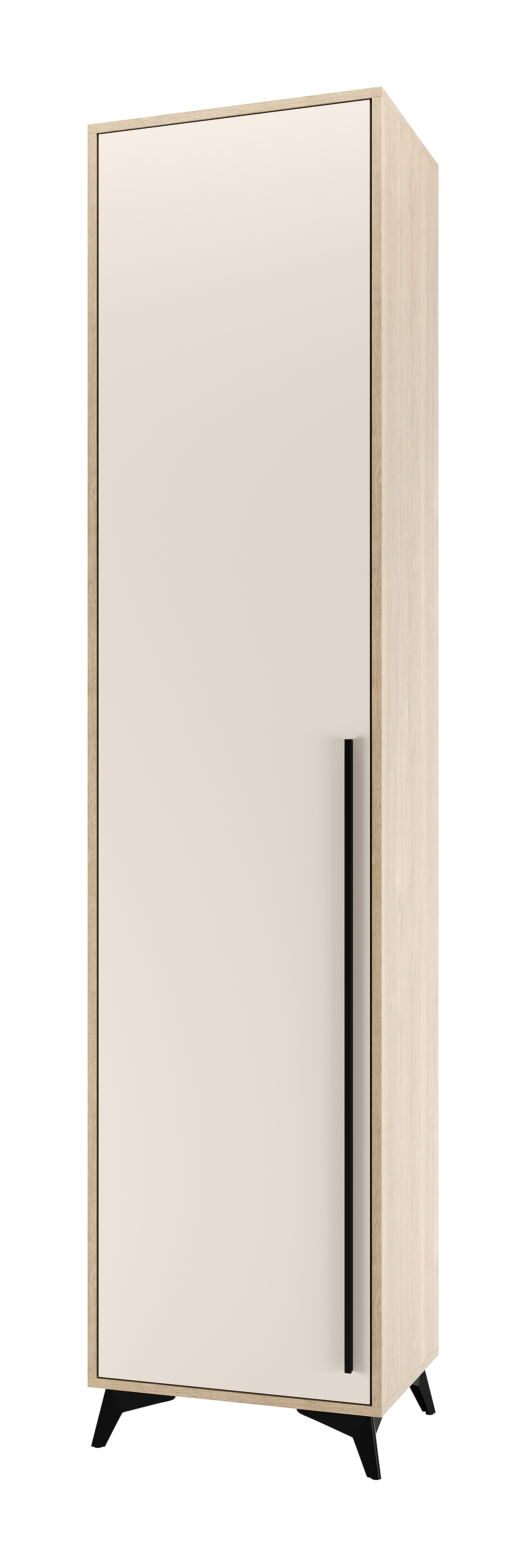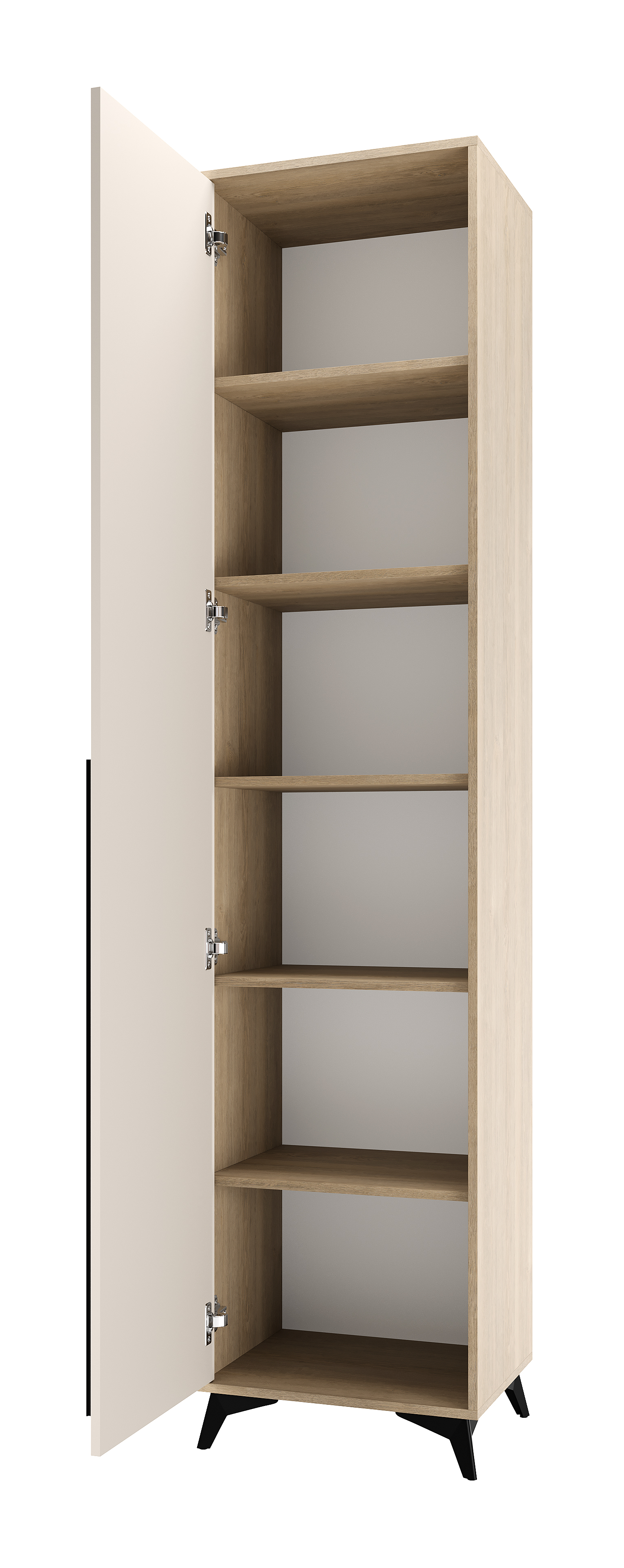 Пенал 500 1С «ЕВА» с полками. Фасад и лицевой периметр пенала обработаны кромкой 1 мм. Чёрная металлическая ручка-рейлинг и ножки-опоры.