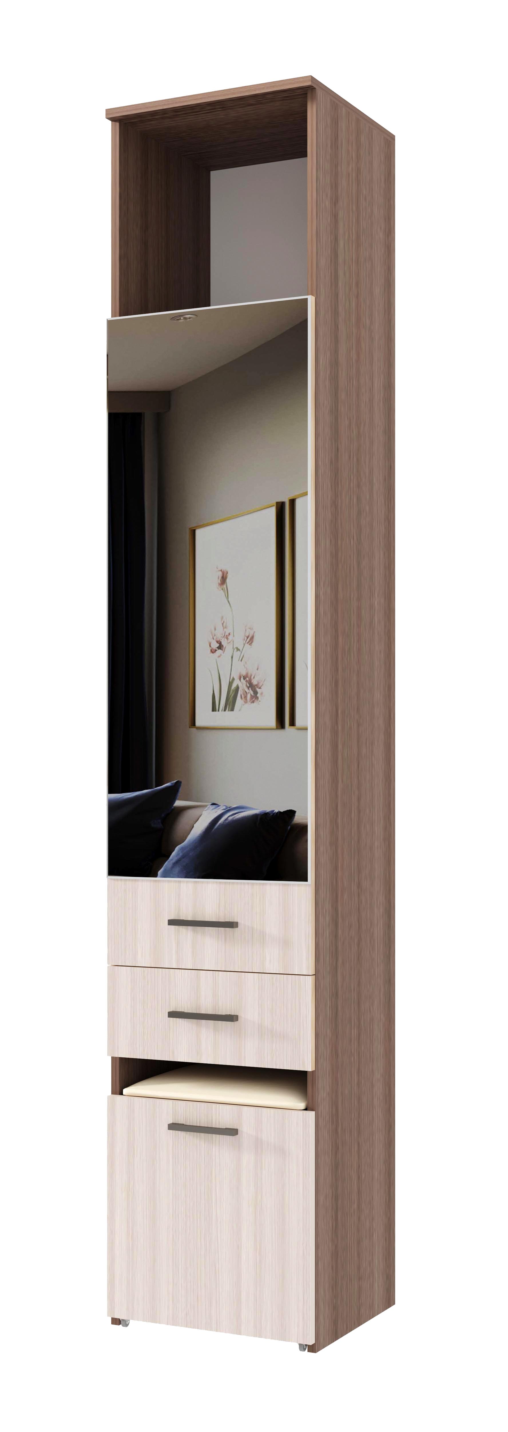 Пенал с выдвижным пуфом на колёсиках «ИТАЛИЯ» П1Я-400 одностворчатый с 4-мя полками и ящиком на роликовых направляющих. Пуф предназначен для хранения вещей, имеет откидную крышку с мяким сиденьем. Обработка зеркала «фацет» по периметру