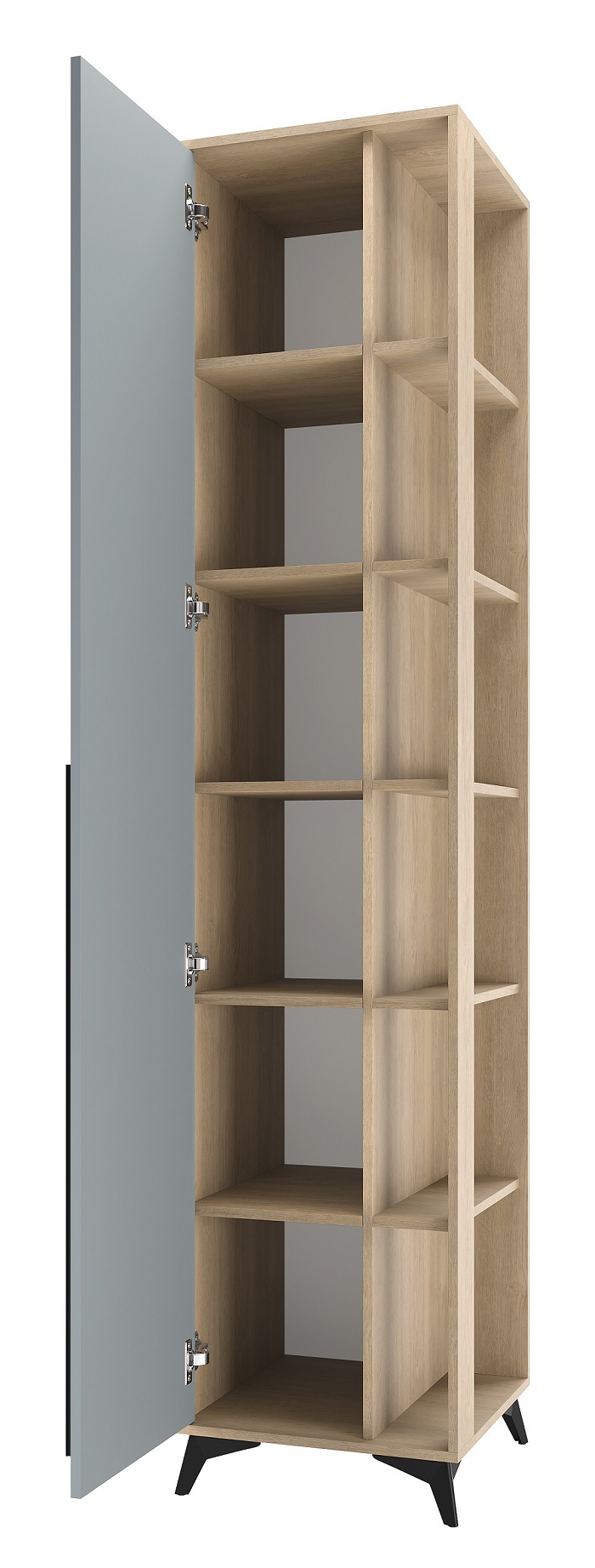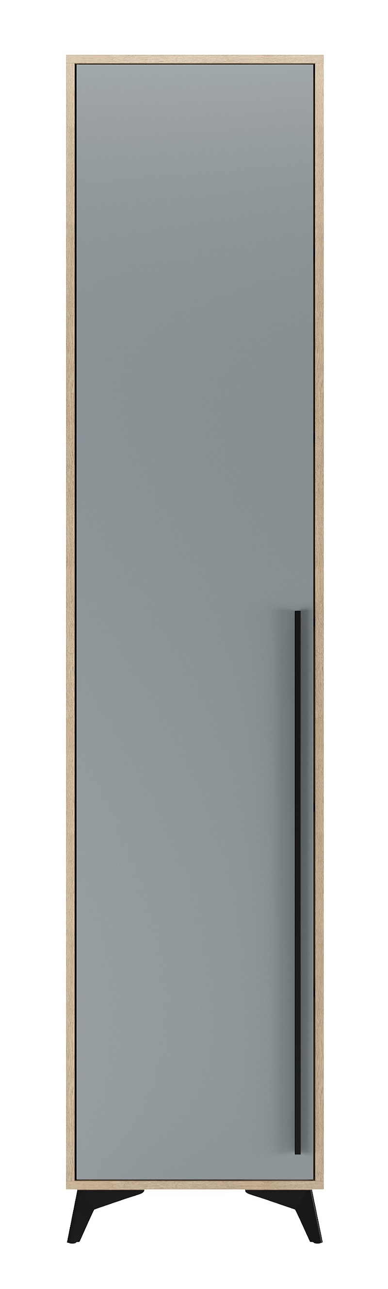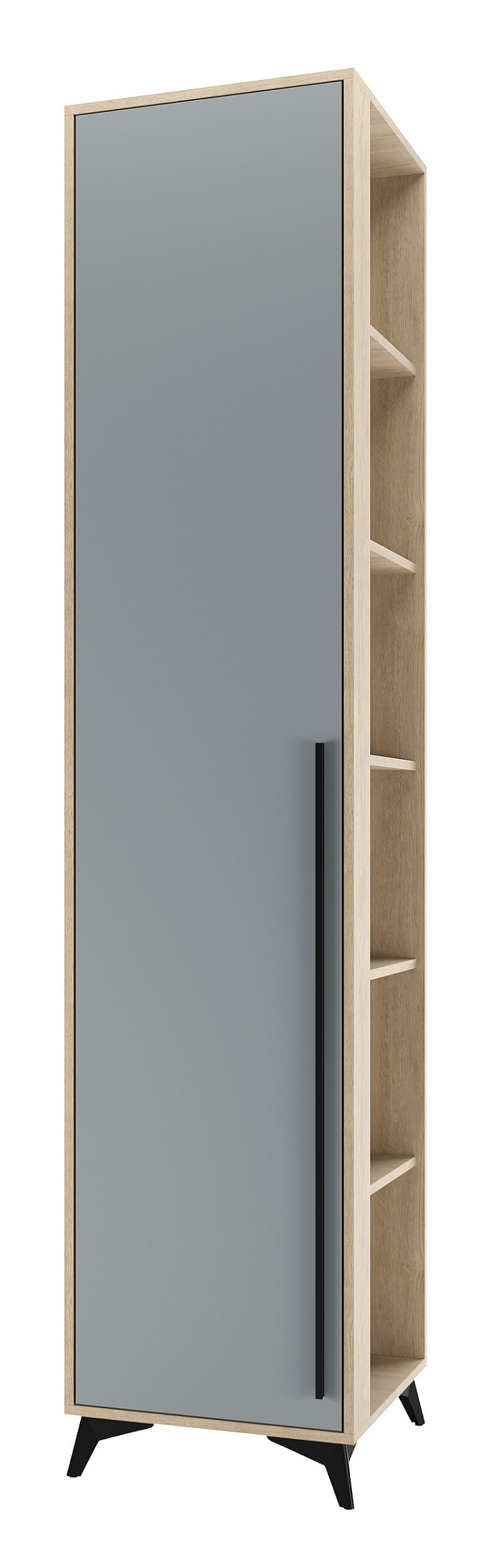 Пенал торцевой 480 1С «ЕВА» с полками. Фасад и лицевой периметр пенала обработаны кромкой 1 мм. Чёрная металлическая ручка-рейлинг и ножки-опоры.
