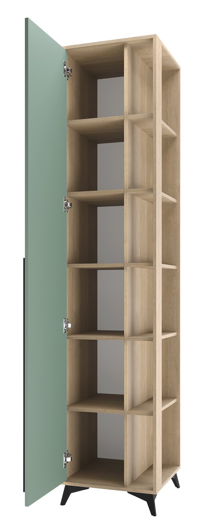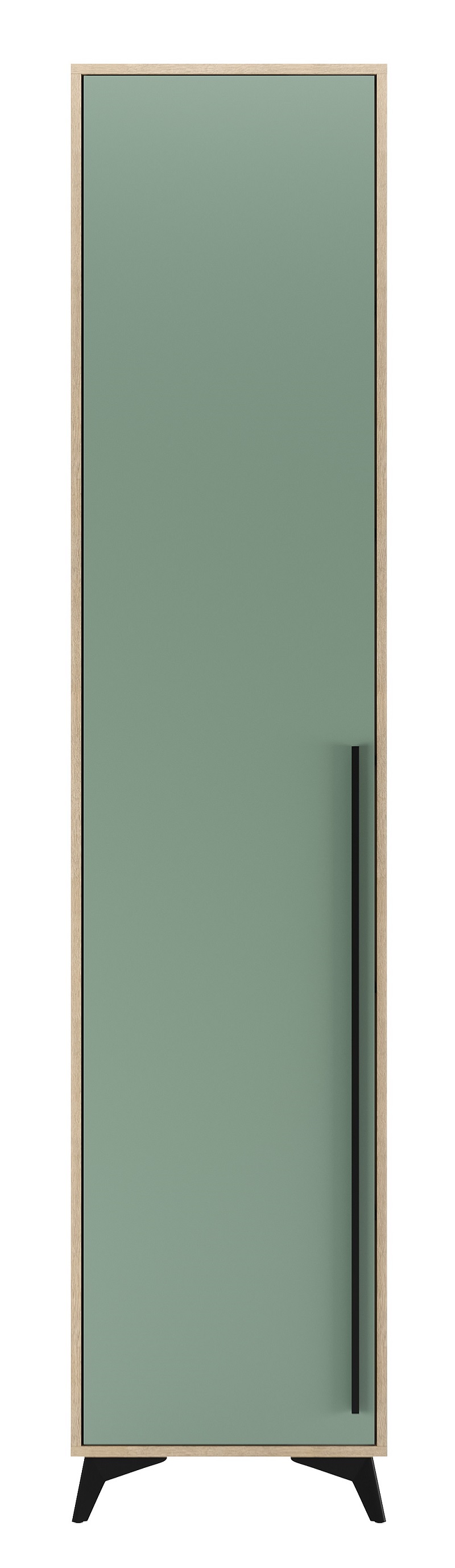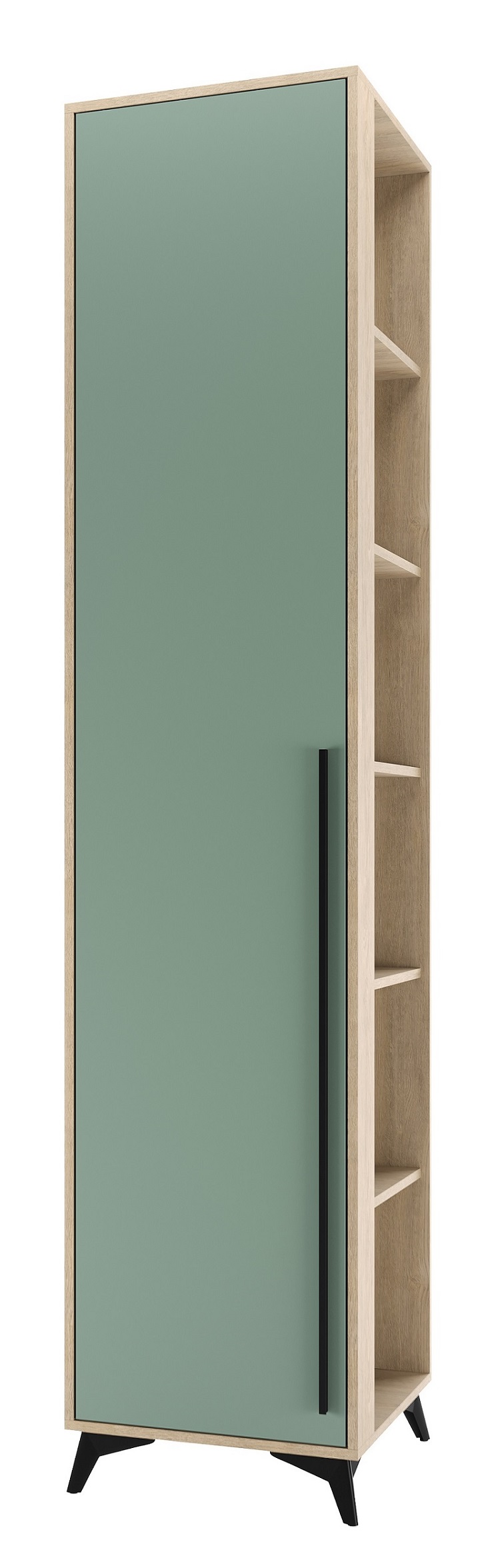 Пенал торцевой 480 1С «ЕВА» с полками. Фасад и лицевой периметр пенала обработаны кромкой 1 мм. Чёрная металлическая ручка-рейлинг и ножки-опоры.
