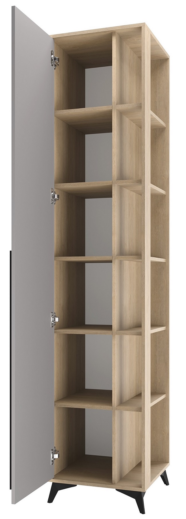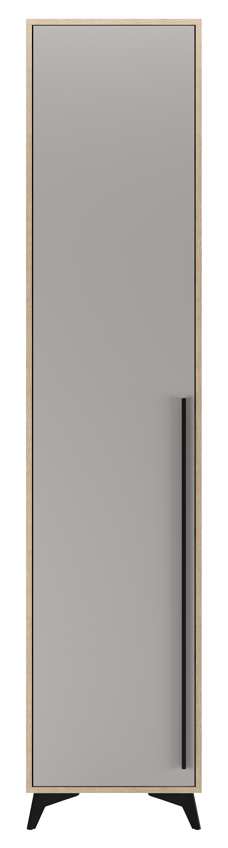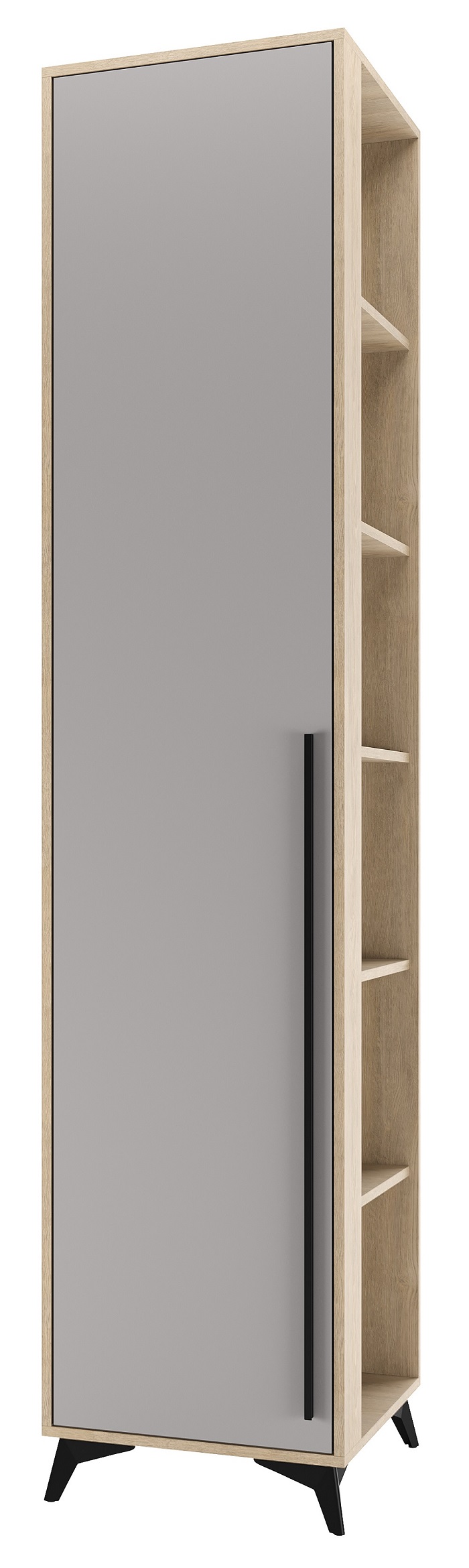 Пенал торцевой 480 1С «ЕВА» с полками. Фасад и лицевой периметр пенала обработаны кромкой 1 мм. Чёрная металлическая ручка-рейлинг и ножки-опоры.