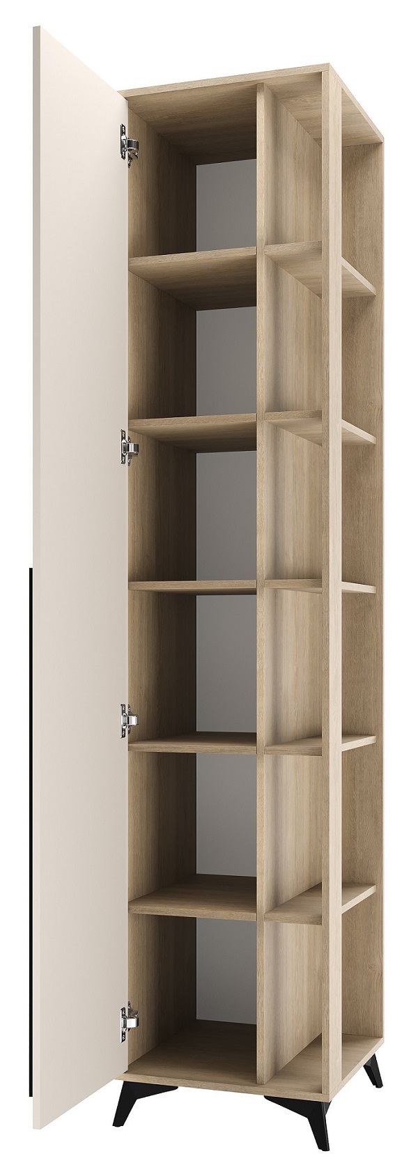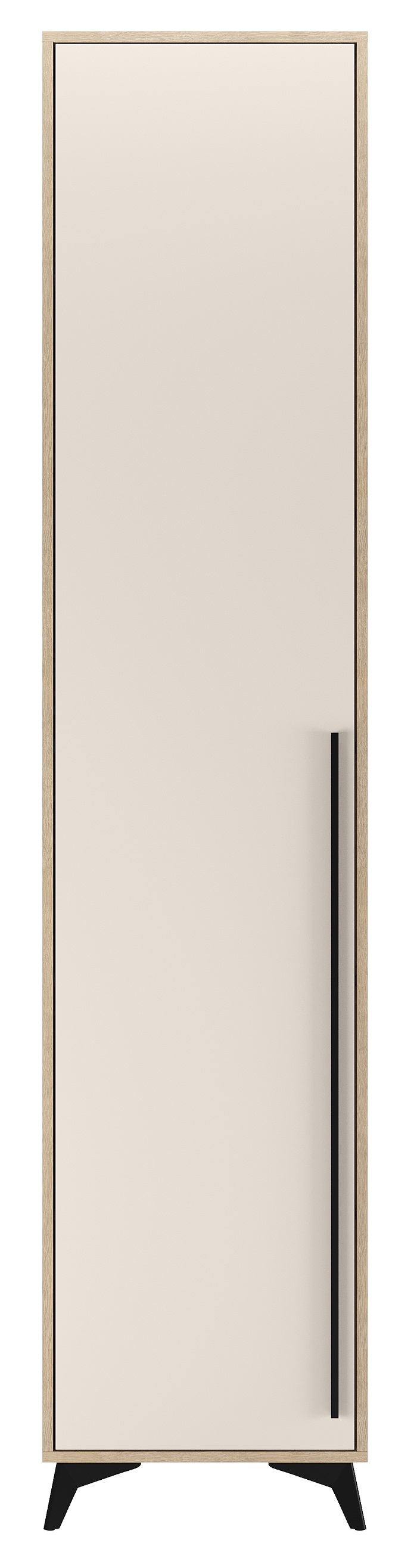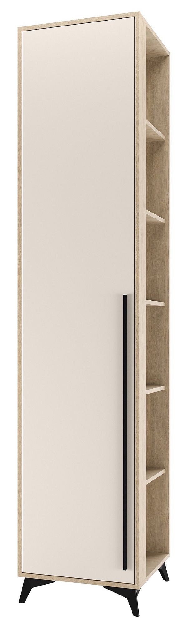 Пенал торцевой 480 1С «ЕВА» с полками. Фасад и лицевой периметр пенала обработаны кромкой 1 мм. Чёрная металлическая ручка-рейлинг и ножки-опоры.